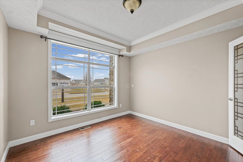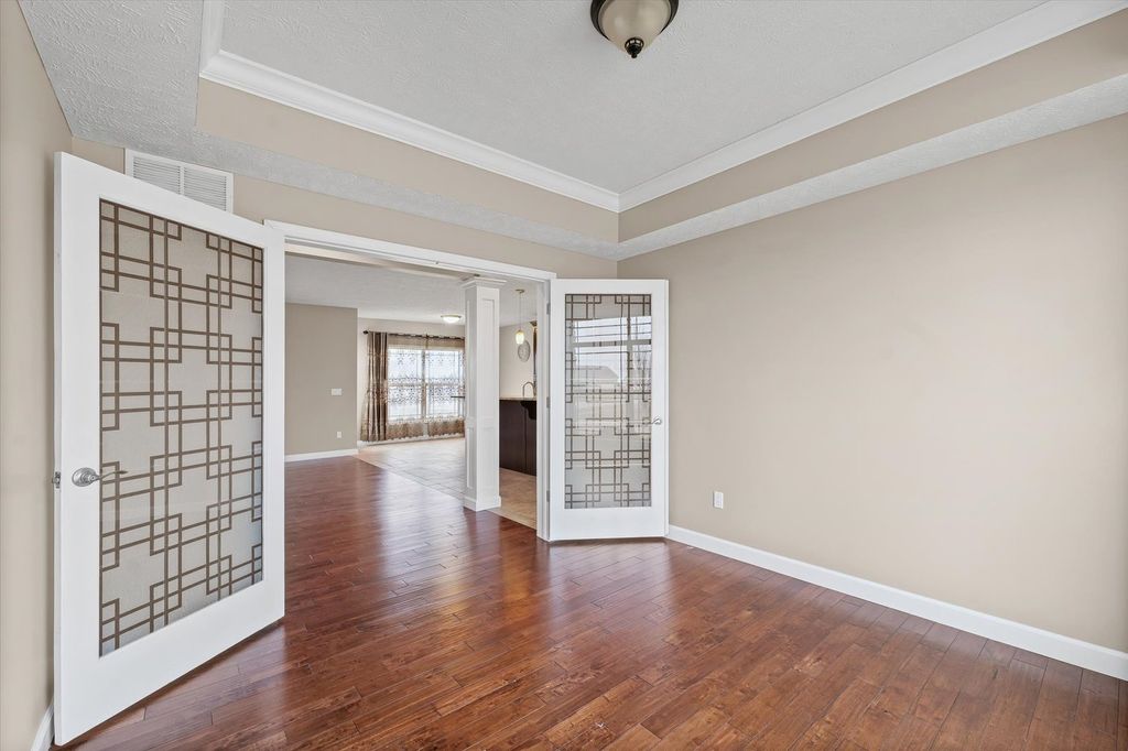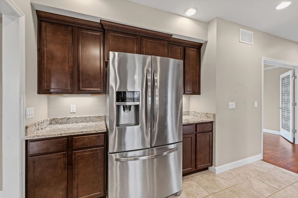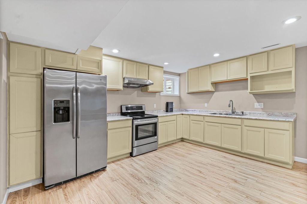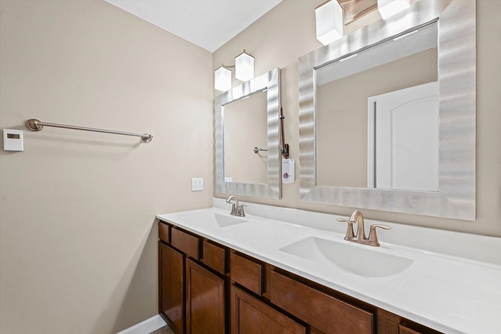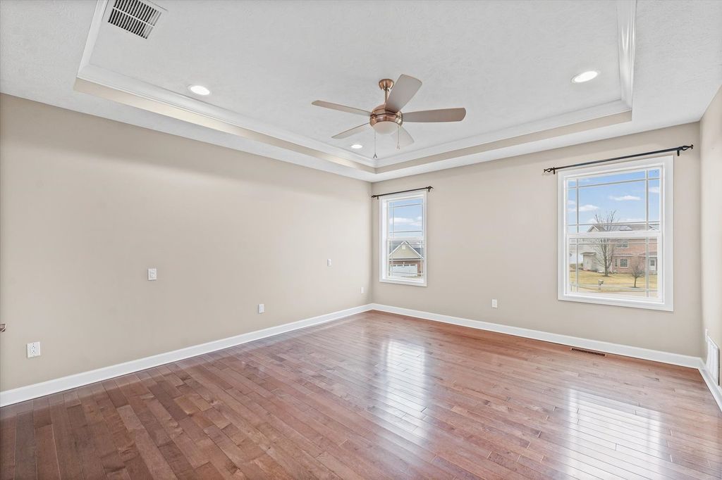 Positioned on a oversized corner lot in Liberty on the Lake Subdivision, this exceptional two-story residence blends refined comfort with modern convenience. Designed for both everyday living and effortless entertaining, the home features two full kitchens on the main level and basement-ideal for extended family living or hosting guests. Upstairs, four bedrooms showcase elegant engineered hardwood flooring, while both upper baths offer the indulgence of heated floors. The primary suite serves as a private retreat, complete with a spa-inspired soaking tub. Enhanced by a top-tier heating and cooling system, automated exterior lighting, and surround sound in both the living room and fully insulated, heated garage, this home delivers year-round comfort and sophistication. Freshly painted interiors and a newly installed main-level dishwasher complete the list of recent improvements.