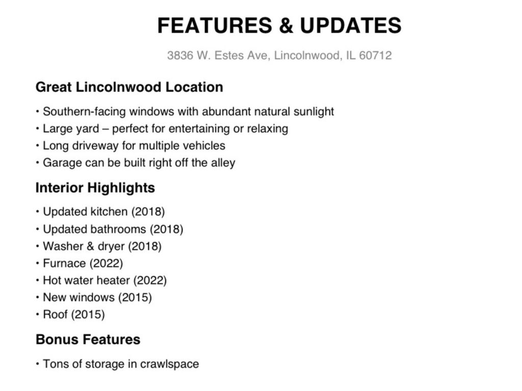 This solid brick split-level in a fantastic Lincolnwood neighborhood! This spacious 2007 sf home faces south, ensuring a bright, sun-filled interior, especially in the kitchen, living room, and dining room. The lovely kitchen (updated in 2018) features granite countertops, stainless steel appliances, and abundant cabinet storage. The lower level offers a wonderful family room that has views of the yard. Plenty of storage is available in the convenient and accessible crawlspace. This split-level design creates an open and connected entertaining space from the living room to the family room, connecting to the large grassy yard. Perfect for entertaining during July 4th or summertime. The fully fenced backyard includes a large patio, perfect for outdoor dining and relaxation, while a long driveway provides ample off-street parking. Recent updates include new thermopane windows, a 2022 furnace and hot water heater, and 2017-2018 upgrades to the washer/dryer and to the kitchens and baths. This home's fantastic Lincolnwood location places you near shopping, restaurants, Lincolnwood's great schools, library, Proesel park, tasty restaurants, and easy transportation options. A+