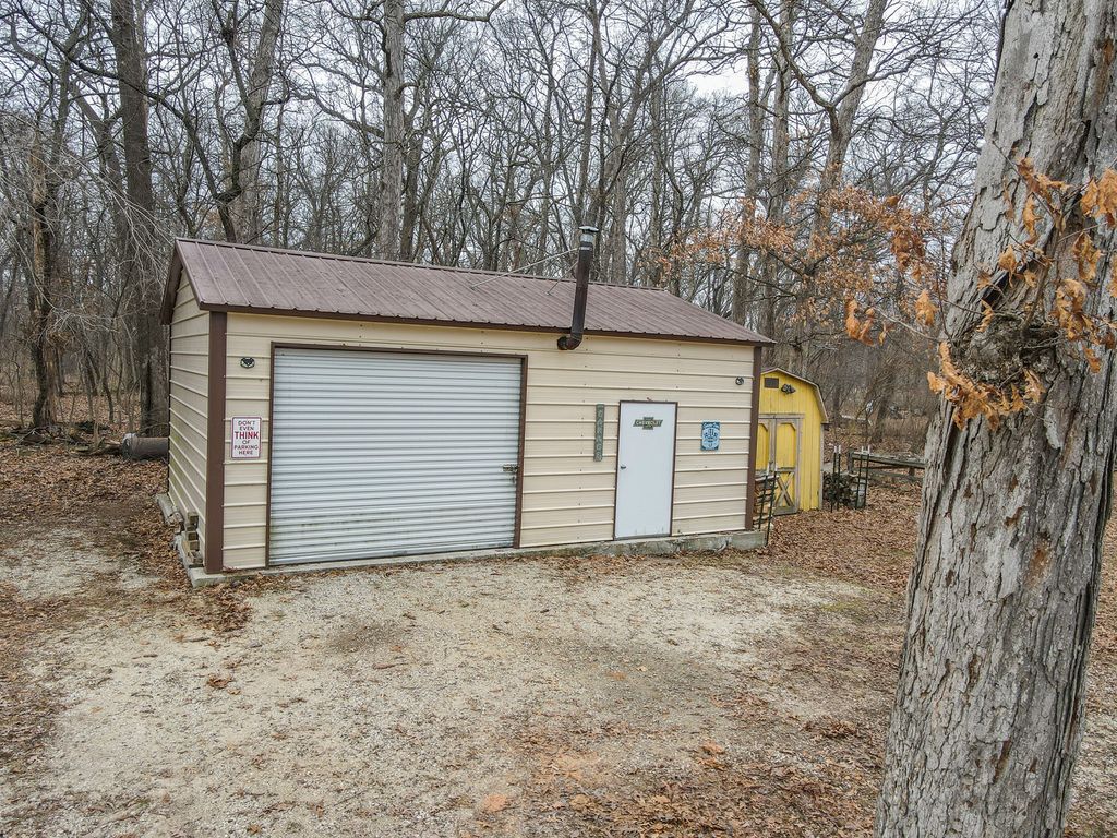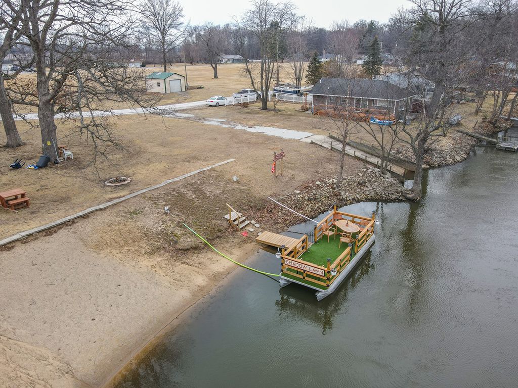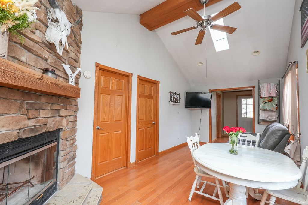 This one of a kind 3 bedroom, 1 bath home sits on an oversized lot and features an impressive 18x26 heated garage in Shadow Lawn. The fantastic layout, vaulted ceilings, and skylights create a bright, open feel throughout. You'll love the stunning floor-to-ceiling stone, wood-burning fireplace and oak hardwood floors. Additional highlights include vinyl windows and siding, oak trim, six-panel doors, tray ceilings, and a nice kitchen and bath. The third bedroom features a unique closet door from old St. Patrick's School, adding a touch of character and charm. Relax on the inviting front porch with porch swing and river views, or unwind in the backyard oasis complete with a hot tub, she shed, garden space, and nearby woods with walking trails. Plenty of storage is available in the garage and shed. Shadow Lawn residents enjoy water rights and river access, including a private beach, boat launch, wooded walking trails, and a 3-acre community lot. Not located in a flood plain - no flood insurance required. This home truly makes everyday living feel like a vacation!