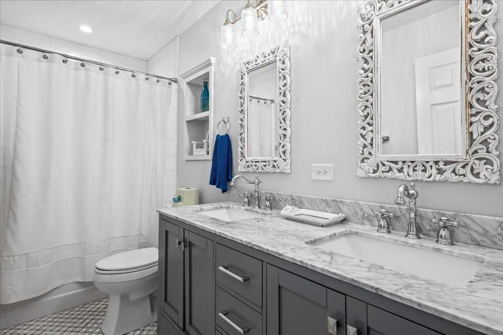 THIS IS THE ONE YOU HAVE BEEN WAITING FOR! Fabulous Colonial in coveted neighborhood that is completely remodeled from top to bottom! Gorgeous new cook's kitchen featuring white custom cabinetry, farm sink, quartz countertops, subway tile backsplash, Thermador appliances, Samsung refrigerator, wine cooler and a convenient eating area. Inviting family room with woodburning fireplace, cozy painted paneling, recessed lighting and a new slider to the patio and yard. A very spacious living room with hardwood floors offers a second space for entertaining or relaxing. Upstairs, there are 4 large bedrooms with generous closet space. The spacious primary bedroom is a sunny and private oasis with a walk in closet featuring California Closet systems, and a remodeled bath boasting a double sink vanity, quartz countertops, shower with built in bench, and designer tile. The hall bathroom has also been completely remodeled with a double sink vanity, marble countertop and floor and tub/shower. The newly remodeled full finished basement is amazing with so much space for many uses- a playroom, exercise room, media room, office, game room plus there is a finished storage room. Outside, the large backyard is completely fenced and has a new entertainment size patio and children's playset. Also new is the roof, Hardie board siding, gutters, downspouts, exterior doors including sliders, windows and more. The cul-de-sac location, great neighborhood, short walk to Shabonee Elementary School, sought after elementary school District 27 and Glenbrook North High School add even more to the appeal of this wonderful home. Simply move in and enjoy!
