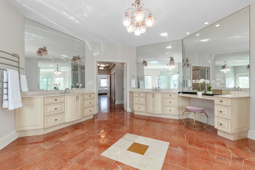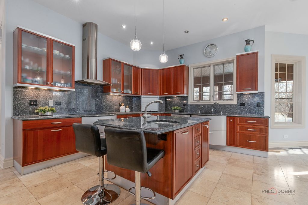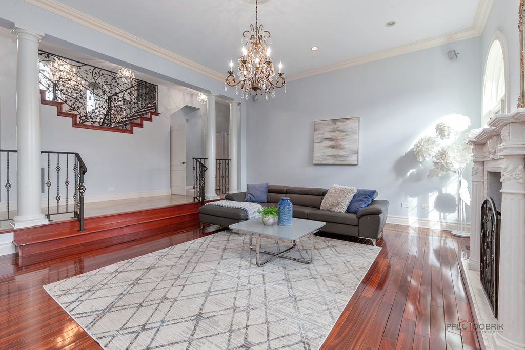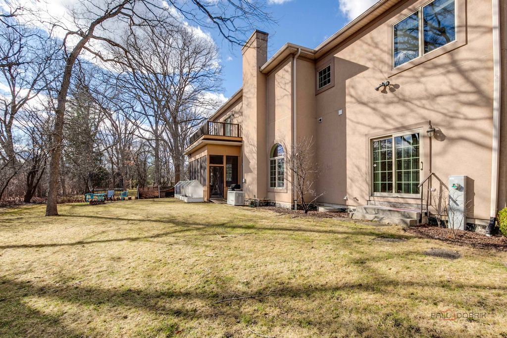 Welcome to this exceptional 6+1 bedroom, 6-bathroom corner-lot residence in prestigious Lincolnshire, proudly served by award-winning Adlai E. Stevenson High School and Laura B. Sprague School. A dramatic two-story foyer with a grand chandelier ceiling and elegant wrought-iron staircase creates a breathtaking first impression, complemented by full marble flooring throughout the main level. The thoughtfully designed layout offers both sophistication and comfort. To the right, the expansive great room seamlessly combines the living and dining areas-perfect for everyday living and effortless entertaining. The beautifully appointed kitchen features stainless steel appliances, granite countertops and backsplash, a spacious island with breakfast bar, and abundant cabinetry. The adjoining eating area opens directly to the screened-in porch, creating a seamless indoor-outdoor living experience. The impressive two-story family room showcases a stunning marble fireplace and additional access to the screened porch, framed by elegant white columns that enhance the architectural charm. A main-level bedroom with sliding glass doors to the backyard and a full bath provides flexibility for guests, in-laws, or a private home office. Upstairs, retreat to the luxurious primary suite offering three walk-in closets, a vaulted ceiling, and a spa-inspired ensuite with dual vanities, whirlpool tub, separate shower, and a private balcony with serene views. The second and fifth bedrooms each feature private en-suite baths, while the third and fourth bedrooms share a convenient Jack-and-Jill bathroom. A second-floor laundry room adds everyday convenience. The fully finished basement expands your living space with a seventh bedroom, full bath, and a large recreational area ready for endless possibilities-media room, fitness space, playroom, or more. This remarkable home blends elegance, space, and functionality in one of the area's most desirable communities-an exceptional opportunity to make your dream home a reality.