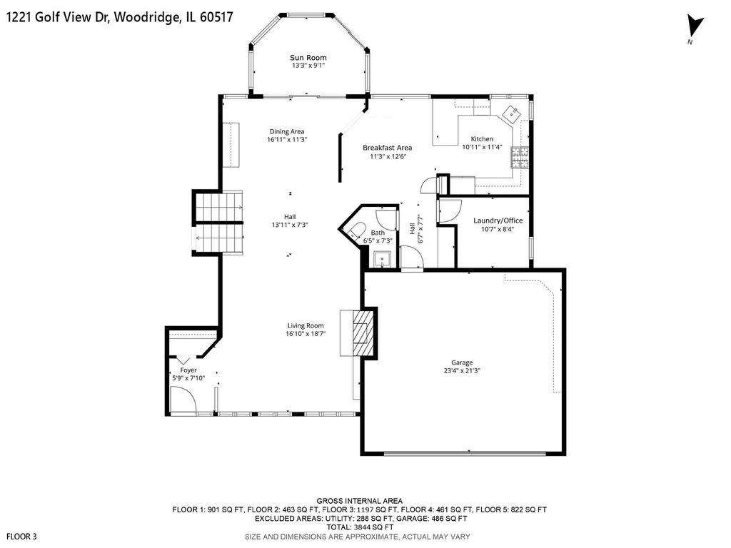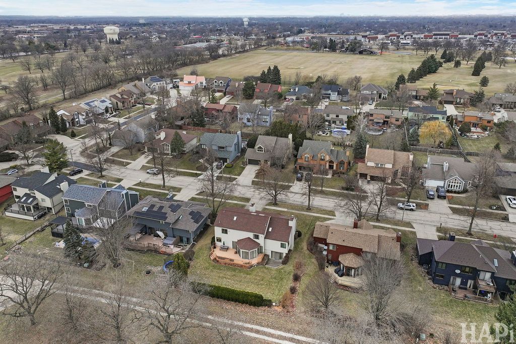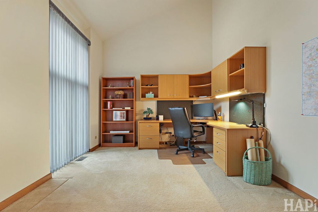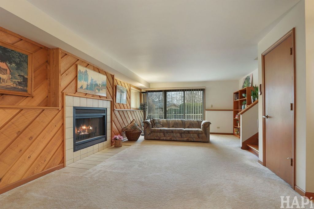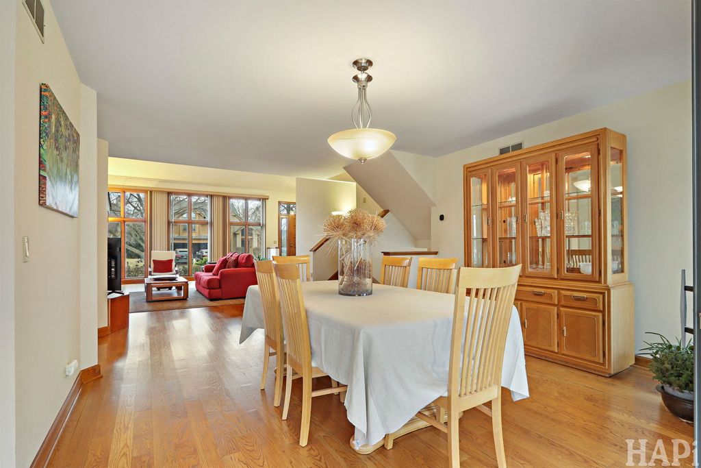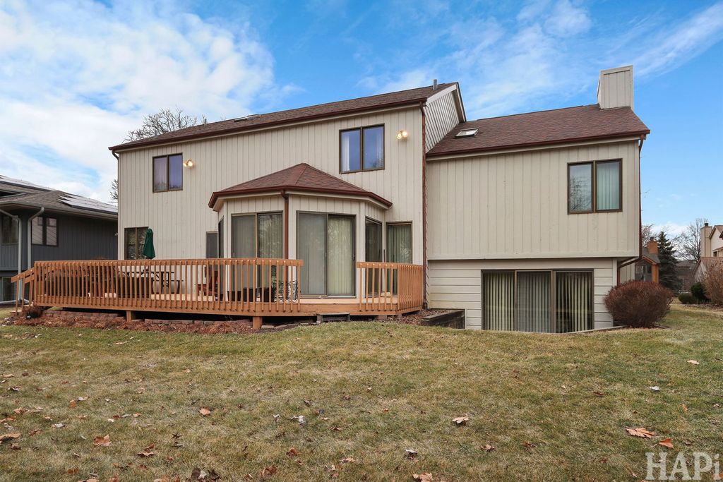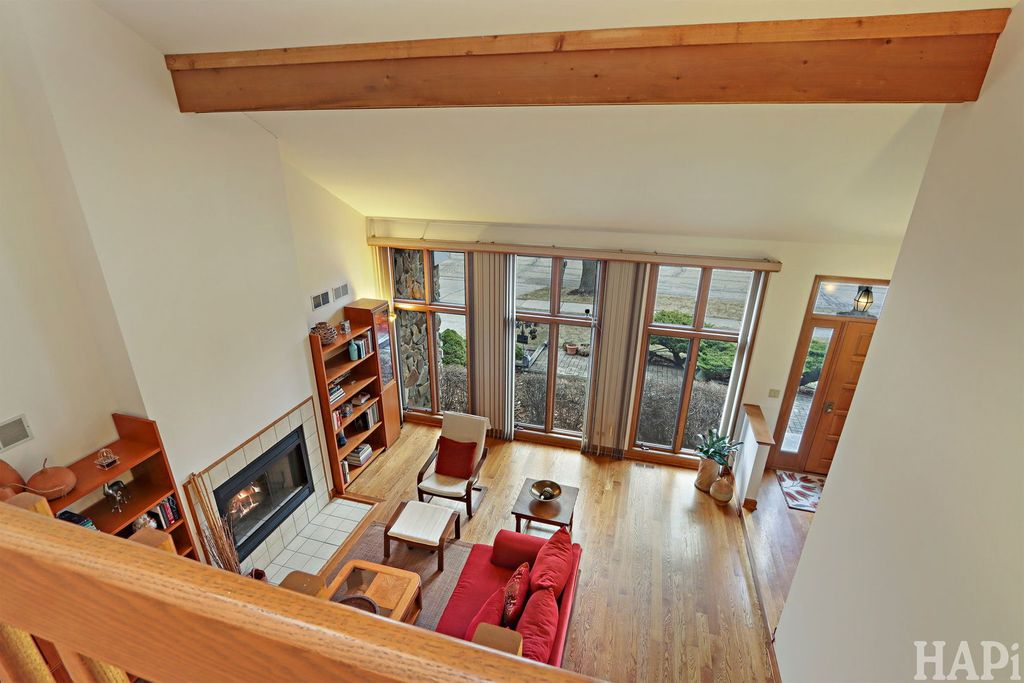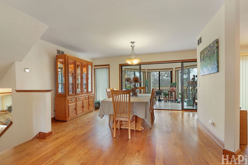 Don't Miss this architecturally striking contemporary home built by Airhart Construction! Soaring ceilings, dramatic windows, and over 3,800 square feet of thoughtfully designed living space, this 4-bedroom home offers architectural interest and exceptional flexibility in a prime Woodridge location. The main level welcomes you with a spacious foyer that opens to a light-filled living room featuring vaulted ceilings, expansive windows, and a fireplace that creates a warm focal point. The dining area flows seamlessly into the breakfast area and kitchen, creating an ideal setting for everyday living and entertaining. The kitchen features stainless steel appliances, granite countertops, and rich maple cabinetry with generous prep and storage space. Just beyond, a charming octagonal sunroom provides a peaceful retreat, filled with natural light and serene backyard views. A dedicated office located just off the kitchen offers excellent work-from-home convenience. Laundry hookups are already in place here, allowing buyers to convert this space into a main-level laundry room if desired. The upper level features an impressive primary suite measuring nearly 20' x 21' with vaulted ceilings and a skylight that fills the room with beautiful natural light. A large walk-in closet and a spacious primary bath with dual vanities, a soaking tub, and a separate shower complete the suite. One additional bedroom is located on this level. On the level below, two additional well-proportioned bedrooms and a full hall bath provide comfortable separation within the home's smart multi-level design. The walk-out family room (18'10" x 26'4") features a second fireplace and direct access to the backyard and deck, making it the perfect casual gathering space. The finished basement level expands the living space even further with an impressive 36' x 32' recreation room. A large utility/storage area includes the current laundry area and offers abundant additional space for storage, hobbies, or workshop needs. Outdoor living shines with a spacious elevated deck wrapping across the rear of the home, overlooking the open backyard bordered by mature landscaping. An oversized 2.5 car, almost 500 sq. ft. attached garage adds convenience. This beautifully maintained home combines 2x6 construction, architectural character, multiple fireplaces, flexible living spaces, and thoughtful design close to golf, parks, shopping, and commuter routes.