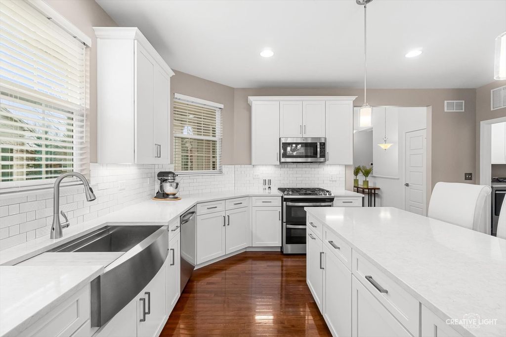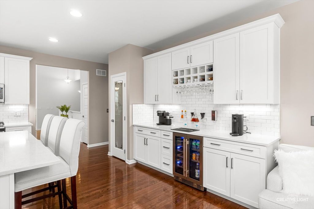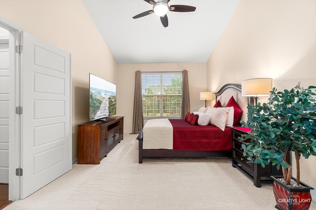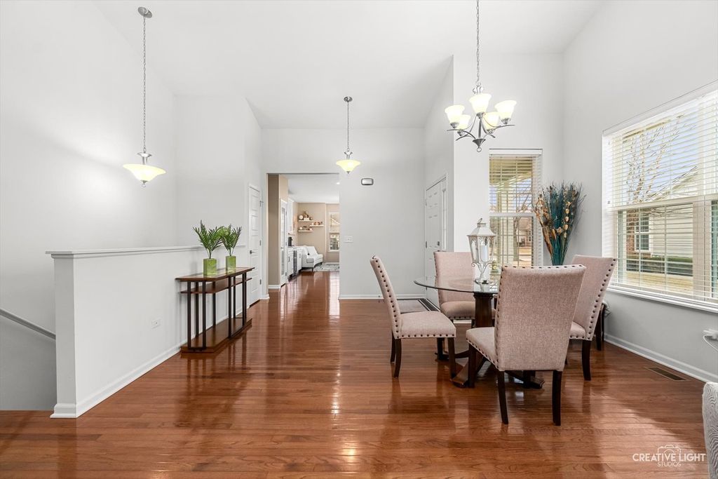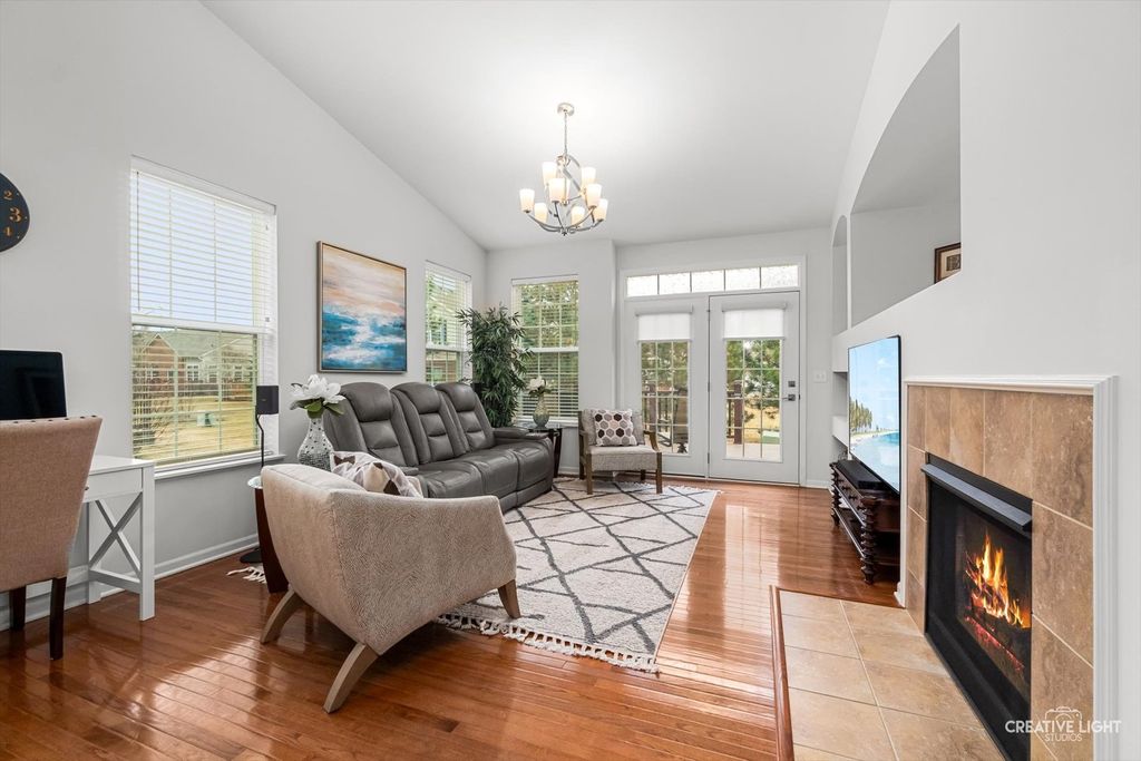 Welcome to Patriot Place! Experience maintenance-free living in this stunning, updated, ranch townhome nestled within one of the area's premier golf course communities. New finishes welcome you as you step in the door. From the new chandelier lighting to the new solid core doors and hardware, attention to detail can be found throughout. The completely remodeled (2023) kitchen is a true showstopper-thoughtfully designed with new soft-close cabinetry, textured tile backsplash, sleek stainless steel appliances and premium quartz countertops. A generous center island provides, abundant storage, large prep space and seating. Impressive additions include a frosted pantry door, dual zone wine refrigerator and coffee bar. A comfortable eat in area completes the kitchen offering a perfect setting for casual dining, additional workspace and everyday gatherings. Bathed in natural light, the open living and dining room blends comfort and style, featuring a built-in, easy switch fireplace for added ambiance. Classic french doors with custom blinds, lead to the new low maintenance trek deck-where you can unwind or entertain. Back inside, the primary suite offers a peaceful retreat featuring a beautifully appointed ensuite bath with double vanity, soaking tub and separate shower. The spacious walk in closet has been enhanced with a new organizational system designed to keep everything effortlessly in its place. A secondary bedroom offers versatility for guests or workspace needs, paired with a nearby full bath for added convenience. The main floor laundry/mudroom is perfectly positioned off the garage for seamless entry, complete with newer washer/dryer and bead-board accent that adds character to your daily routine. Modern ease has been integrated with a Nest Smart home thermostat and upgraded myQsmart garage door opener. The finished basement expands your living space with an open layout that offers endless possibilities, along with an additional bedroom and full bath. Furthering the lower level is a storage/utility room with new water heater-providing an ample storage space while maintaining the efficient home systems. Please be sure to find our feature sheet listing all of the many impressive details that take this home beyond builder-grade to a refined living experience. Located off the Bolingbrook Golf Course, with easy access to interstate, shopping and dining options, this home feeds into Plainfield School district 202 and is ready for you to enjoy!