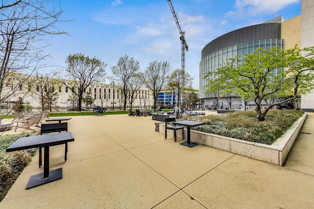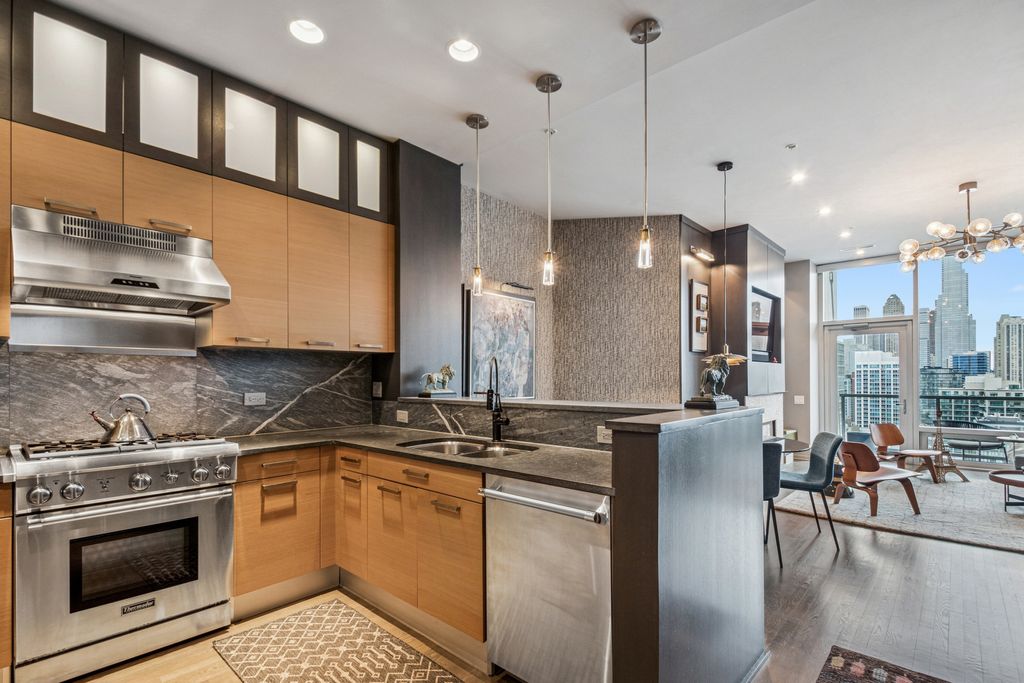 This stunning home at the iconic Minoru Yamasaki-designed "Montgomery" is a 2BR 2BA condominium in the quieter section of River North. The Unit boasts a rare and exclusive East-facing balcony with breathtaking skyline views at sunrise and sunset, visible through floor-to-ceiling windows. This unit has been extensively renovated and professionally designed. White oak floors grace the beautiful space and lead to a custom-designed media wall, gas fireplace, and TV niche with Sonos speakers. Warm, custom lighting illuminates the home, welcoming you after a long day of enjoying the heart of River North. The exquisitely renovated kitchen charms with sleek soapstone countertops and backsplash, custom cabinets, stainless steel Thermador appliances and hood, and a wood-paneled fridge. A custom bar and wine fridge, tastefully hidden in a stylish cabinet, punctuates this chef's kitchen. The spacious primary suite features two walk-in closets and a stunning floor to ceiling built-in wardrobe, along with a luxurious spa-like bath with a six foot soaking tub, separate shower, double vanity and large linen closet. A guest bedroom and bath complete this elegant Unit, along with more than ample custom closets and storage. There are absolutely NO common shared walls, creating a quiet and private living space. The Unit includes TWO parking spaces on the most desirable Level 2 of the heated garage! The "Montgomery" is an extremely well managed building with substantial reserves. In addition to the roof-top space, spectacular for viewing July 4 fireworks and the Air and Water Show, owners can enjoy the "North Lawn" outfitted with lounge areas, table seating, fire pits, and BBQ grills. Assessments include owner-controlled heat and air conditioning, cable TV and all but a small monthly electric bill. Visit this warm and inviting home in close proximity and with easy access to everything the City has to offer!