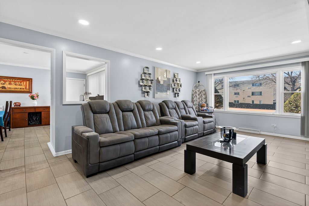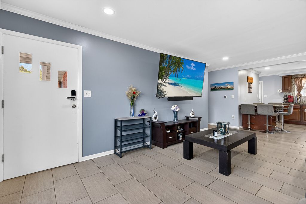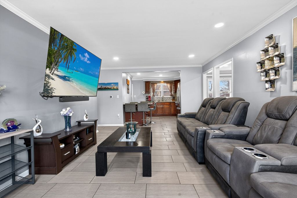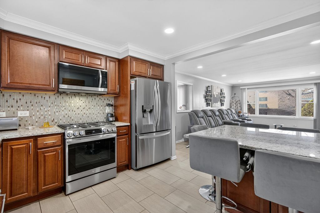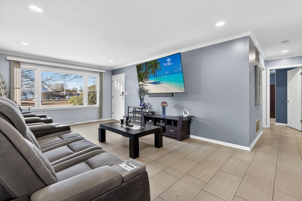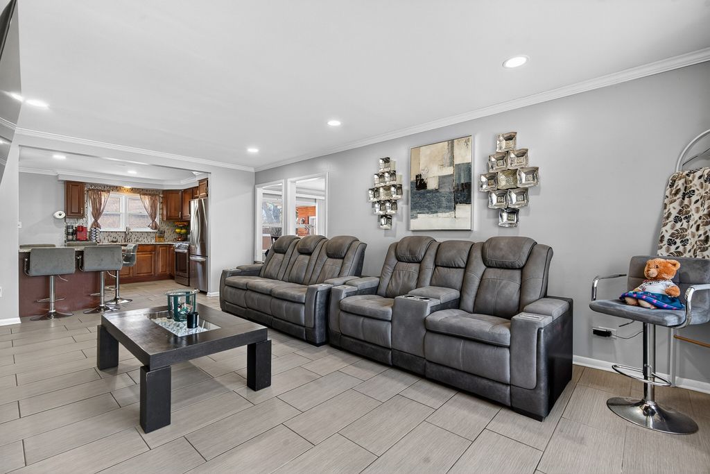 Beautifully updated all-brick ranch with modern upgrades throughout and exceptional functionality inside and out. This thoughtfully renovated home features an open-concept layout created by opening interior walls, offering seamless flow between the main living space and dining area. Recessed lighting, crown molding, and tile flooring throughout elevate the home with a clean, contemporary feel. The fully updated kitchen is a true highlight, featuring granite countertops, a island with storage, custom cabinetry, stainless steel appliances, updated sink and fixtures perfect for everyday living and entertaining. Major improvements include a new roof, privacy fence, custom-built shed, and custom garage shelving for optimal storage. The finished basement expands your living space with a newly added full bathroom, an additional finished room ideal for an office, workout room, or guest bedroom, and versatile entertaining space. The updated bathroom with whirlpool tub adds a spa-like retreat, and the pride of ownership is evident in every detail. Located near parks, schools, train station, and convenient amenities, this move-in-ready home combines modern upgrades with classic all-brick durability. A rare opportunity offering space, style, and functionality all in one.
