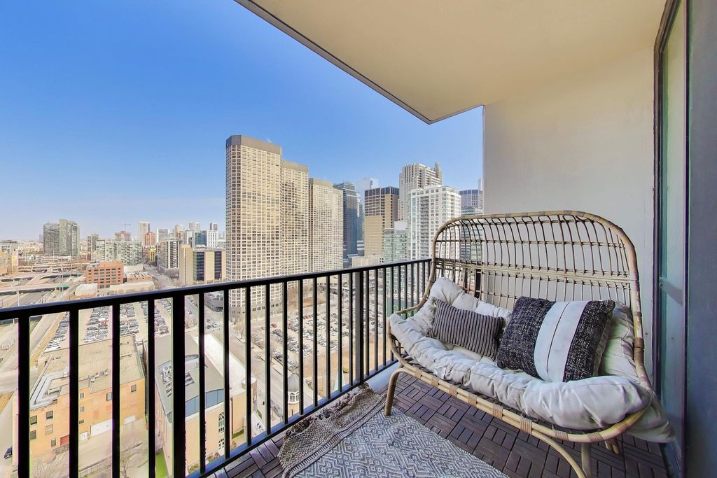 Welcome to this meticulously renovated 2 bed / 2 bath condo in Chicago's premier West Loop neighborhood, showcasing high-end, premium materials and elevated designer finishes far beyond the typical renovation, with sweeping city views and floor-to-ceiling windows. This upper-level residence features wide-plank premium white oak hardwood flooring throughout and a private balcony ideal for entertaining. The designer kitchen showcases a stainless steel appliance suite with double oven and gas range, Taj Mahal quartzite countertops, waterfall island, marble backsplash, pantry, and soft-close cabinetry. Both bathrooms have been elegantly updated. The primary bath offers travertine stone, heated bidet toilet, anti-fog mirror, and new vanity. The secondary bath features striking basalt tile and modern finishes. All with the added convenience of in-unit laundry. Deeded garage parking available for $25,000. Assessments include heat, A/C, and cable - everything except electricity. Full-service building with 24/7 door staff, fitness center, community room, storage, bike room, and dog run. Prime West Loop location near Union Station, Ogilvie, CTA Blue Line, Fulton Market, Restaurant Row, and Mary Bartelme Park.