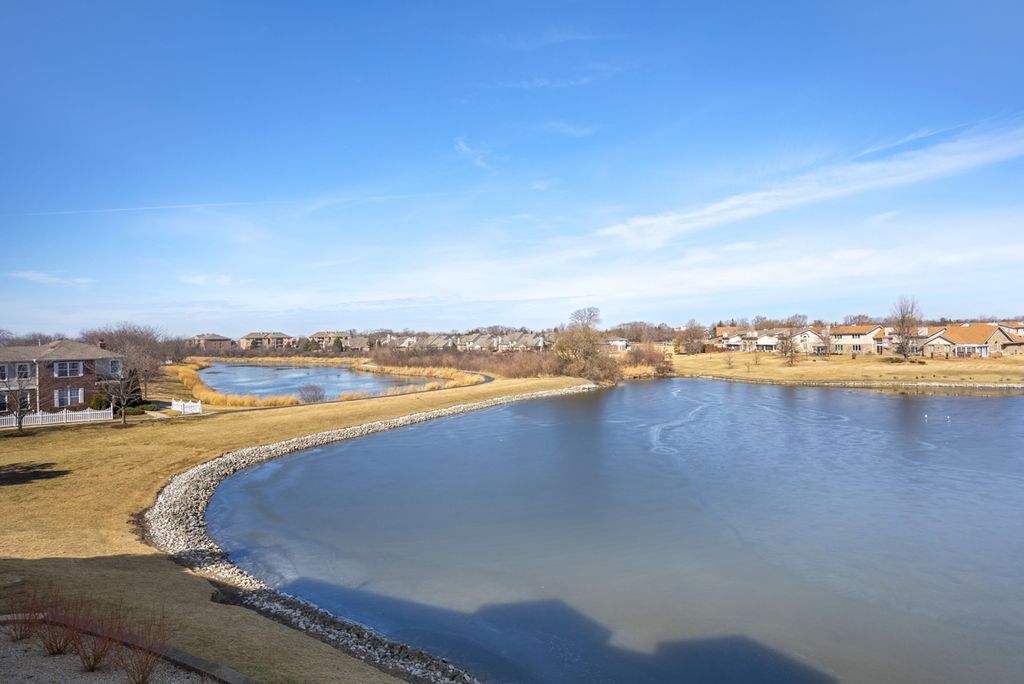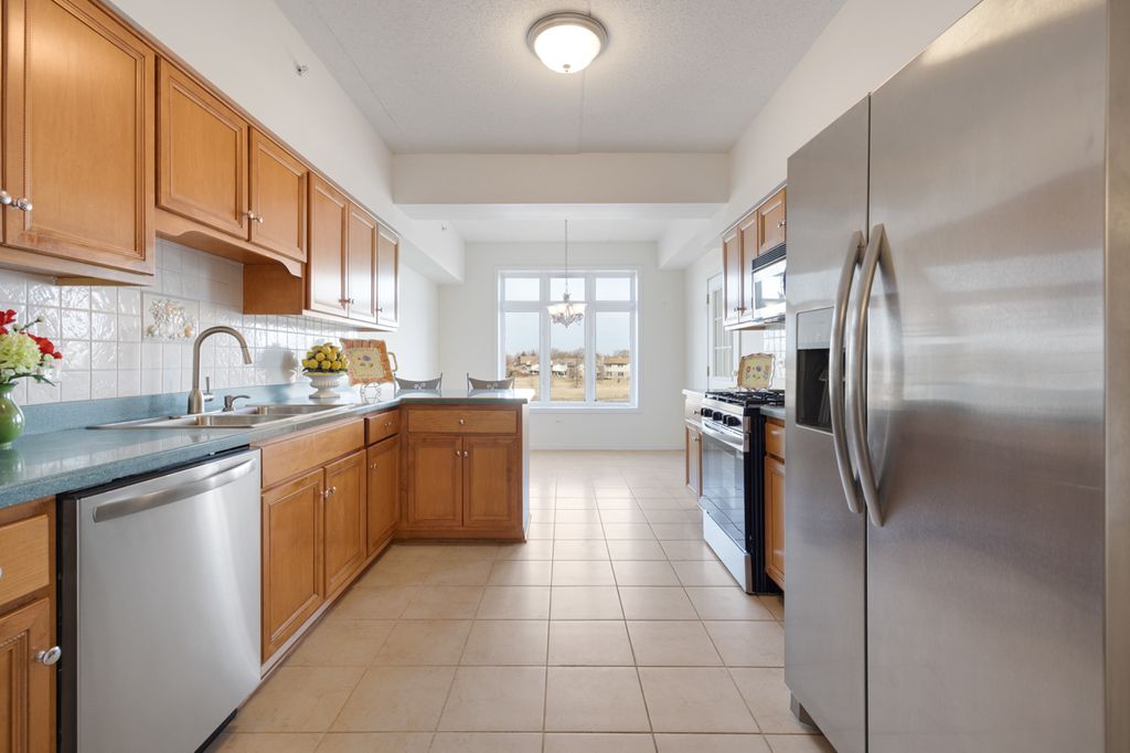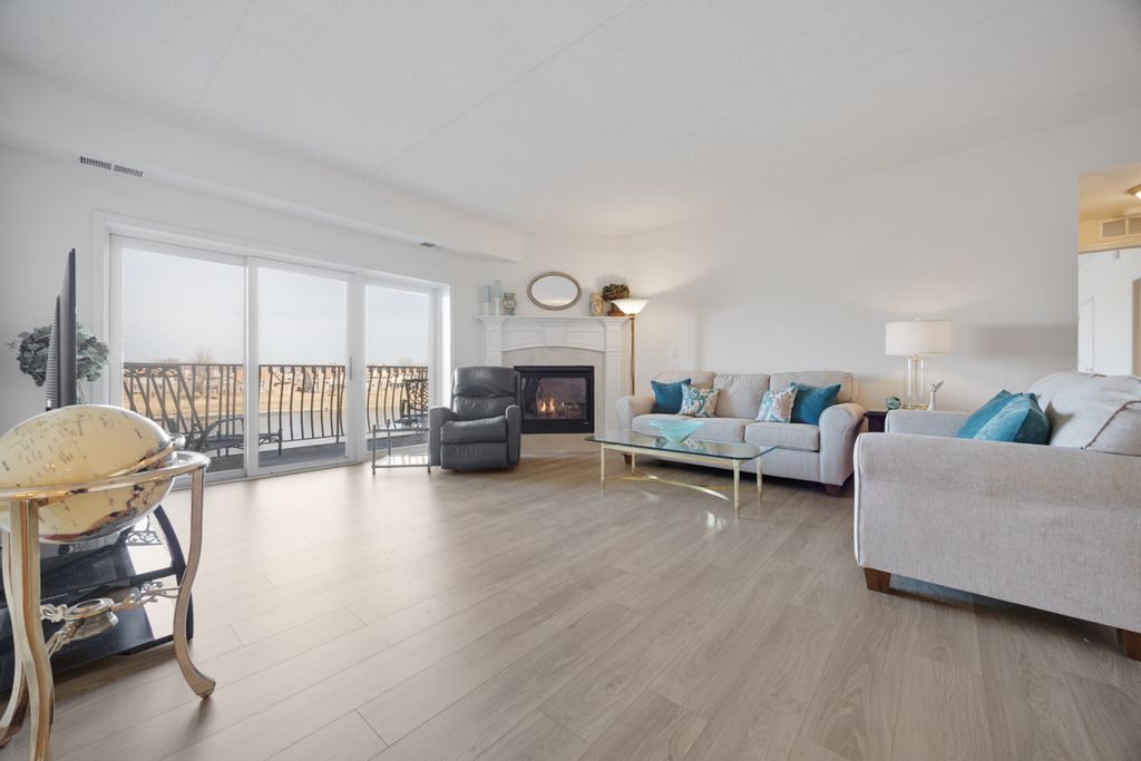 Fabulous 2 bedroom, 2 bath ELEVATOR BUILDING condominium on the lake in The Pines! Amazing views from every window! Other features include open tile floor entry! Spacious living room with new LTV flooring, custom fireplace and slider door out to the balcony overlooking the lake! Large kitchen includes stainless steel appliances (2025), stainless sink, ceramic backsplash, maple cabinets, eating area with oversized 3 panel window + transoms with stunning lake views and service door to the balcony! Formal dining room with new vinyl flooring! Large primary bedroom features walk in closet, ceiling fan and windows overlooking the lake! Primary bath suite includes whirlpool tub and separate shower! Bedroom (2) is spacious with windows over looking the lake! Additional full bath with raised vanity and maple cabinets! Large laundry room with washer and dryer (2024) and laundry sink! White (6) panel doors and trim! Flexicore ceiling! Interior fire sprinklers! Underground heated parking and additional exterior parking! This is a 55 and over community. 10+!