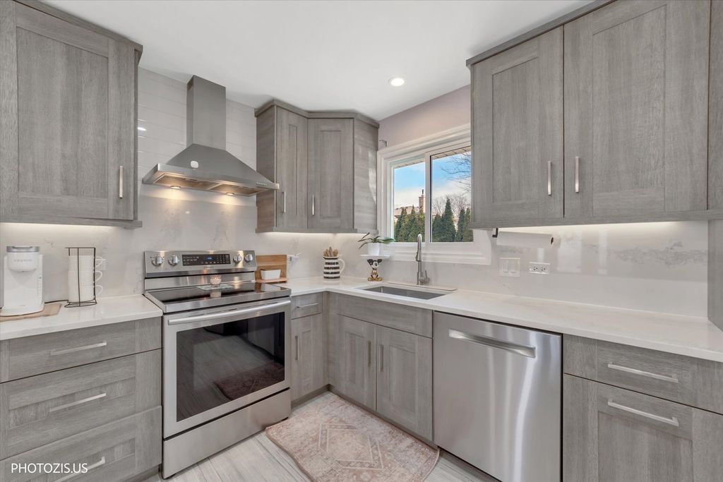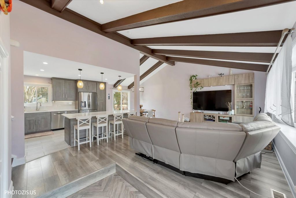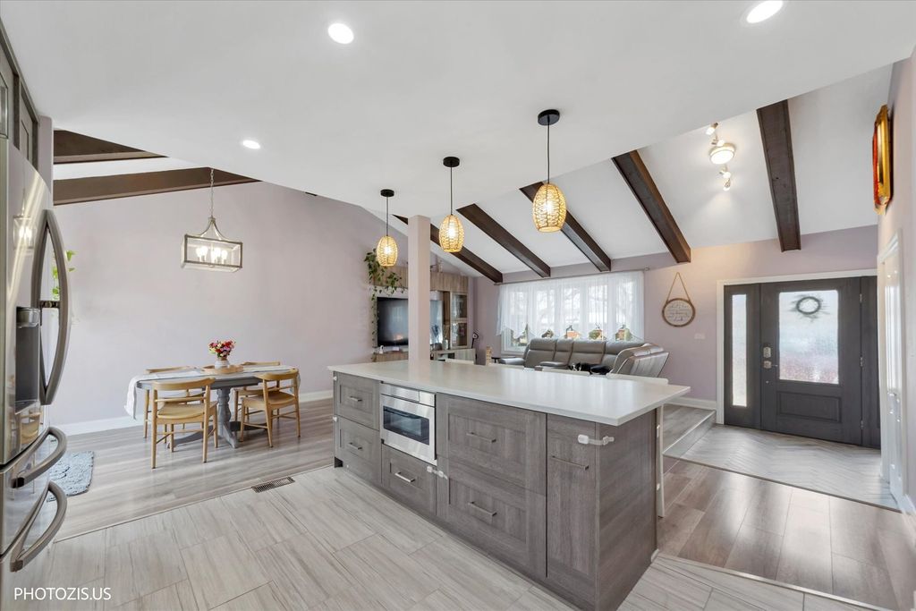 Discover refined living in this beautifully remodeled 3bedroom, 2 full bath single family home featuring a thoughtfully designed open-concept floor plan and impressive vaulted ceilings. The expansive living and dining areas flow seamlessly creating a bright and airy environment. The updated kitchen serves as the heart of the home, with sleek cabinetry, large island with quartz countertops great for entertaining and everyday comfort. Both full bathrooms are stylishly updated with timeless appeal. Laundry room on lower level is waiting for you to add your personal touch turning the room to your liking. New siding (2024), New roof, gutters & soffits (2020). New Furnace, A/C & Humidifier (2021). Sump Pump. New windows. This move-in ready home pairs modern elegance with everyday functionality warmly welcoming you HOME.