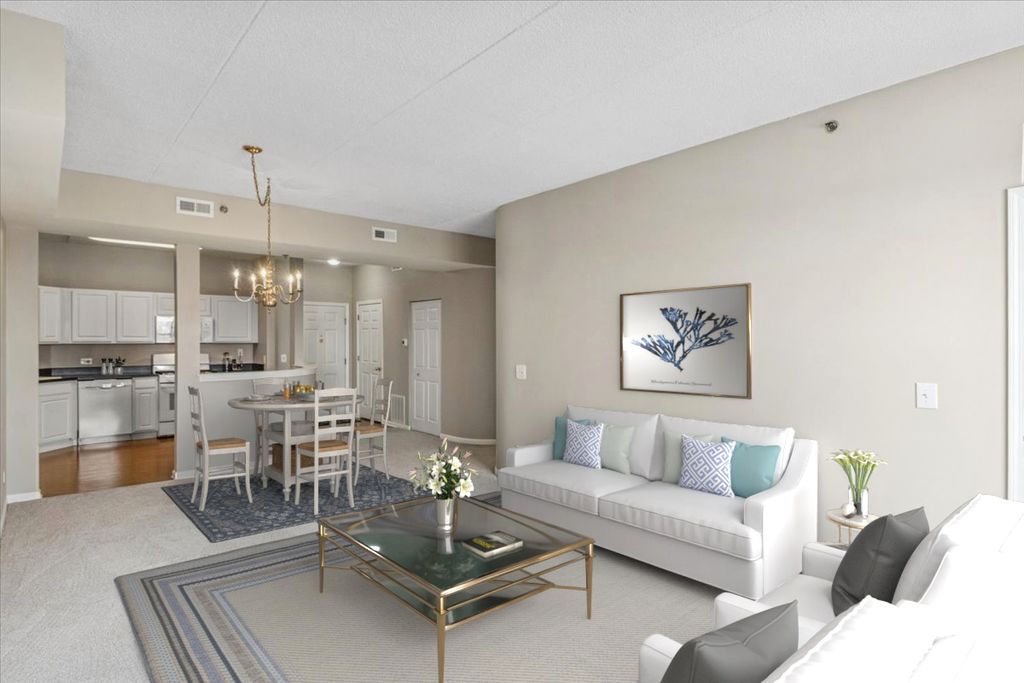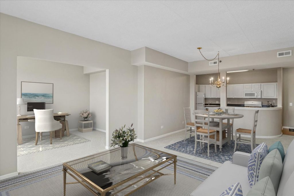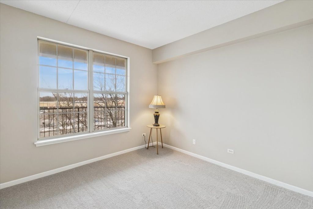 Welcome to the Easton - the largest model in Kimball Square with almost 1600 sq ft of living space! This highly desirable model offers a tremendous amount of space for daily living and entertaining with a large living room, combined dining room, eat-in kitchen and den. The versatile den can be used as a home office, family room, library, playroom or even a 3rd bedroom. This 2 bed/2 bath unit includes a phenomenal primary suite with a walk-in closet and a large bathroom featuring a double sink and separate tub/shower. Completely move-in ready with brand new carpet, fresh paint, new oven/range, new microwave, and new garbage disposal. Enjoy watching the 4th of July parade from your private balcony which is accessible via the living room or primary bedroom. Plenty of storage throughout including a storage closet off the balcony and a storage unit in the heated garage. Additional luxuries include heated floors, in-unit laundry and 1 assigned space in the attached garage. Premier location in the heart of Rolling Meadows near shopping, dining, library, parks, walking trails and highway access. Say hello to your new home! **NO RENTALS ALLOWED**