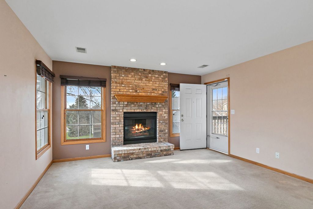 This rarely available upper-level end-unit condo is sure to impress. Exceptionally spacious and filled with natural light, this home features an abundance of windows throughout. The inviting living room is anchored by a beautiful gas fireplace, creating the perfect place to relax, while the eat-in kitchen is a dream for natural light lovers, complete with a large bay window ideal for enjoying the seasonal views. Upstairs, you'll find three bedrooms, including a generously sized primary suite with two closets and a double-sink bath. Convenient second-floor laundry adds to the home's thoughtful and functional layout. Step outside to enjoy your own private deck/balcony surrounded by mature trees, offering a peaceful outdoor retreat. Major updates include HVAC (2020), oven (2020), Bosch dishwasher (2021), refrigerator (2021),water heater (2022), microwave (2023) and roof (2024). All of this just minutes from downtown Sycamore.