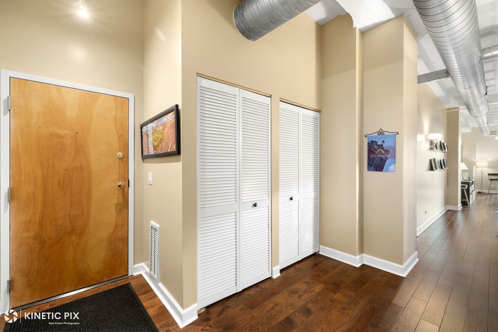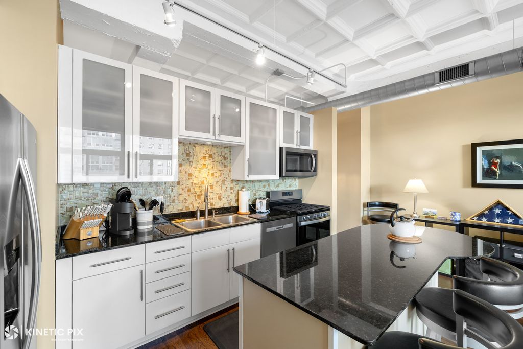 Bright and quiet east-facing loft condo on the original top floor of the historic Art Deco Film Exchange Lofts - originally built for Warner Brothers - offering timeless character with modern updates. Soaring 12-foot coffered ceilings and hardwood floors create an impressive living space filled with natural light. Enjoy indoor-outdoor living on a large private balcony featuring brand-new dual balcony doors and new transom windows (December 2025). The open-concept kitchen is perfect for entertaining, complete with a large island, granite countertops, and newer Whirlpool appliances (Dec 2023). The inviting living area features a cozy gas fireplace, while custom closet doors and professionally designed organizers provide exceptional, thoughtfully integrated storage throughout the home. The beautifully updated primary bathroom (2024) features a new vanity, a Bluetooth anti-fog mirror, a bidet, and a large walk-in shower with a luxurious rainfall shower head, creating a true spa-like retreat. In-unit washer dryer. Low monthly assessment. Also selling separate deeded parking for $25k around the corner at 1250 S Michigan Ave P280 or potential for monthly parking rental within the building. Unbeatable location - walk to Jewel, Trader Joe's, Target, Mariano's, Whole Foods, Roosevelt Collection (movies & shops), world-class museums, Grant Park, Millennium Park, and Lake Michigan. Close to all public transportation, offering easy access to I-90/94, I-55, I-290, and Lake Shore Drive. A rare opportunity to own a piece of architectural history with modern comfort in an exceptional South Loop location!