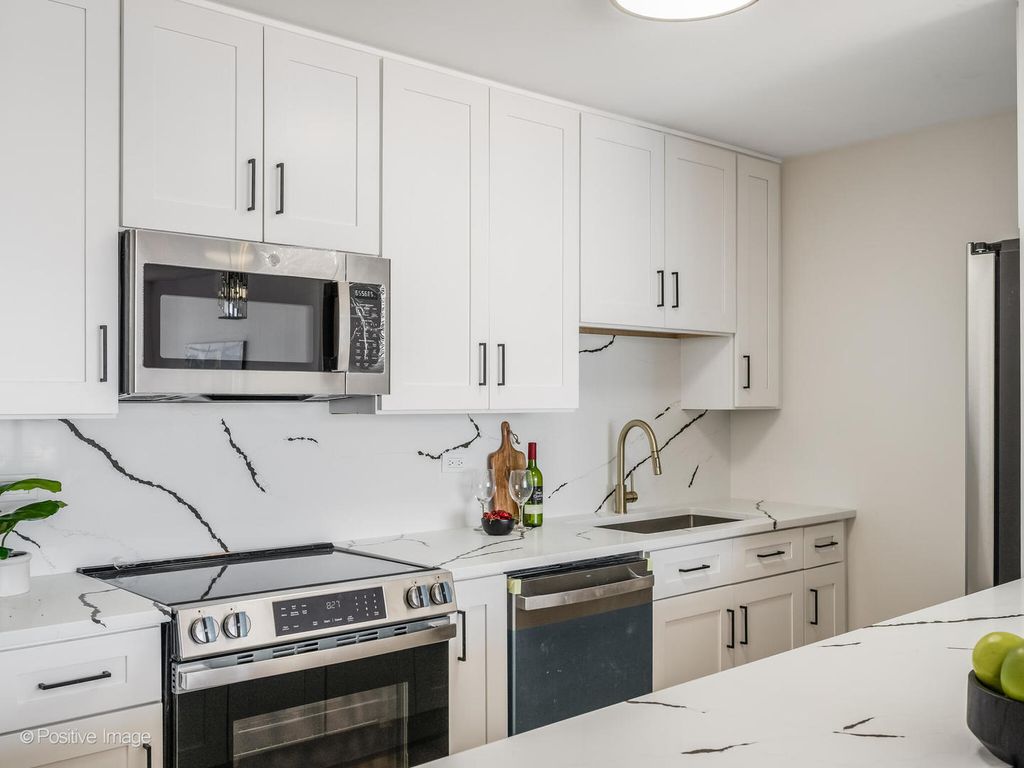 Fully remodeled 2-bedroom, 1-bath residence on the 32nd floor with breathtaking panoramic views of Lake Michigan and the city skyline. This thoughtfully redesigned home blends modern elegance with high-end finishes throughout. The show-stopping kitchen features Calacatta Vancouver quartz countertops with a dramatic waterfall edge, custom cabinetry, stainless steel appliances, beverage fridge, designer lighting, and a brass faucet. The oversized island provides generous seating and storage, perfect for entertaining. The open living space is flooded with natural light and showcases wide-plank flooring, sleek track lighting, and stunning lake views from expansive windows. The spa-inspired bathroom offers a double vanity, Rialto Grand porcelain tile, a walk-in shower with glass enclosure, and contemporary black fixtures. Ample closet space with organizers and stylish barn doors complete the interior. Full-amenity building includes pool and sundeck, party rooms, library, bike storage, storage lockers, dog run, picnic/play area, and common laundry. Rentals allowed. Garage parking available through the building (valet or self-park) for $200-$255/month. Prime Edgewater location steps to the beach, lakefront trail, CTA Red Line, express buses, shopping, and dining.