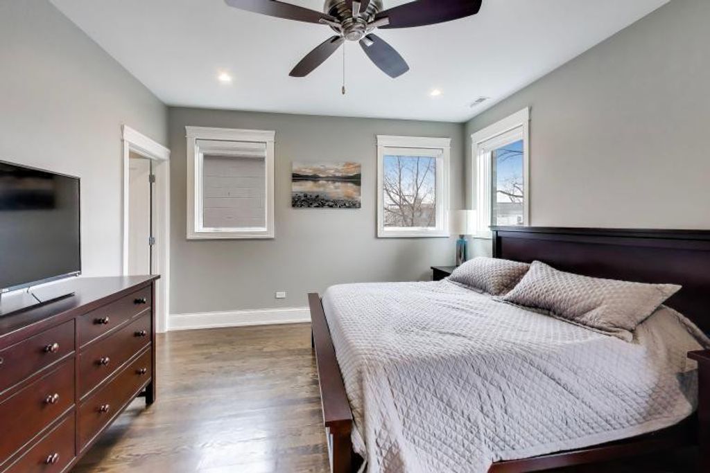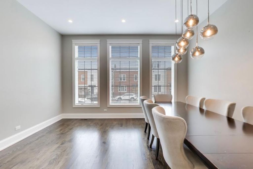 Stunning newer-construction single-family home on one of West Town's best blocks, located within the Mitchell School District. Built in 2019, this 4BD + 1 flex room, 3.2BA home offers approximately 3,608 square feet of living space across three levels. The open floor plan features hardwood floors, oversized windows, and high ceilings. The kitchen includes quartz and walnut countertops, a large island, stainless steel appliances, and custom cabinetry. The primary suite offers dual vanities, a steam shower with body sprays, and a walk-in closet. The finished lower level includes a wet bar with a beverage and wine refrigerator. The expansive rooftop deck features an outdoor kitchen, stunning city views, and multiple seating areas. Additional highlights include a fireplace in the living room, two laundry areas (one with a washer and dryer installed), EV-ready 220-volt wiring, and flush-mounted speakers throughout. Located in a prime Chicago location with easy access to restaurants, shops, parks, and public transportation, this home offers an ideal urban lifestyle.