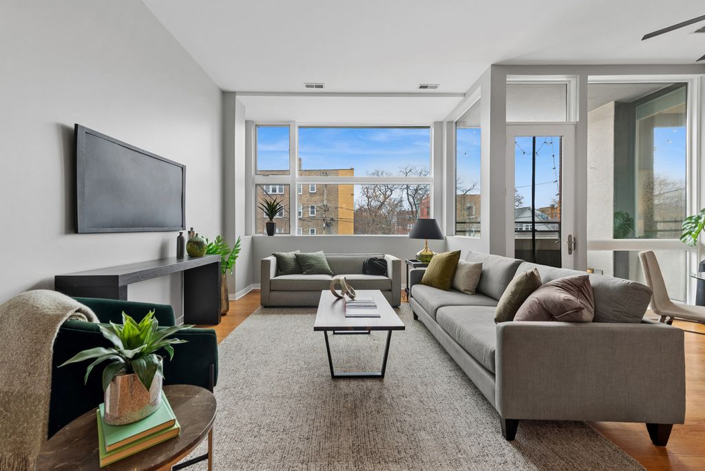 Multiplie offers received - highest and best called for Monday at noon. This sunny and spacious two bedroom, two bathroom condo is in a prime Logan Square location. This home is situated on the quiet east side of the building, accessible through a courtyard and does not face Kedzie. The unit features a freshly painted interior with high ceilings and abundant natural light throughout. The open kitchen, living, and dining areas have gleaming hardwood floors, and the open space makes entertaining easy. The primary suite is large enough for a king-sized bed and includes two generous custom closets. The second bedroom is ideally positioned on the opposite side of the unit for use as an office or guest room. The entry closet is extra deep for plenty of storage, and additional highlights include a private patio - perfect for grilling and one gated exterior parking spot included in the price. This home is ready for its new owner.