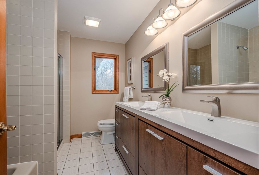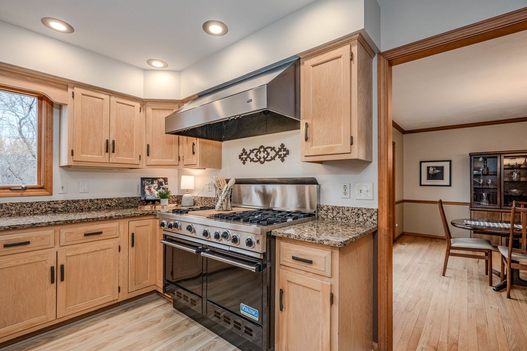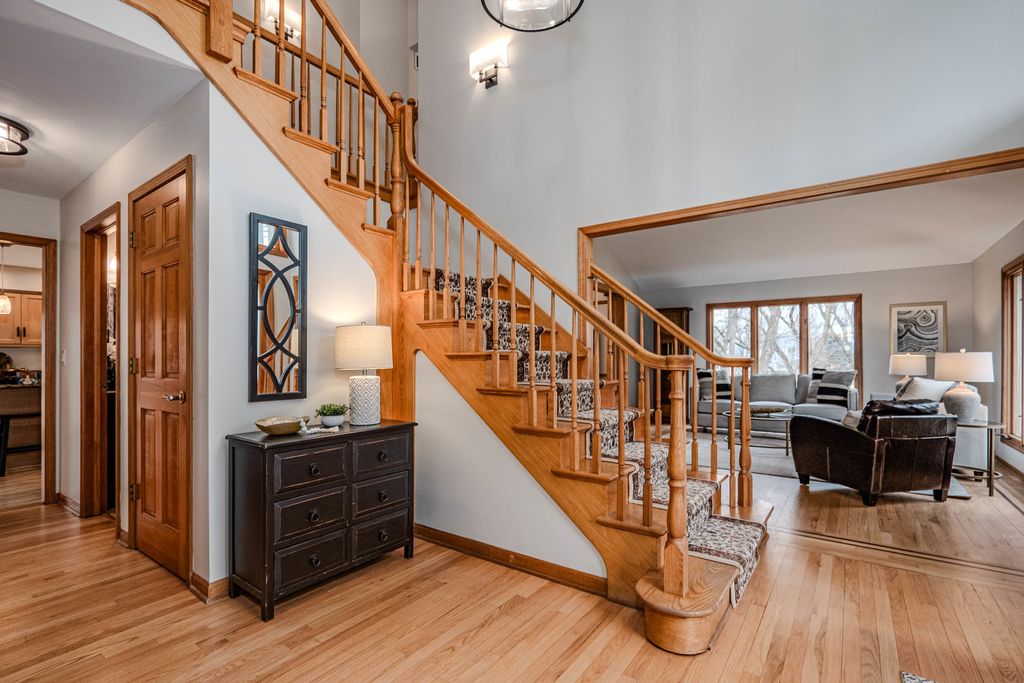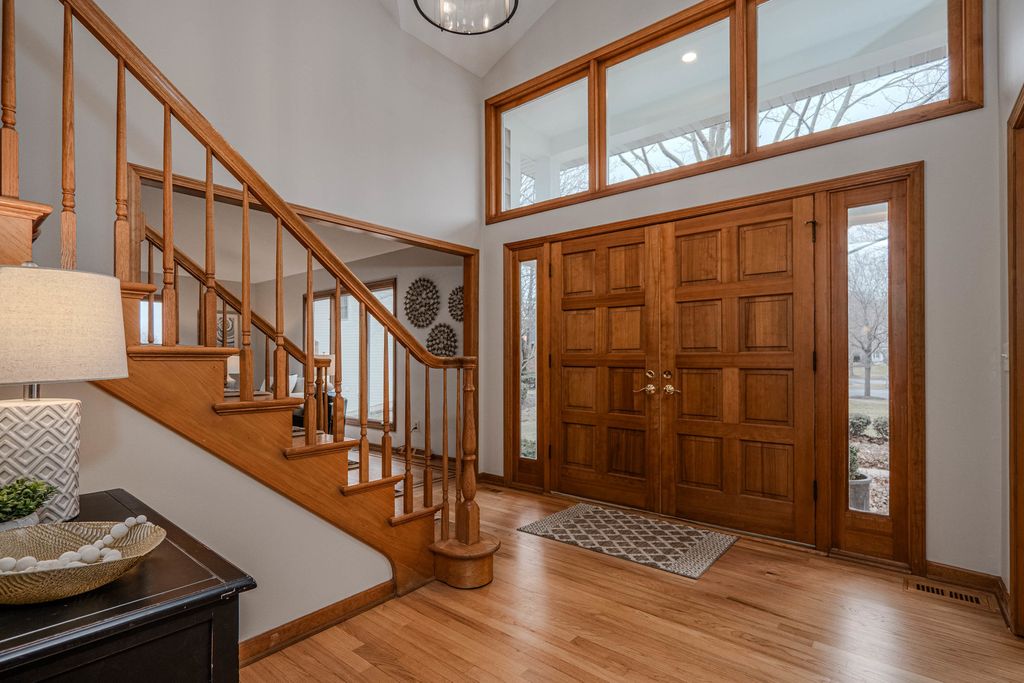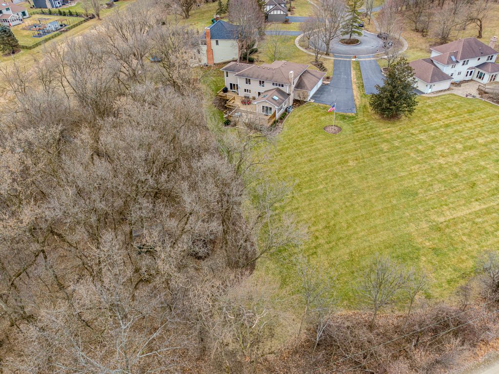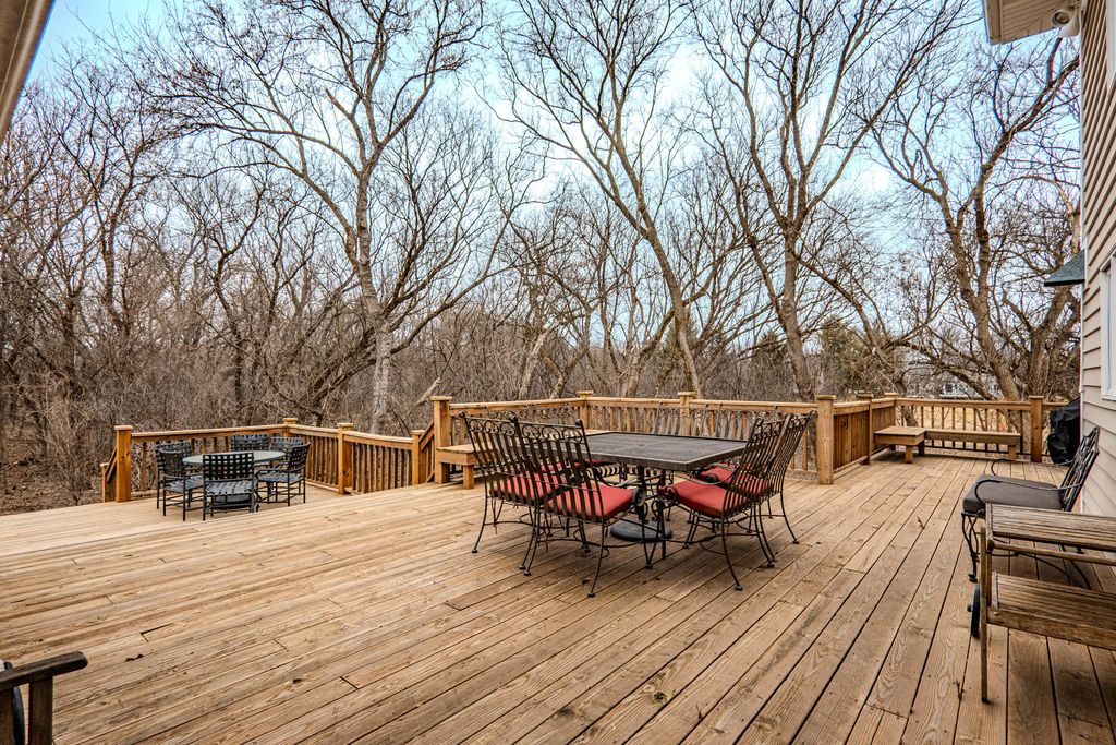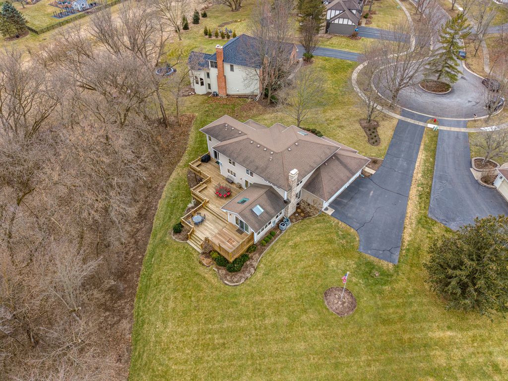 COME FOR THE HOME...STAY FOR THE LOT & LOCATION. Step through the double doors into a stunning two-story foyer that sets the tone for the home. Rich hardwood floors extend as far as the eye can see. Behind another set of double doors, the den offers a full wall of custom built-ins, creating an ideal space for working from home or focused study time. Oak floors with cherry inlay create a distinctive, custom look in the living room. When the home was custom built, the owners installed vintage pillars from their prior home, creating a distinctive architectural transition between the living and dining rooms. Step from the dining room onto a sprawling deck that spans the width of the home, ideal for hosting gatherings & taking the party outside. The chef in the family will appreciate the generous kitchen, designed to comfortably host a crowd. With the desirable open floor plan, the kitchen flows seamlessly into the family room, creating an inviting space for living & easy entertaining. The family room features a wood-burning fireplace, skylights & a vaulted ceiling alcove. This room also offers direct access to the deck. The laundry room is conveniently located on the 1st floor & who doesn't love a laundry chute? Upstairs you will find 4 BR's & 2 full bathrooms. The generous primary suite boasts 2 walk-in closets & a beautifully refreshed, oversized bathroom. The secondary bedrooms share a spacious, refreshed bath complete with double vanities, a walk-in shower & a tub. The home continues to impress with a finished walkout basement that opens directly to the backyard, creating effortless indoor-outdoor living. The lower level is rounded out by a 5th BR, full bathroom, 2 spacious recreation spaces & a wet bar. Situated on nearly an acre at the end of a quiet cul-de-sac, the property features a beautifully wooded backyard with added privacy. Some updates & improvements are: Exterior painted - 2025, majority of interior painted - 2025, Roof 2012, 1st & 2nd floor furnace & A/C -2017, 2nd floor A/C - 2008, 50 gallon H2O heater 2016, Hardwood floors refinished 2020, majority of lighting replaced 2025.