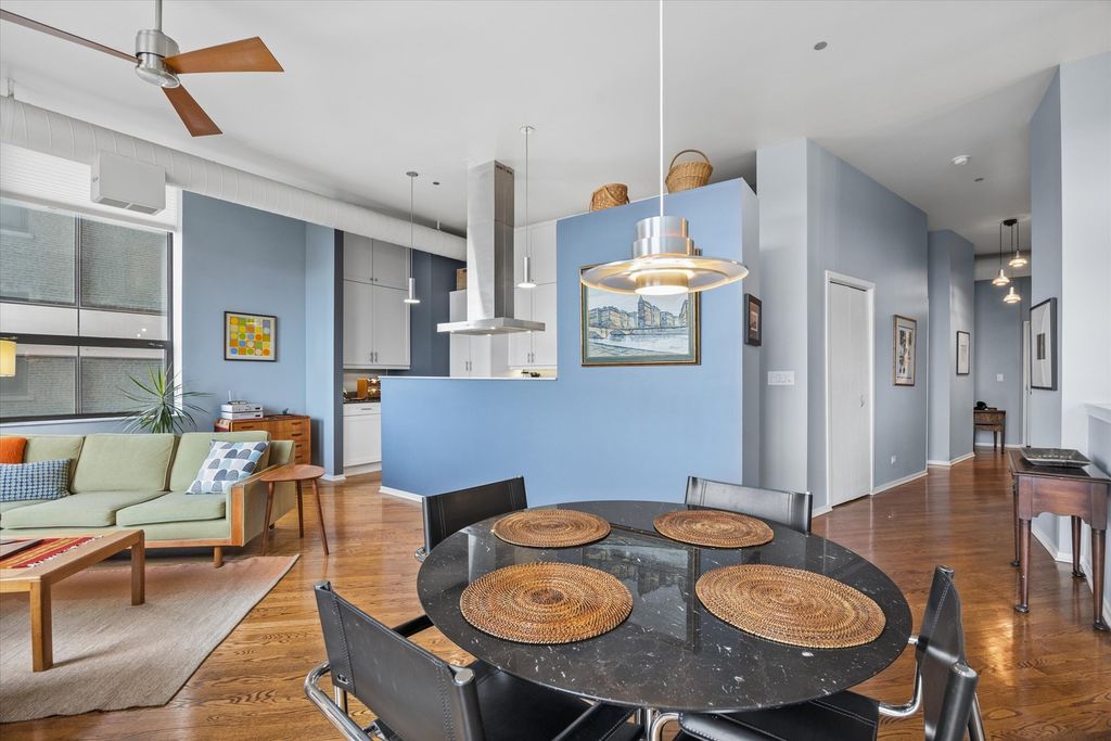 Set along iconic Michigan Avenue in the historic Michigan Avenue Lofts, this spacious 2 bed, 2 bath plus den residence offers dramatic scale and incredible natural light with eastern exposures overlooking Grant Park. Soaring 11 foot ceilings and massive windows flood the home with sunlight throughout the day. The mostly open concept layout is thoughtfully designed with partial walls that define separate living areas while still maintaining a connected flow between the living and dining spaces. The flexibility of the layout is a standout feature. One area currently serves as a music and reading space, while the den comfortably accommodates two desks for a true work from home setup. These spaces can easily function as a library, office, workout area, creative studio or third bedroom depending on your needs. The living room is anchored by a gas fireplace and opens to a kitchen with quartz countertops, stainless steel appliances, oven range that vents outside and long rows of kitchen shelving providing generous storage. Hardwood floors run throughout the main living areas, while both bedrooms feature carpeting. The split bedroom layout offers privacy, with a spacious primary suite that includes a large walk in closet and a beautifully renovated bathroom with double vanity, Brizo fixtures, and expansive walk in shower. The second bedroom sits adjacent to the den and living space and is partially open, offering flexibility for guests or additional workspace. Additional features include a full laundry room with sink, stackable washer dryer, ceiling fans and extra storage. One garage parking space and a storage locker are included. Michigan Avenue Lofts offers a full service experience with a welcoming lobby and doorman, business center and library, fitness center, dance and yoga studio, and on site dry cleaning. Perfectly positioned across from Grant Park and just moments from the Lakefront Trail, Museum Campus, Shedd Aquarium, Adler Planetarium, and Soldier Field, this home offers the rare combination of dramatic loft living and one of Chicago's most iconic locations.