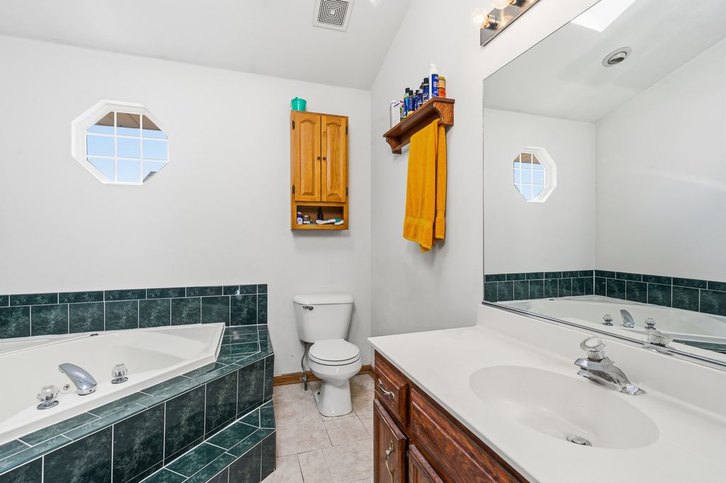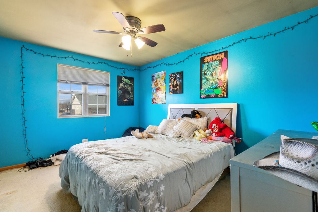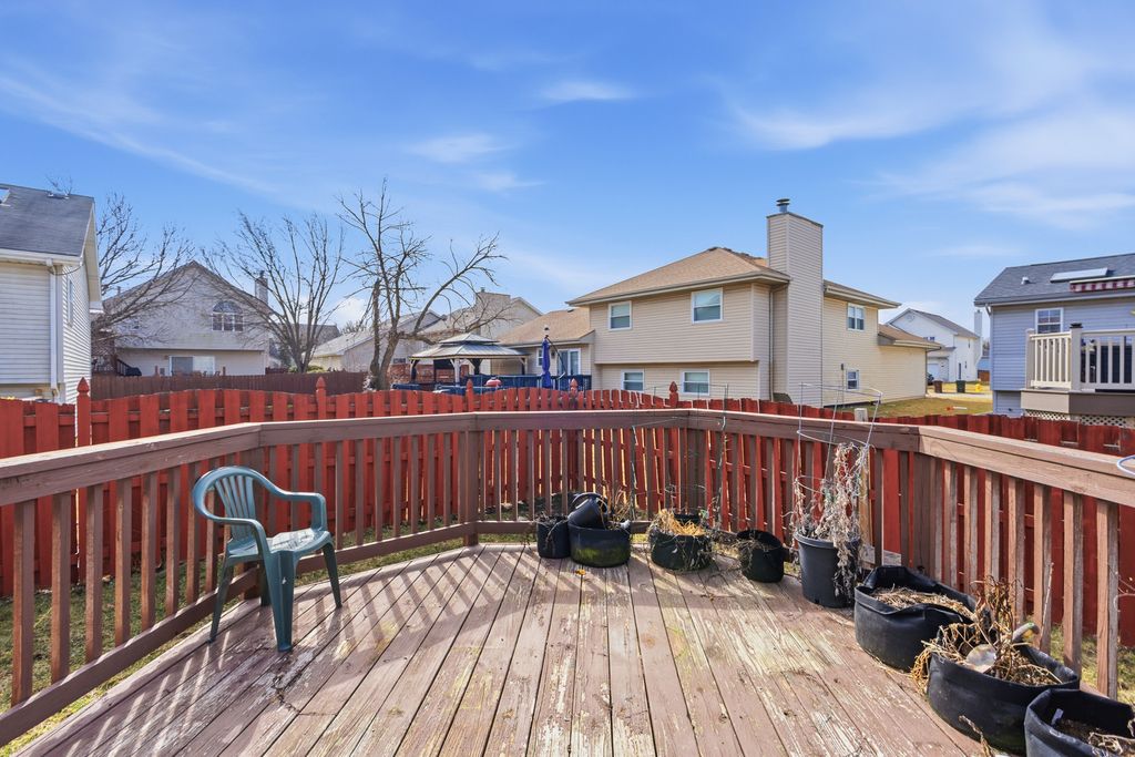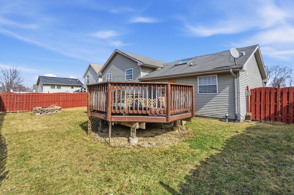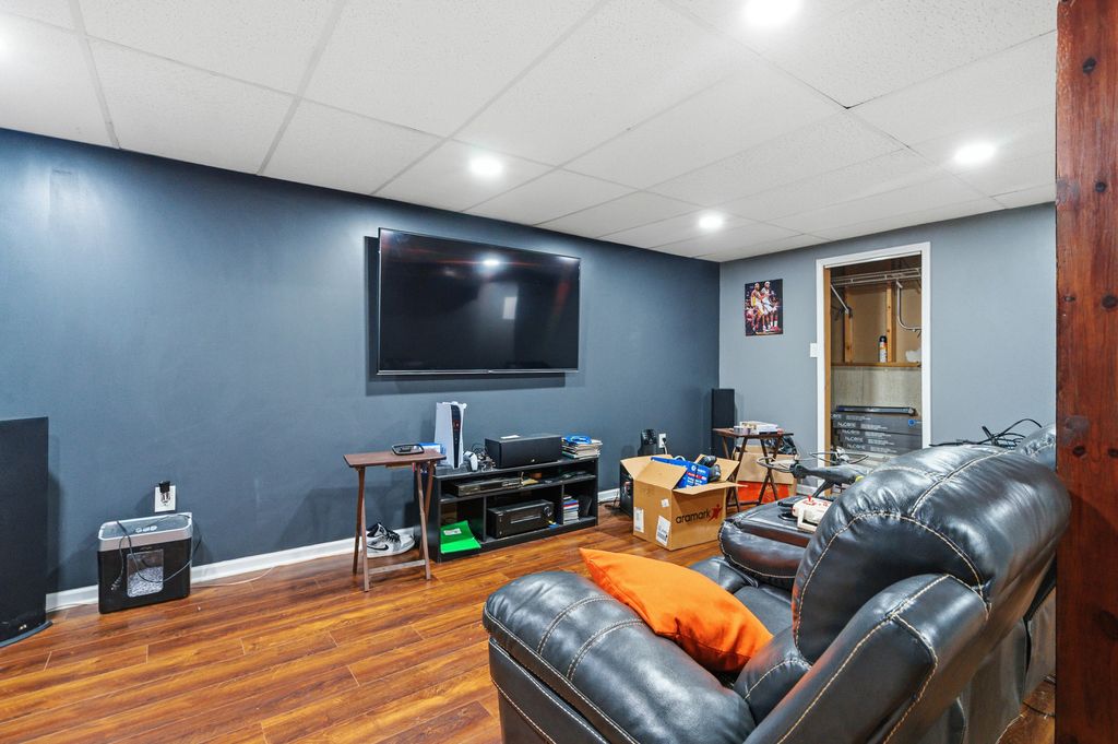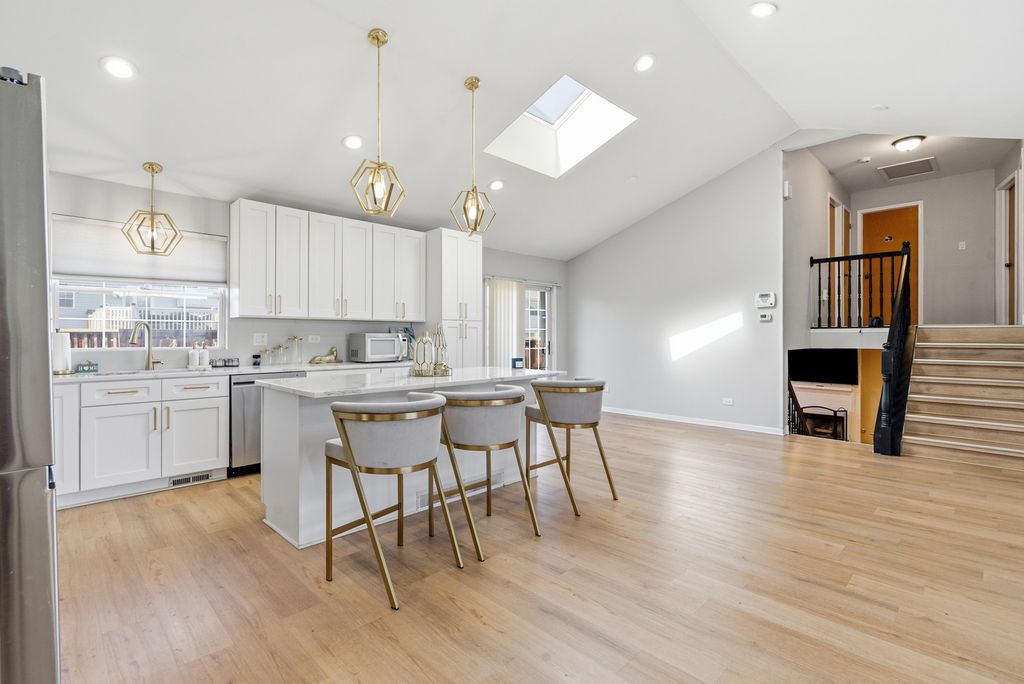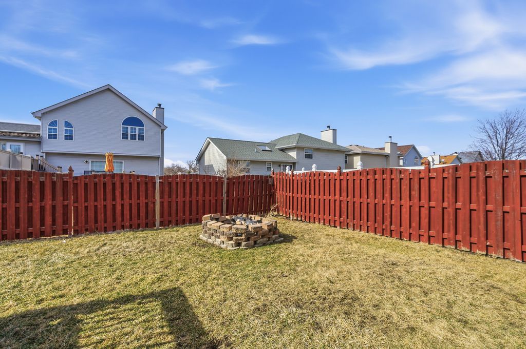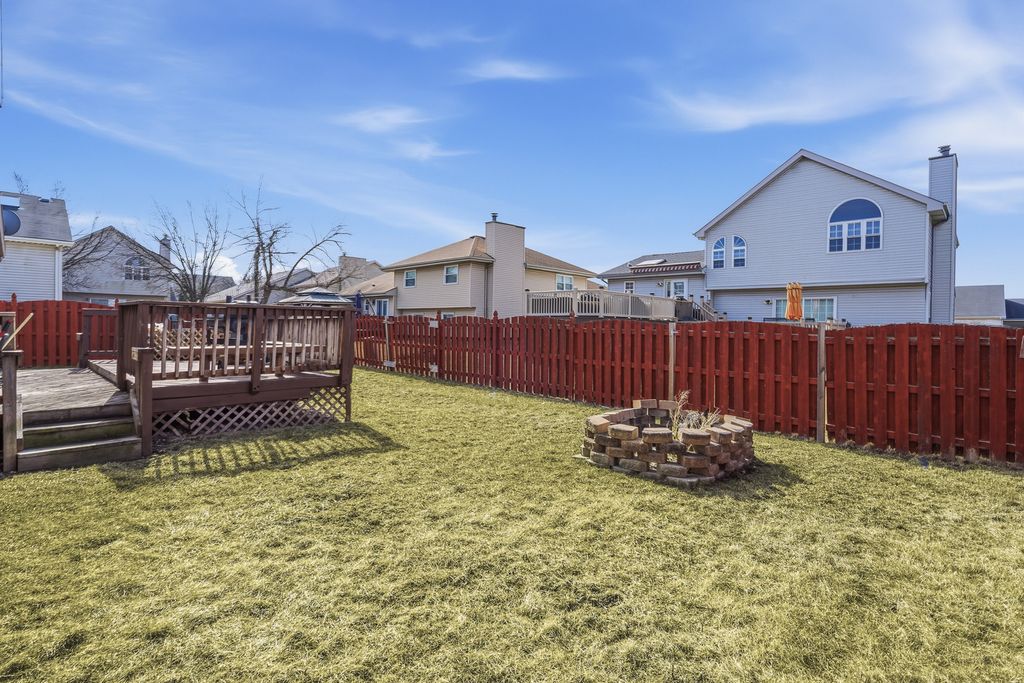Prepare to be impressed by this stunning and spacious quad-level home showcasing a beautifully open floor plan designed for both everyday living and unforgettable entertaining. At the heart of the home is a state-of-the-art, designer kitchen that has been completely remodeled to perfection, featuring custom white cabinetry, striking white quartz countertops, an oversized island with breakfast bar seating, recessed lighting with dimmer controls, and a pantry closet. The sun-filled vaulted living room and dining area create an airy, welcoming atmosphere and offer direct access to a large deck overlooking the fenced backyard complete with a cozy fire pit-perfect for relaxing evenings and gatherings under the stars. Stylish wood laminate plank flooring enhances the main living spaces with warmth and durability. The vaulted primary suite is a true retreat, offering a private bath with a luxurious whirlpool tub, separate shower, and walk-in closet. The lower-level family room provides the ideal space to unwind, boasting a gas-start, gas-log fireplace and built-in bar, along with a fourth bedroom and third full bath-perfect for related living or guest accommodations. Upstairs, you'll find two additional bedrooms and another full bath, bringing the total to four bedrooms and three full bathrooms. The finished sub-basement expands your living space even further with a recreation room, laundry room with utility sink, and ample storage. Major mechanical updates include a two-year-old hot water heater and sump pump, offering added peace of mind. This exceptional home blends luxury, space, and thoughtful updates-ready to impress from the moment you step inside.