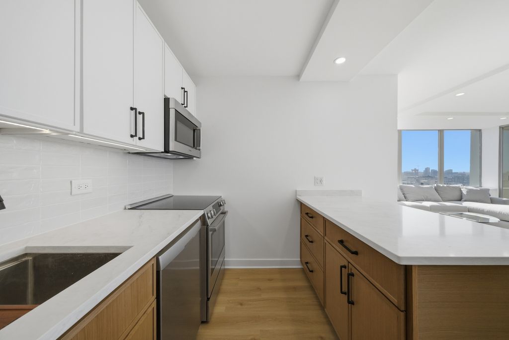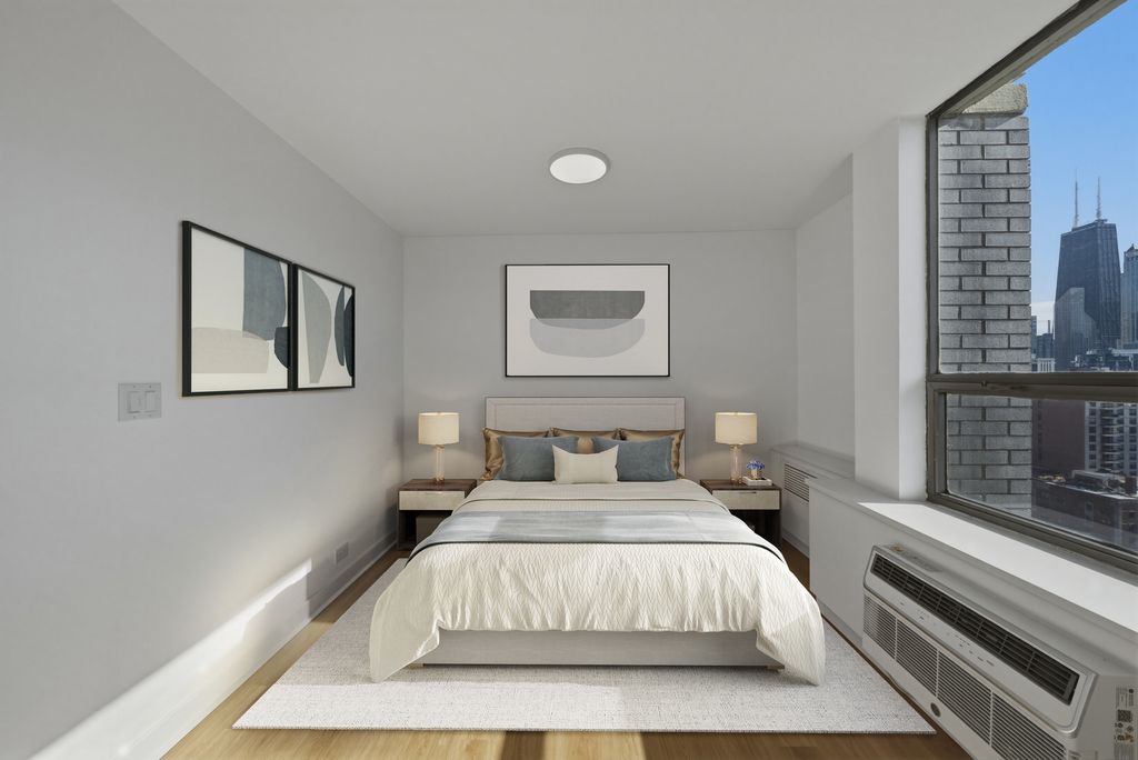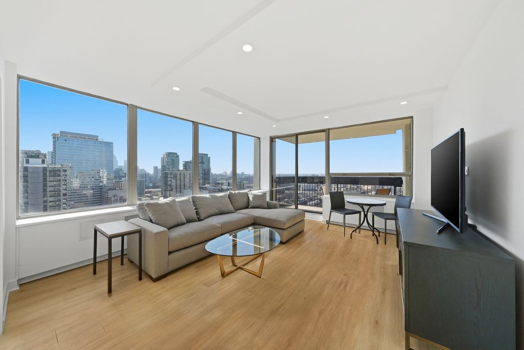 Spectacular city views from this high-floor southwest corner unit in Sandburg Village, featuring a large balcony. The open kitchen features custom slim shaker white upper cabinets and slim shaker white oak lower cabinets. Taj Mahal quartz countertops, under cabinet lighting. Bosch appliance package, and an oven with separate warming drawer. Hansgrohe water fixtures. Large primary bedroom with custom walk-in closet. The second bedroom features double opaque glass pocket doors that open into the living room, also allowing it to be used as a home office or dining room. Assessments include 1GB high-speed internet, DirecTV, and heat. Sandburg Village amenities include two outdoor pools (fee) and tennis/pickleball courts (fee). Pet-friendly building. Conveniently located within walking distance of Old Town, Nightlife, Lincoln Park Zoo, and North Avenue Beach. Just two blocks from the Red Line, bus routes 22, 26, & 156 steps away. Parking currently has a waitlist; nearby parking options are available.