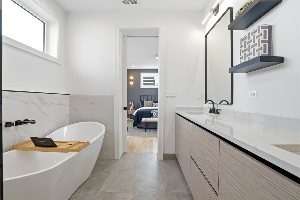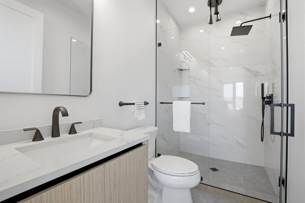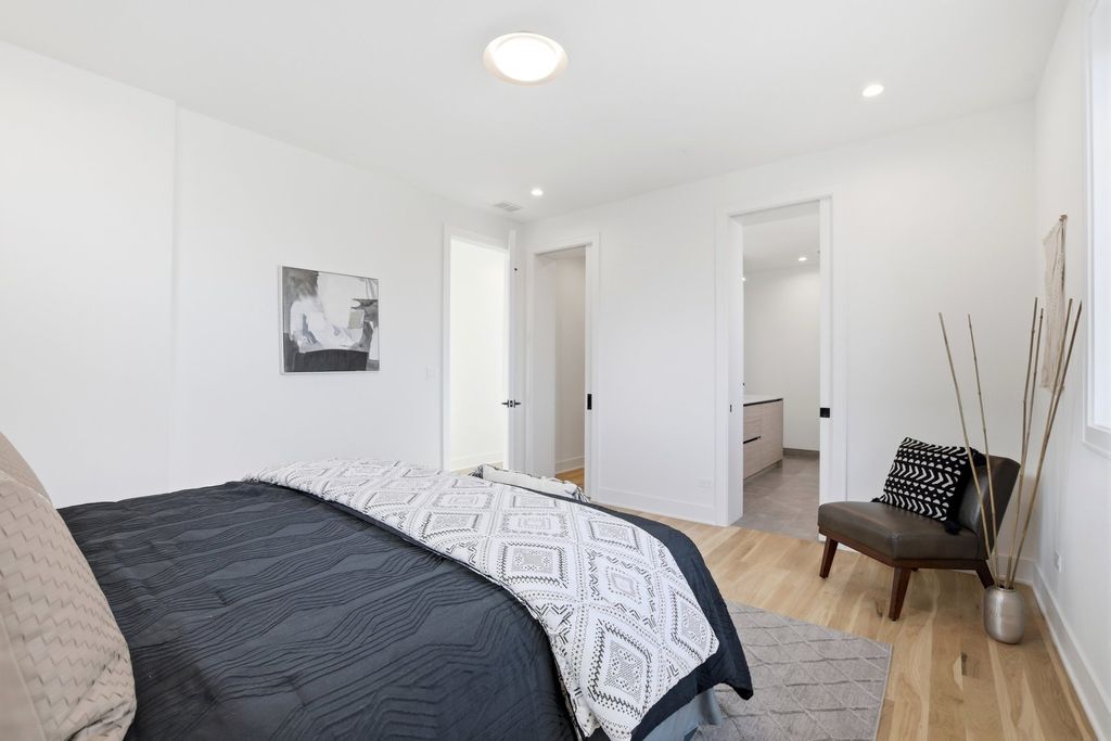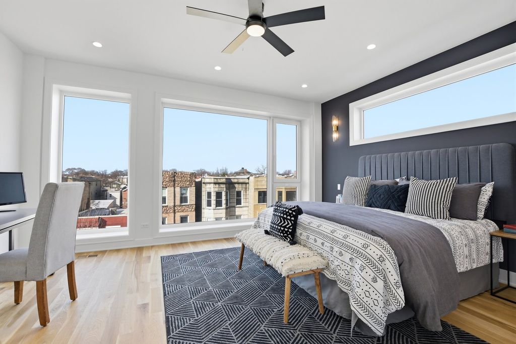 Experience elevated living in this brand-new Duplex Up in the heart of Ukrainian Village. Spanning approximately 2,400 square feet, this exceptional 3-bedroom, 3.5-bath residence offers two expansive levels of thoughtfully designed living space with luxury finishes throughout. The main level features a bright, open-concept layout anchored by massive, floor-to-ceiling west-facing European tilt-and-turn windows, delivering abundant natural light along with superior insulation and soundproofing. Wide-plank flooring and designer lighting add warmth and sophistication. The chef's kitchen showcases custom European cabinetry, quartz countertops with a dramatic waterfall edge and full-height backsplash, and a premium Thermador appliance package with a fully integrated refrigerator and dishwasher. A custom built-in bench with hooks and a spacious pantry provide both style and function. Down the hall, you'll find oversized bedrooms and spa-inspired baths adorned with large-format tile and high-end finishes. The primary suite offers peaceful eastern exposure, a generous walk-in closet, and a luxurious bath complete with a soaking tub, double vanity, and separate glass-enclosed shower. Upstairs, a stunning second level opens to a spacious family room with a fireplace, wet bar, and built-in European cabinetry featuring onyx quartz, floating shelves, and a dedicated beverage station. Floor-to-ceiling east-facing glass doors lead to an impressive 600+ square-foot private roof deck equipped with a Luvar System pergola and sweeping views of the Chicago skyline-perfect for entertaining. This level also offers the option for a second primary suite with dramatic windows and a private en-suite bath. Additional highlights include top-tier mechanicals with a tankless water heater, high-efficiency furnace, central AC, and humidifier. The home also features two private outdoor spaces, a carport garage space with an EV charger, and a one-year builder's warranty. Ready for immediate occupancy. Ideally located near Division Street and all the dining, shopping, parks, and CTA access that Ukrainian Village and Wicker Park have to offer, this home perfectly blends modern luxury with neighborhood charm.