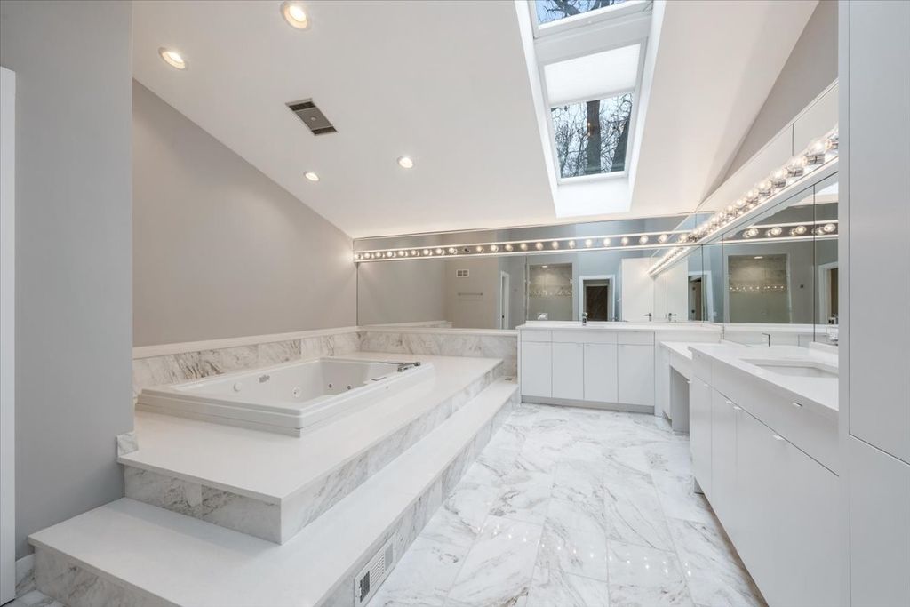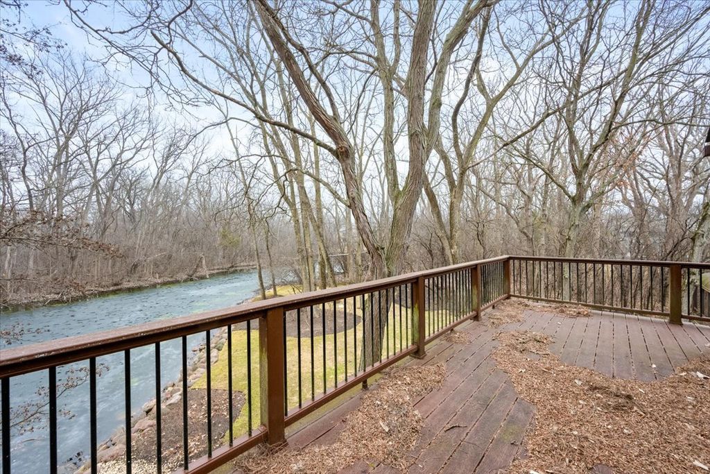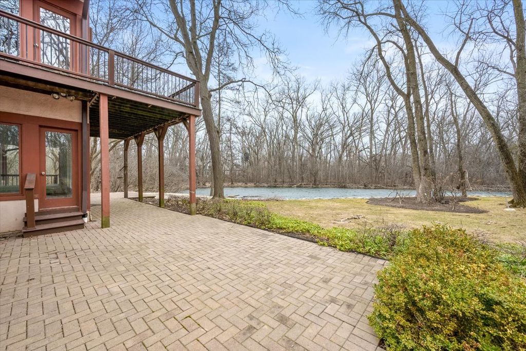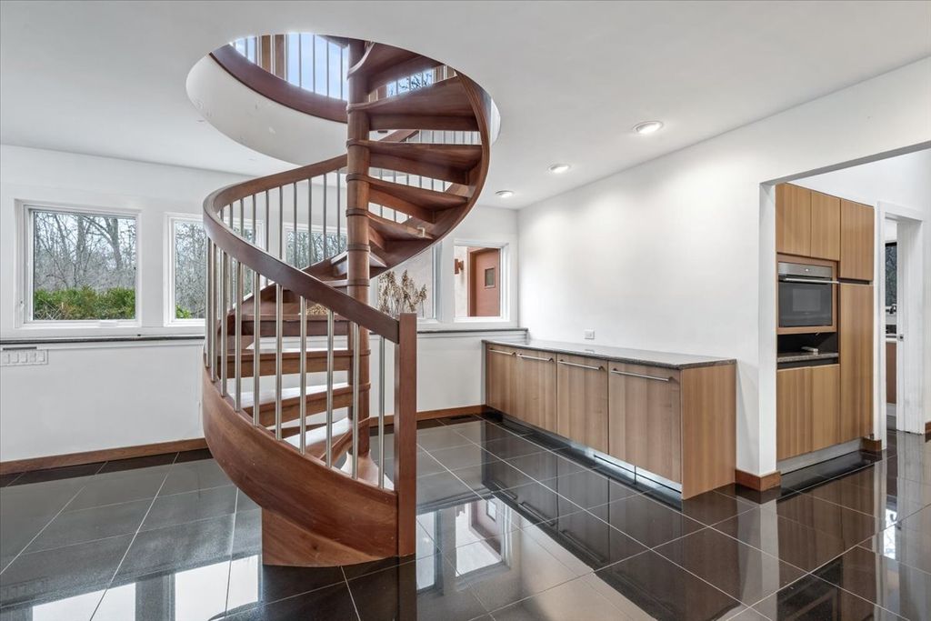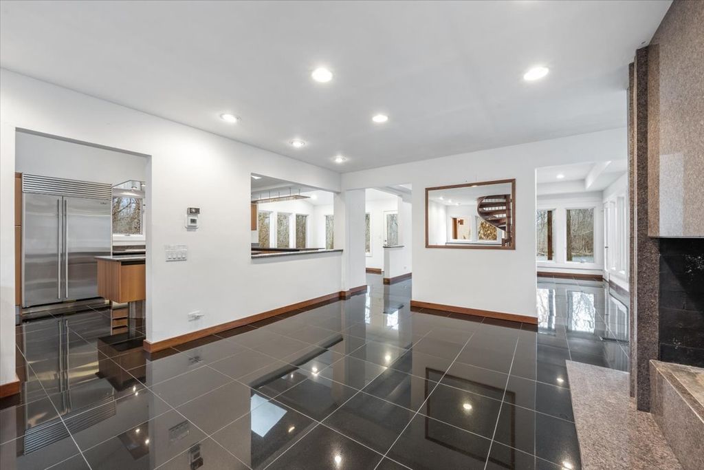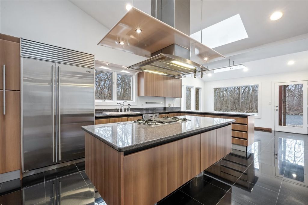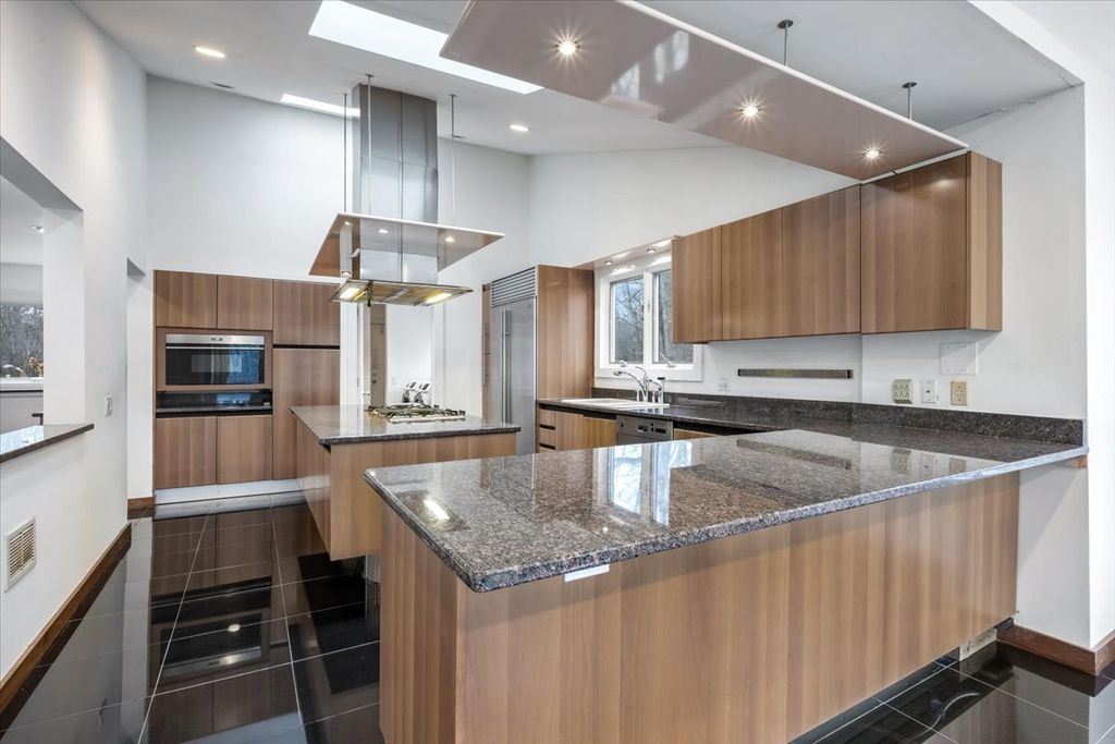 Architect-designed modern home on 1.85 private acres with a pond. A long private driveway leads to this gorgeous property with great potential but in need of renovation. Open floor plan with vaulted ceilings, skylights, and walls of windows overlooking the property. The dining room and step-up living room share a floor-to-ceiling two-sided gas fireplace. The eat-in kitchen with SubZero, Wolf, and Gaggenau appliances offers a spacious breakfast area overlooking the pond. There is direct access to a paver patio from the kitchen, living room, and family room. The primary suite includes a gas fireplace and adjacent walk-out heated sunroom used for exercise, along with a large walk-in closet and updated bath with skylights, jetted tub, and separate shower. Two additional bedrooms and 2 baths on the main level. Upstairs is a dramatic great room with beamed ceiling, wet bar, fourth full bath, large balcony, and expansive pond views. Remarkable setting. Home sold As-Is.