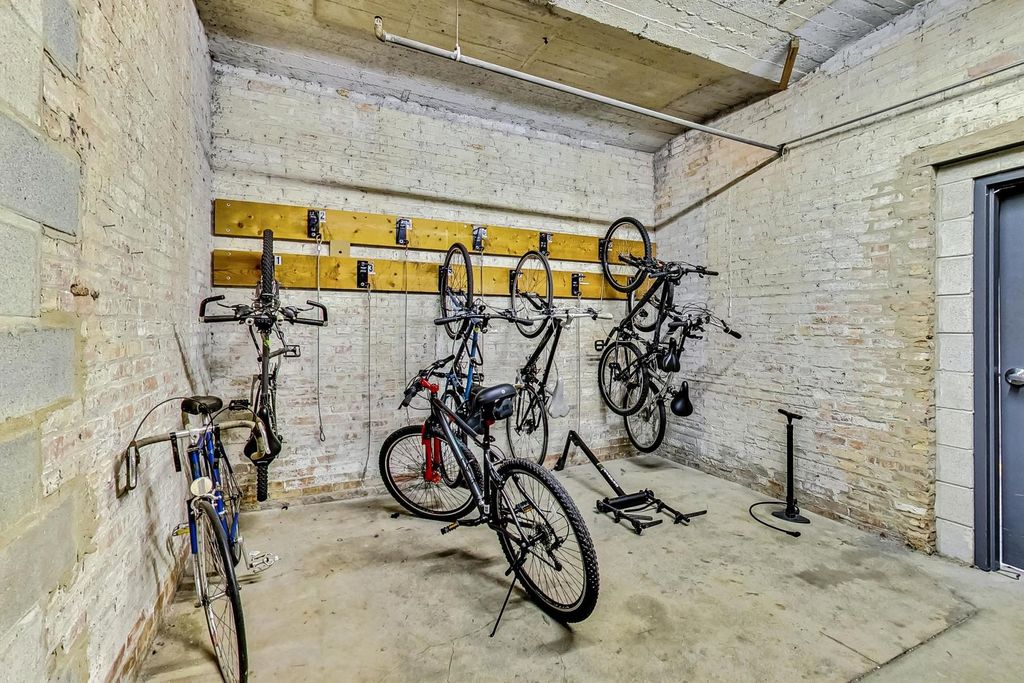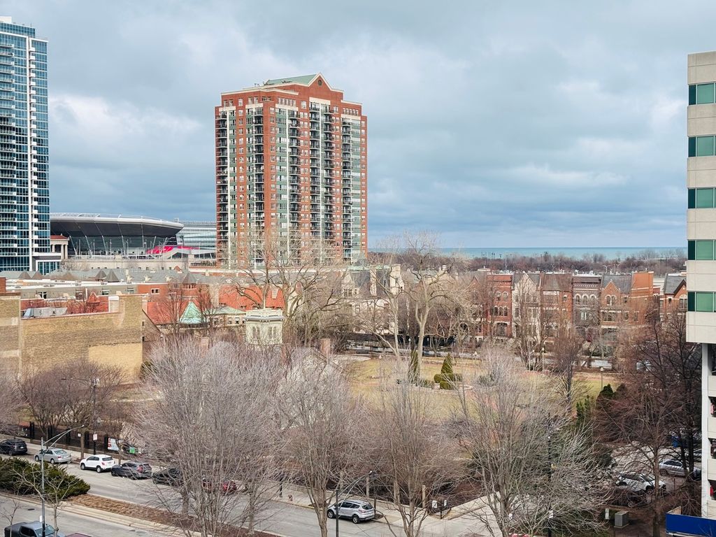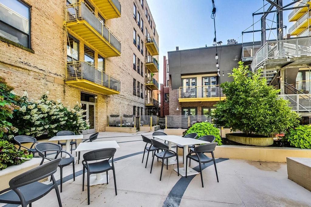 This bright, stylish penthouse in the historic 'Bank Note Place' of South Loop's coveted Prairie District offers incredible city and lake views. The northwest corner unit features an open living and dining space with, hardwood floors, tons of natural light and a large balcony to soak in the scenery. Freshly painted, it showcases finished ceilings with exposed ductwork. The kitchen, transformed into an open concept gem in 2023, boasts stainless steel appliances, an oversized island with new quartz countertops, sleek cabinets with black hardware, and a fun backsplash. In 2024, the bathroom underwent a complete renovation, along with a redesigned spacious hall closet. The primary bedroom has a large window and generous closet space. Extras include an elevator building, on-site maintenance, in-unit washer/dryer, deeded heated garage parking, and same-floor storage. The building's award-winning gated courtyard features lush landscaping and a waterfall. Building main entrance has a wheelchair accessible lift. Close to the lakefront path, restaurants, transit, groceries, museums, highways, dog park, Soldier Field, and more-this one is a must-see!