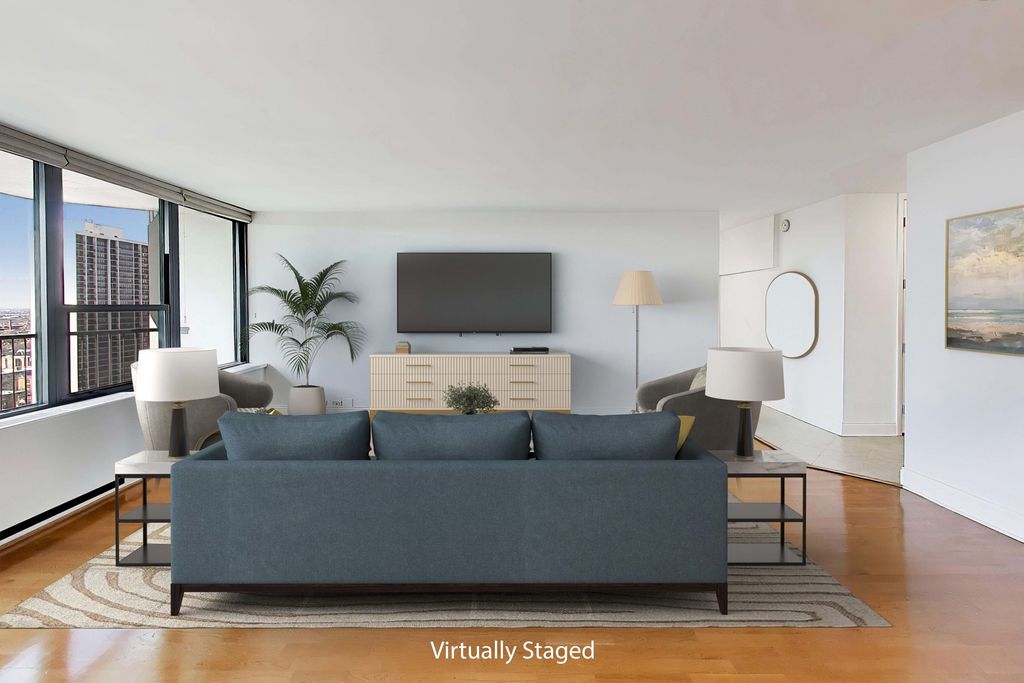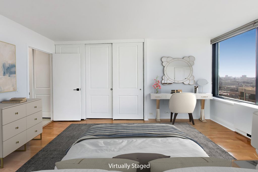 Your new home at James House awaits! This large, west-facing one-bedroom residence offers spectacular sunset views and an abundance of natural light. The updated kitchen features stainless steel appliances, warm wood cabinetry, and quartz countertops, perfectly blending style and functionality. The spacious living room with a dedicated dining area opens to an impressive 17-foot balcony which is ideal for grilling, morning coffee, or unwinding with an evening drink. It's a wonderful extension of your living space and perfect for entertaining. The generously sized bedroom easily accommodates a king-size bed along with additional furniture. Storage is exceptional, including a large walk-in closet at the entry, multiple closets throughout the unit, and an additional storage locker in the building. James House is part of a full-amenity association offering 24/7 door staff, a receiving room with package delivery to your unit, a sundeck with stunning views, two hospitality rooms, a large laundry facility, on-site management, and a full maintenance staff. Residents also enjoy access to a newly renovated fitness center, bike room, outdoor pools, tennis and pickleball courts (available for additional fees). The location is unbeatable, where the Gold Coast, Old Town, and Lincoln Park meet. Restaurants, bars, coffee shops, grocery stores, and boutiques are all within walking distance. Clark and LaSalle buses are just steps away, and the Red and Brown Lines are within a few blocks, making commuting effortless. Valet parking is available immediately in the building for $200 per month, with a waitlist for a permanent assigned space. In-unit Washer/Dryer Hook-up possible with Management approval. This is truly a wonderful place to call home.