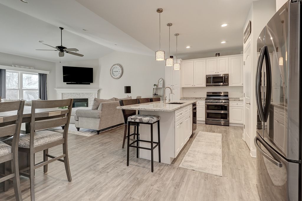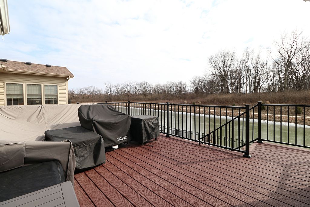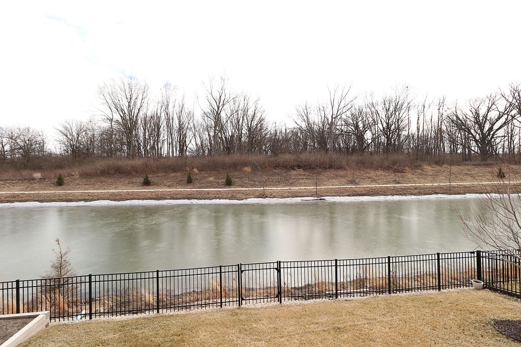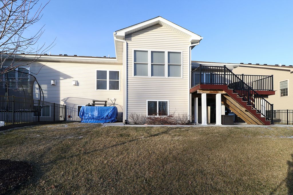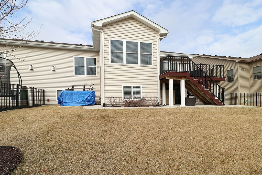 This stunning 3-bedroom, 3 bath custom built smart home duplex offers luxury finishes, thoughtful design and incredible versatility, perfect for entertaining or possible related living. Step inside to an open floor plan featuring a vaulted ceiling and a gas log fireplace with custom tile surround and blower creating a warm and inviting great room. The gourmet kitchen is a true showstopper with custom cabinetry, subway tile backsplash, a large island, granite countertops, composite sink with touchless faucet and Wi-Fi enabled Samsung appliances. The cozy sunroom with decorative shiplap provides beautiful seasonal views of the retention pond and wooded backdrop- a peaceful retreat year- round, The spacious primary suite boasts a customized walk-in closet and a private bath with a stunning decorative tiled shower. A conveniently located mudroom sits just off the garage and kitchen for everyday ease. The full lookout basement has 9-foot ceilings, a third full bathroom as well as a second kitchen and bar perfect for entertaining. There is also an office with glass French doors and a hobby room with an air vent. This home has great potential for related living. From the moment you enter the home you can tell there has been attention to detail with crown molding, chair rails, wainscoting and six panel doors. Enjoy the view of the pond and woods from the oversized custom deck with remote controlled led lighting. For those sunny summer days, you can find shade with the retractable remote-controlled awning. The fenced yard has been equipped with a 6-zone underground sprinkler system with Wi-Fi control. Additional upgrades to this home include a whole house generator, custom lighting, Simply Safe security system, and ample garage storage, including elevated storage pods, an outdoor gas grill hookup, and concrete finishing below the deck, as well as a storage shed. Garage door opener includes back up battery and camera. Custom blinds and shades throughout. All appliances are included. The 3-person hot tub is negotiable.