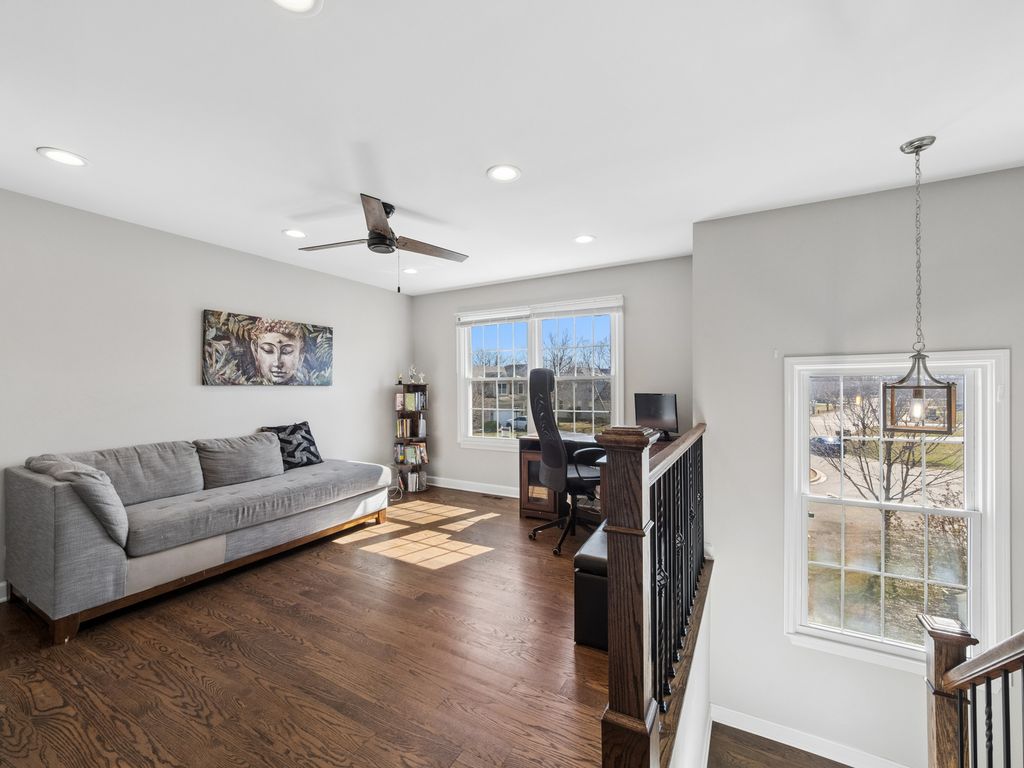 Multiple offers received. Highest and best by tomorrow Monday 3/16/26 - 5 pm. Welcome to this beautiful 2-story home offering 3 spacious bedrooms, 2.5 baths, and a versatile loft that can easily be converted into a 4th bedroom. The primary suite features a walk-in closet and a recently remodeled private bath. Throughout the home, you'll find hardwood flooring, updated doors, hardware, and trim, decorative iron stair spindles with handrails, recessed lighting, and an updated powder room. The convenient second-floor laundry room adds everyday ease. Enjoy entertaining in the generous family room highlighted by a stunning stone wood-burning fireplace. The separate dining room offers additional space for gatherings. The bright white kitchen features quartz countertops, stainless steel appliances, and an eating area with sliding doors leading to the landscaped private yard, complete with a patio, walkway, and a storage shed. Partially finished basement with a home theater for entertainment with family and friends. Additional updates include: Refrigerator (2024), microwave (2025), washer (2022), Furnace and A/C (2019), several newer windows, asphalt (shingles) roof (2015). Ideally located on a private cul-de-sac at the front of the subdivision, with three parks nearby. Situated within the award-winning Millburn Schools and Lakes High School district. This home truly combines modern updates, functional space, and an exceptional location - don't miss it!