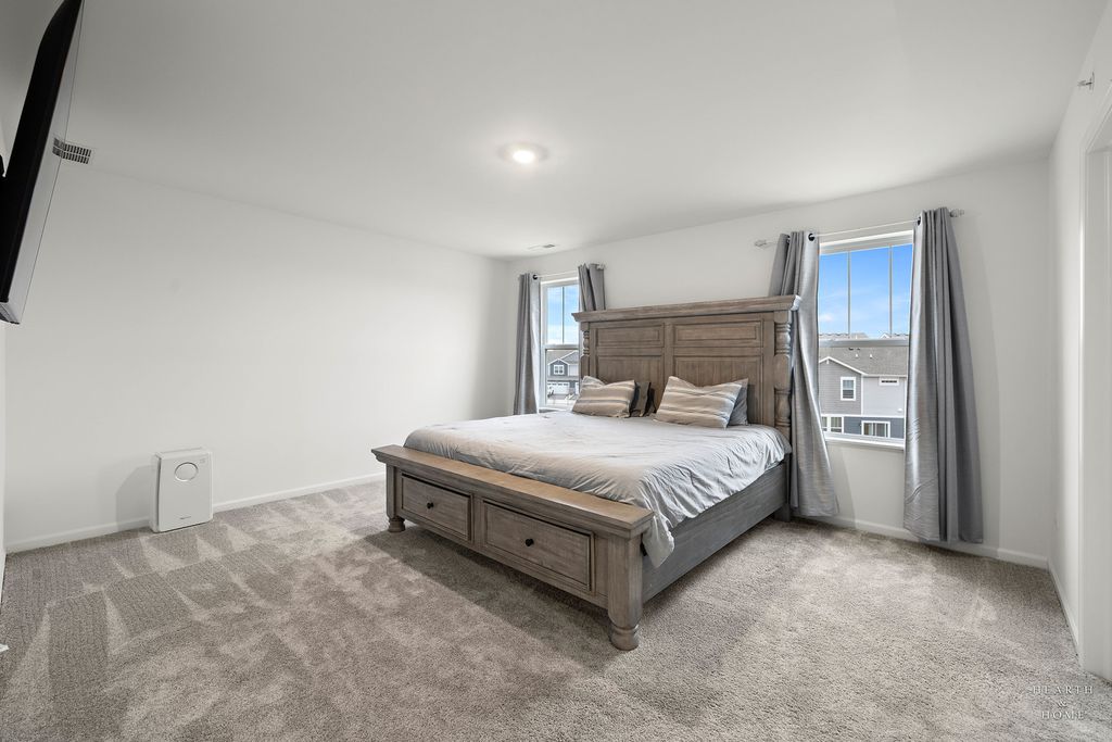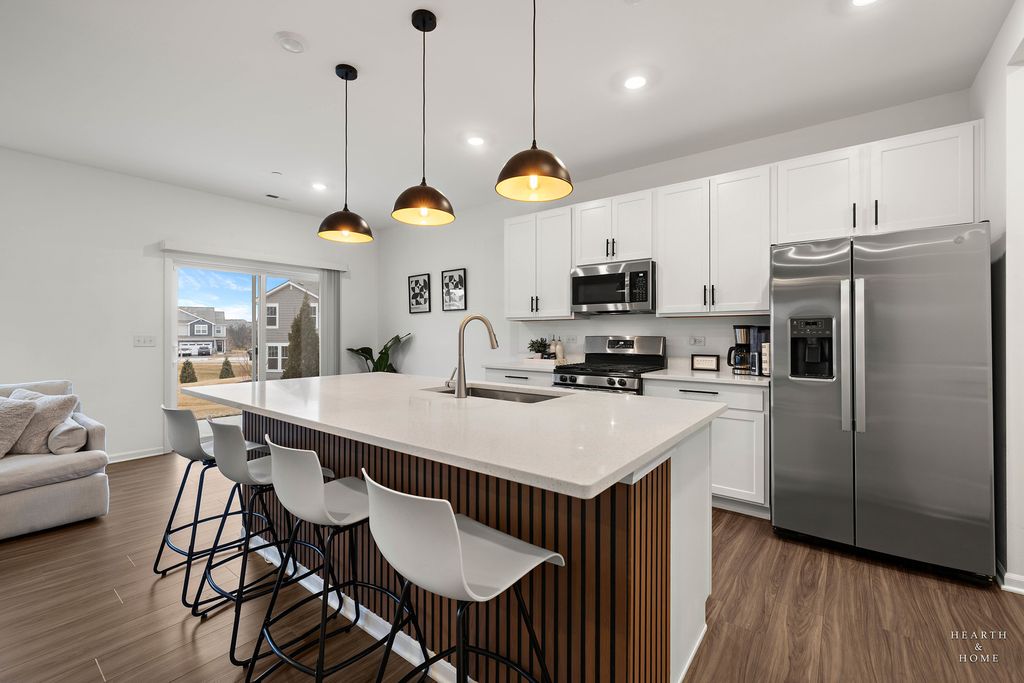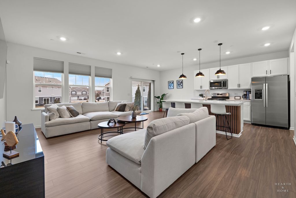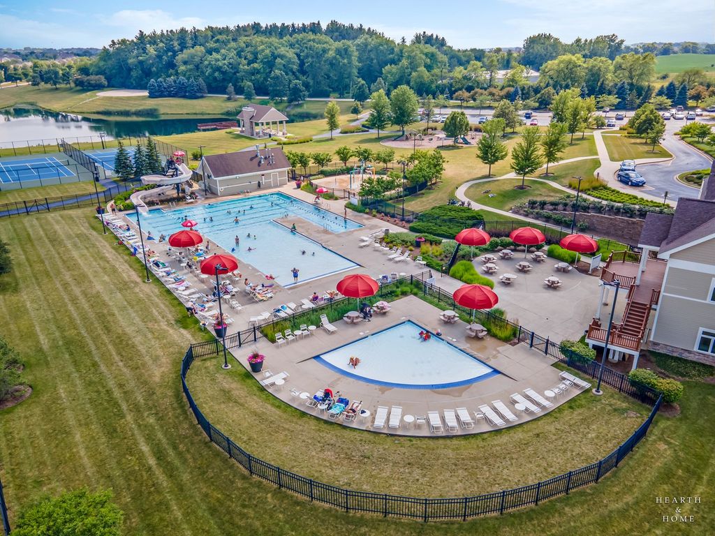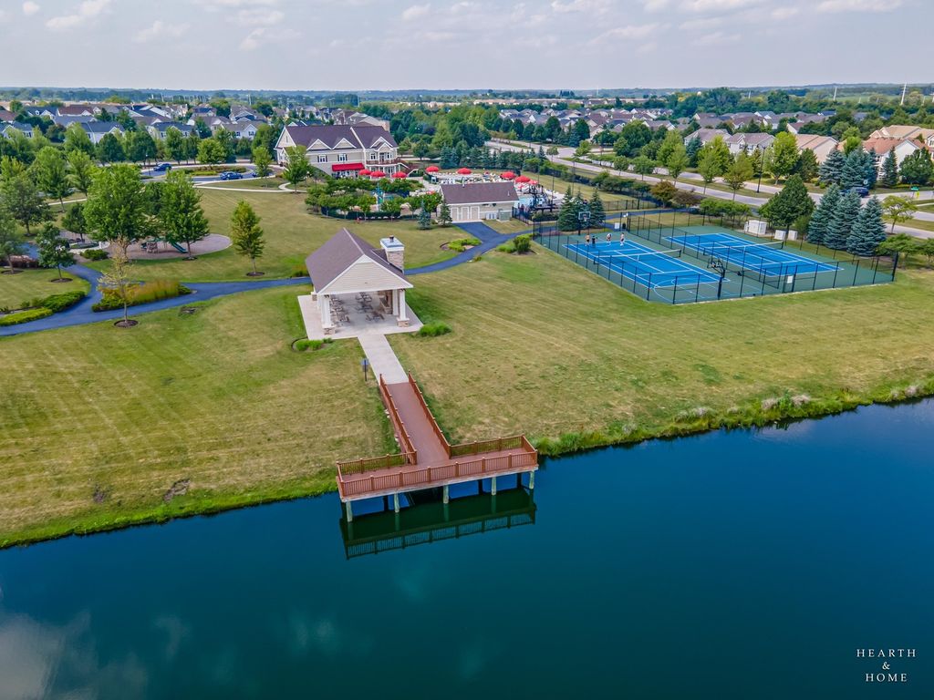 Welcome to your new home! The Marianne model, less than 2 years old, offers 3 bedrooms, 2.1 baths, a 2-car garage, and 1,767 sq. ft. of well-designed living space. The open-concept main level features a spacious great room and dining area. The kitchen includes a large center island, quartz countertops, undermount sink, stainless steel GE appliances, and abundant cabinetry. Energy-efficient construction with LED lighting throughout. Upstairs offers three generously sized bedrooms, two full baths, and convenient second-floor laundry. The spacious primary suite includes a private en-suite bath and walk-in closet. Smart home features include a Ring doorbell and digital thermostat. Enjoy resort-style amenities including an 8,000 sq. ft. clubhouse, fitness center, game room, pool with 18-ft water slide, kiddie pool/spray area, fishing pond, and on-site parks. Conveniently located near Route 47, stores, restaurants, parks, and served by highly rated Huntley D-158 schools.