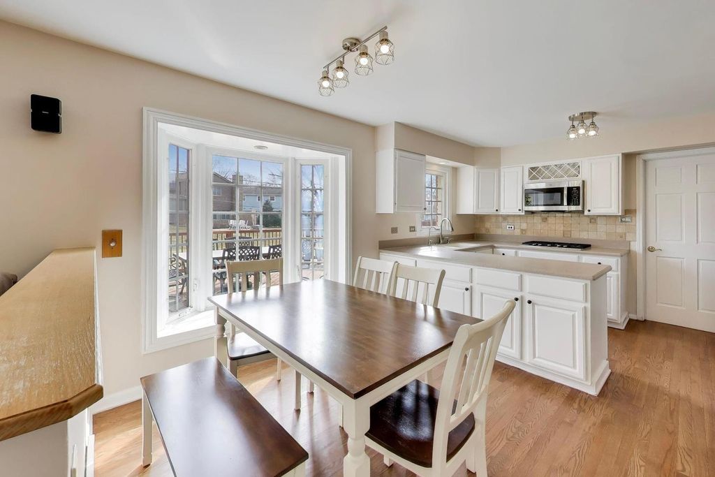 Fantastic opportunity near Lake Arlington! Move-in ready 4-bedroom, 2.1-bath Colonial just a stone's throw from the lake and served by award-winning John Hersey High School. Welcomed by a delightful front porch that offers a warm first impression, this well-maintained home features beautiful hardwood floors throughout, a welcoming foyer with a rare open staircase, and a classic layout designed for both everyday comfort and entertaining. The main level offers exceptional living space highlighted by an extra-large living room with tremendous flexibility and a generous dining room that connects seamlessly to the kitchen and convenient main-level half bath. The kitchen offers wonderful workspace and flows easily into the breakfast area and family room, creating a natural gathering space for daily life. The family room provides comfortable living and easy access to the resized deck and backyard retreat, ideal for grilling, entertaining, and relaxing outdoors. Upstairs you will find four incredibly spacious bedrooms with great storage and flexibility, including the primary suite with private ensuite bath. The finished basement expands the living space with a large recreation room, nostalgic horseshoe bar for entertaining, a separate utility room, and an oversized storage area. The attached two-car garage connects directly to the mudroom and laundry area and includes an exceptional walk-in pantry with racked storage, a rare and incredibly functional feature. Important mechanical updates include a Lennox furnace (2017), roof (2021), sump pump with battery backup (2025), water heater (2025), whole-house water filtration system (2025), and humidifier (2025), along with a deck approximately five years old. Enjoy outstanding access to Lake Arlington's scenic walking trails and parks, Arlington Heights' premier shopping and dining corridor, vibrant downtown Arlington Heights just six minutes away, and convenient access to Route 53. Plenty of opportunity to bring your creative touches while enjoying the exceptional space, layout, and location this home offers. Welcome!