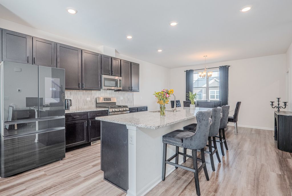 Welcome to this exceptional three-story townhome in the desirable Chelsea Manor subdivision of Aurora, located within the highly acclaimed Naperville School District. This beautifully designed residence offers 3 bedrooms, 2.5 bathrooms, and a 2-car attached garage, combining luxury finishes with a functional, open-concept layout ideal for today's lifestyle. The ground level welcomes you with a spacious foyer and a bright, versatile flex room perfect for a home office, playroom, fitness space, or additional family room, along with convenient access to the attached garage. The main living level features an open floor plan filled with natural light, enhanced by neutral wood laminate flooring , and elegant design details throughout. The gourmet kitchen serves as the heart of the home, showcasing striking granite countertops, an elongated island with seating overhang, stainless steel appliances including an upgraded Samsung Bespoke Refrigerator w/ Smart technology, dual sink with SS pull-down faucet, Attractive Matte black cabinetry and hardware, a stylish tile backsplash, and an expansive walk-in pantry. The kitchen flows seamlessly into the spacious dining area and light-filled family room, where large windows and sliding glass doors lead to a private balcony-perfect for grilling or relaxing outdoors. A conveniently located powder room completes this level. Upstairs, the top floor offers a thoughtfully designed layout with three generously sized bedrooms and two full bathrooms. The luxurious primary suite features a large window providing tons of natural light, oversized walk-in closet, and a spa-like en-suite bath with dual sinks, sleek cabinetry, and a beautifully tiled walk-in shower. Two additional bedrooms offer ample closet space and share a well-appointed full bath. A loft area provides additional flexibility for a second office or study nook, and the upper-level laundry room with LG Washer/Dryer w/ Steam technology , is conveniently tucked away with added storage. Attached 2 car Garage. Enjoy fast internet connection as AT&T has run Fiber to these townhomes. Ideally situated near shopping, Costco, dining, and major expressways, this home offers both comfort and convenience in a thriving community. Must see...