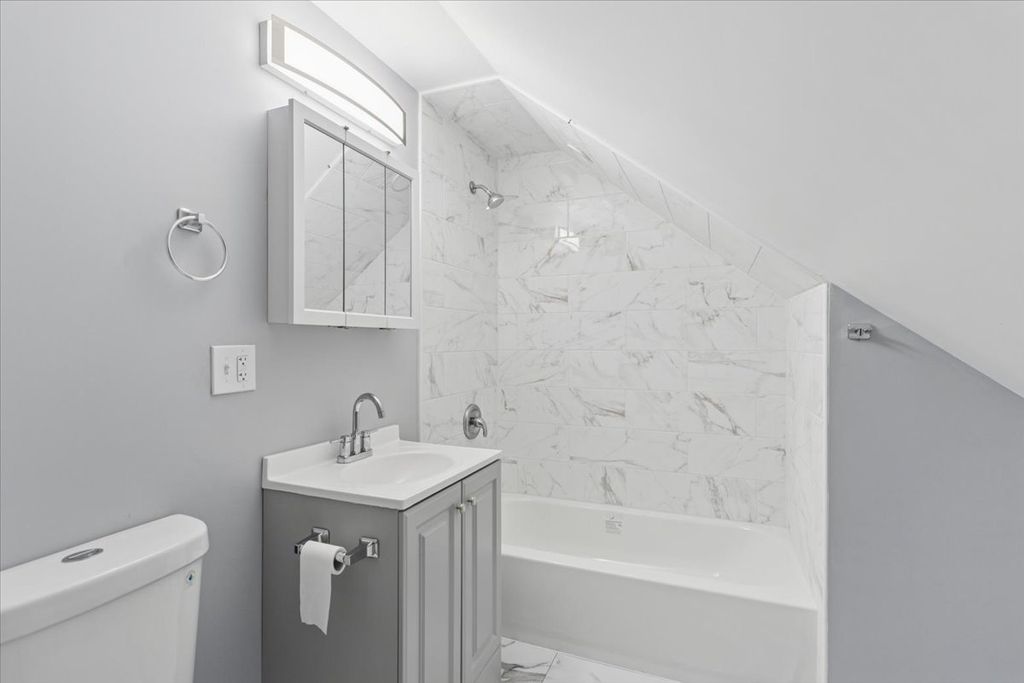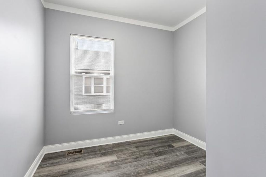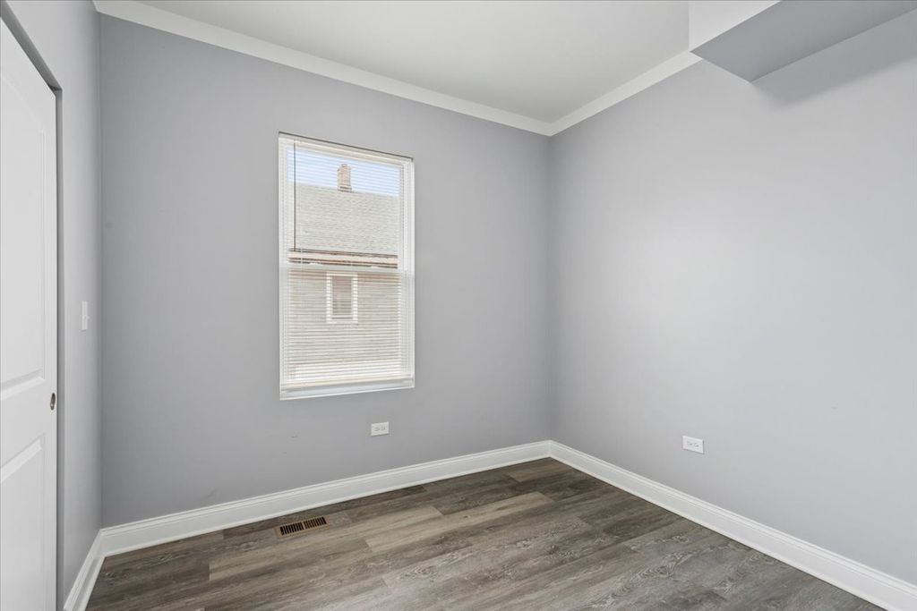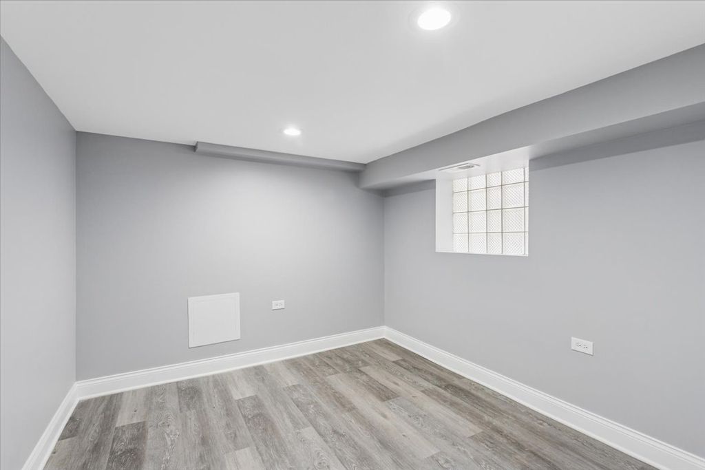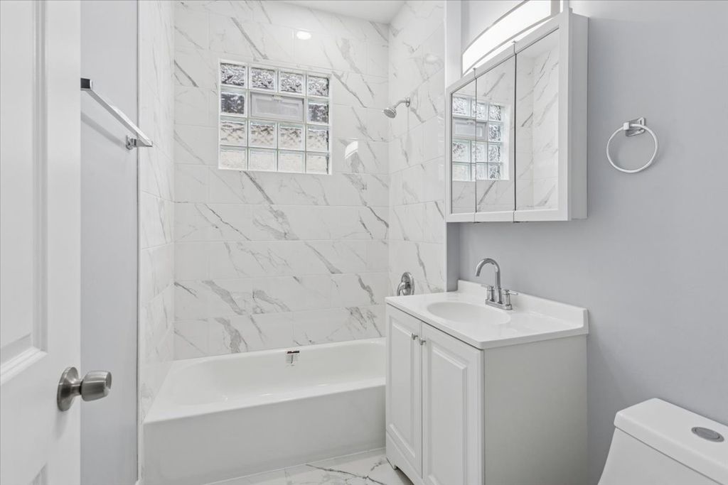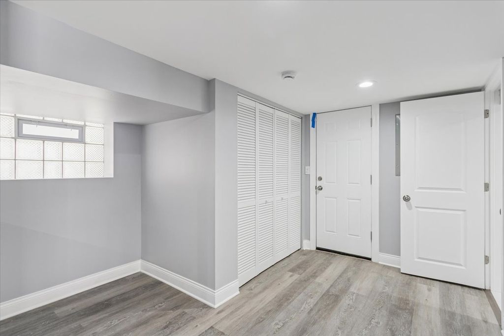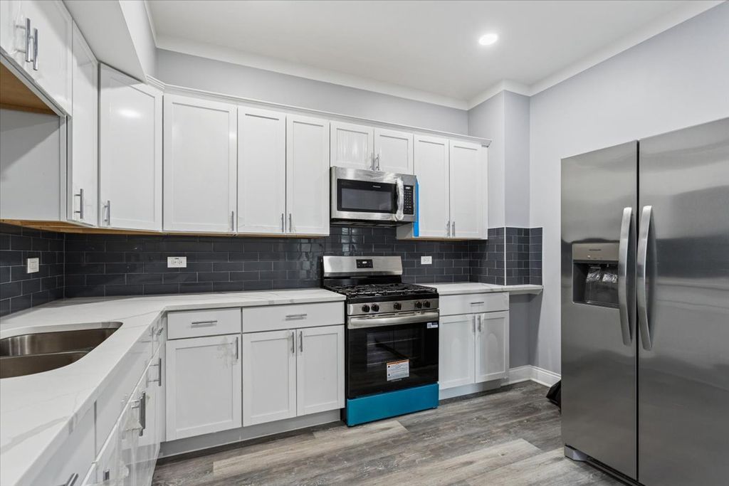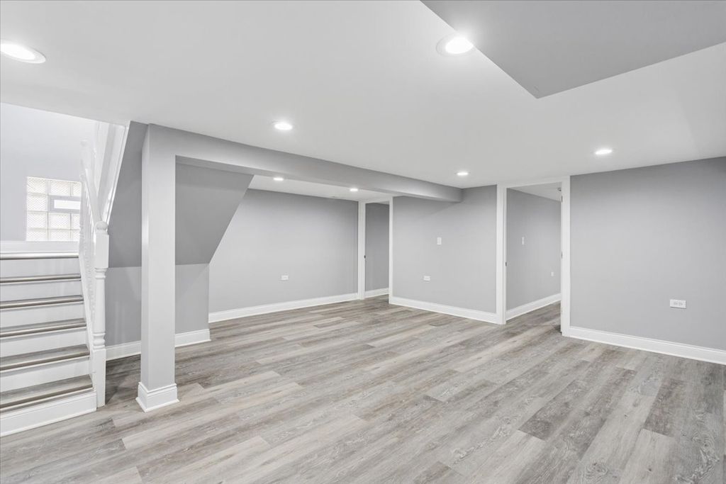 This stunning 7-bedroom, 3.5-bathroom home offers a large layout across three finished levels. The main floor features an open living area, crown molding, and a neutral color palette. The kitchen includes white shaker cabinets, quartz countertops, a charcoal subway tile backsplash, and a stainless steel appliance package. This level contains 3 bedrooms and a full bathroom with custom tile work. The upper level provides 2 additional bedrooms and 1.5 bathrooms. The fully finished basement includes a separate entrance, 2 bedrooms, and a third full bathroom, providing space for an in-law arrangement or guests. The property features modern recessed lighting, new flooring, and a central heating and cooling system. Located on a residential block with access to local transit and area amenities. This move-in-ready home is available for immediate showings.