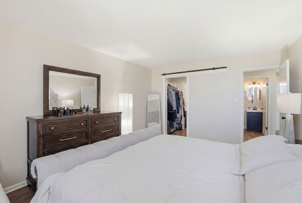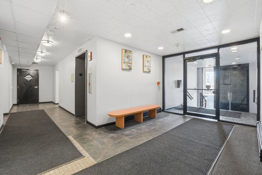 Beautifully updated penthouse-level 2-bedroom, 1.5-bath corner condo featuring desirable north and east exposures and abundant natural light throughout. Located in a well-maintained elevator building, this home offers a functional layout paired with modern finishes. The kitchen is appointed with quartz countertops, ample cabinet space, and a center island that opens seamlessly to the dining area and spacious living room-creating an ideal flow for everyday living and entertaining. Both bedrooms are generously sized, including a primary suite with a walk-in closet accessed through a sliding barn door and a private half bath. The bathrooms are updated with modern vanities, fixtures, toilets, and a refinished white epoxy tub and tile surround. Additional features include luxury vinyl plank flooring throughout, fresh neutral paint, white trim and doors, updated lighting, modern door hardware, and refreshed kitchen and bath finishes. A custom floating coffee bar with built-in cabinetry and under-mount accent lighting adds both character and functionality to the main living space. A storage locker and trash chute are conveniently located on the same floor, along with access to a large common laundry room in the basement.