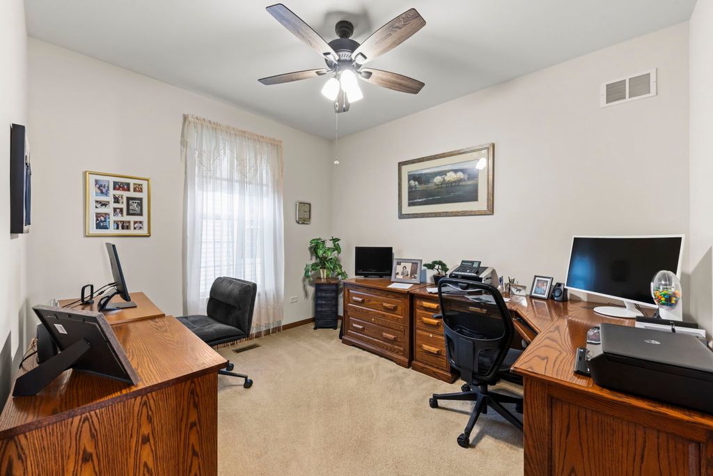 Welcome to one of the most exceptional Greenbriar models to ever hit the market-an incredibly rare dual primary suite home with a massive finished basement, ideally located within walking distance to the clubhouse and resort-style amenities in the highly sought-after Carillon Lakes 55+ community. This beautifully maintained residence offers 2 spacious primary bedrooms, 3 full baths, and a versatile den/office, along with a large separate living room, formal dining room, and an extended family room designed for both comfort and entertaining. The open-concept layout features 9-foot ceilings and abundant windows that fill the home with natural light, creating a bright and airy feel throughout. The extended family room showcases a cozy fireplace with gas starter and gas logs, while the kitchen is appointed with 42" raised panel cabinetry, stainless steel appliances, Corian countertops, a breakfast bar, and two generous pantries. The sunny eating area opens through sliding glass doors to a stunning 12' x 25' brick paver patio overlooking serene, stocked fishing lakes-an ideal setting for morning coffee or evening gatherings. The luxurious primary suite offers a spacious 15' x 17' bedroom with room for a sitting area, two closets including a large walk-in, and a private bath with double vanity, separate shower, and soaking tub. The second primary suite features a walk-in closet and private access to a full bath, perfect for guests or related living. The den can easily serve as a third bedroom, and the separate laundry room includes a full-size washer, dryer, and utility sink. What truly sets this home apart is the extraordinary 36' x 41' finished basement-complete with a full bath and an enormous storage area-making it the only Greenbriar of its kind with this amount of additional living and storage space. The home also features a 2-car attached garage with insulated and painted walls and a durable epoxy-coated floor, offering both functionality and a polished finish. Major updates include a new roof and water heater in 2020 and a new furnace and air conditioner in 2022. Residents of Carillon Lakes enjoy an 18,000-square-foot clubhouse with indoor and outdoor heated pools, hot tub, state-of-the-art fitness center, aerobics and dance studio, ballroom, hobby and game rooms, over 40 clubs, pickleball and tennis courts, bocce ball, a 3-hole golf course, three stocked lakes, scenic walking and biking paths, community garden plots, and even a separate pool and playground for visiting grandchildren-all conveniently located near shopping, dining, and major highways. This is truly a one-of-a-kind opportunity-schedule your private showing before it's gone.