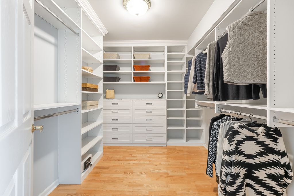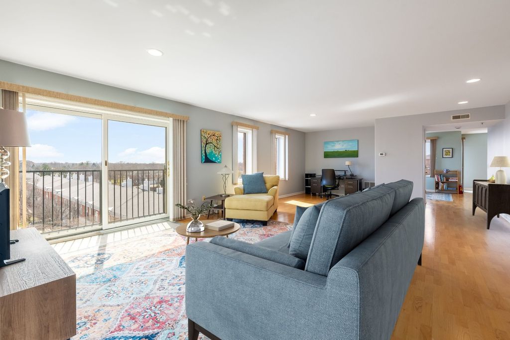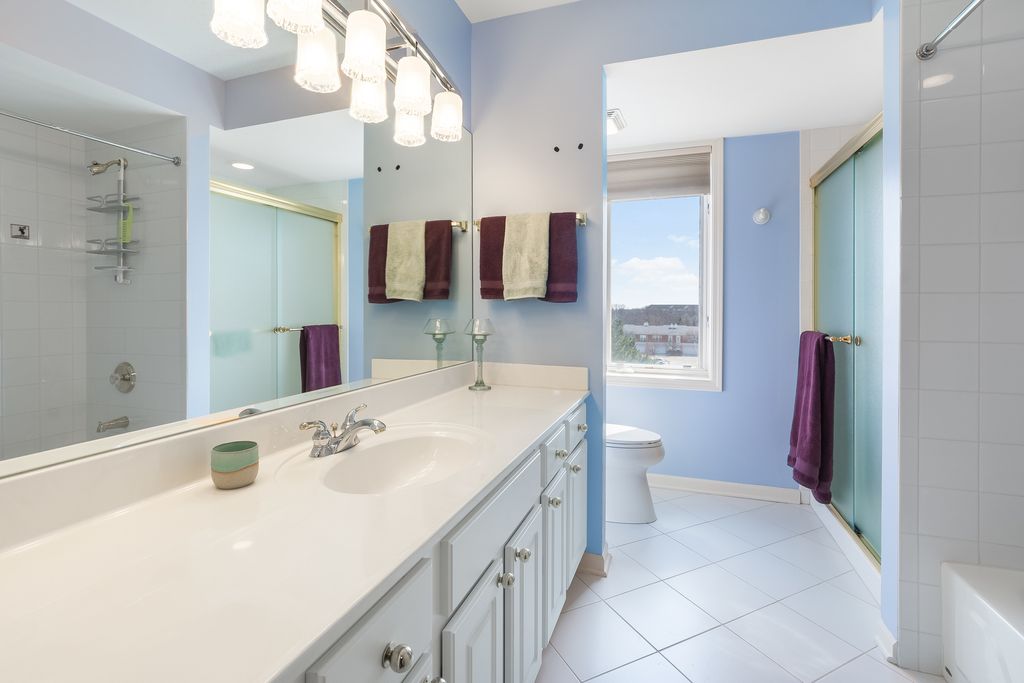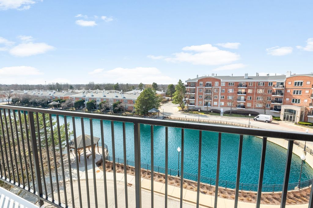 UNIQUE opportunity to enjoy combined units to give you over 3000 sq feet in Buffalo Grove. This 4 bedroom unit was made for the developer. Penthouse living with beautiful views from 3 balconies with east, south and west exposures. All hardwood floors throughout, heated floors with hot water pipes. Dual zoned heat and air conditioning. Formal foyer with skylights and new organized coat closet. Large Living room and dining room combo. Remodeled kitchen in 2015 with custom cabinetry, granite countertops, pantry and breakfast area overlooking the pond and sunny and bright balcony. Primary suite features huge his and her professionally organized closets. Spacious remodeled luxury master bath with soaker tub, double bowl vanity, custom tile and shower remodeled in 2015. Amble closet space throughout can be used for storage or office. 2 bedrooms are en suite with WIC. Custom window treatments, freshly painted, recessed lighting and more! Heated garage spot #28 with storage oversized indoor garage space large enough to park two cars. Buffalo Grove- Stevenson HS. Walk to Deerfields bakery along the path through the subdivision. Close to shops, restaurants and more. No dogs - No rentals please