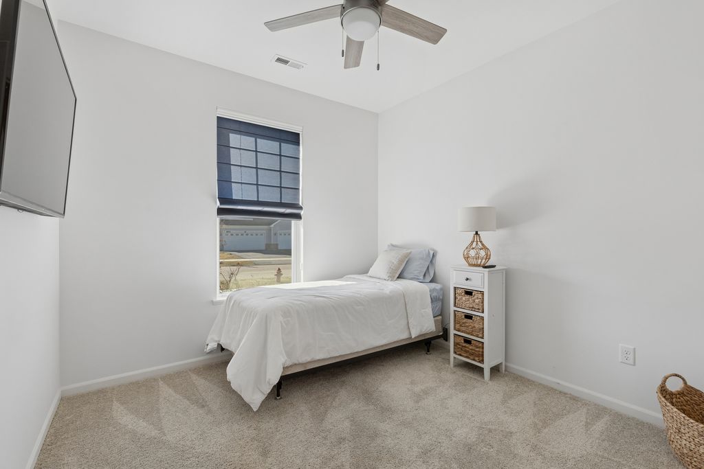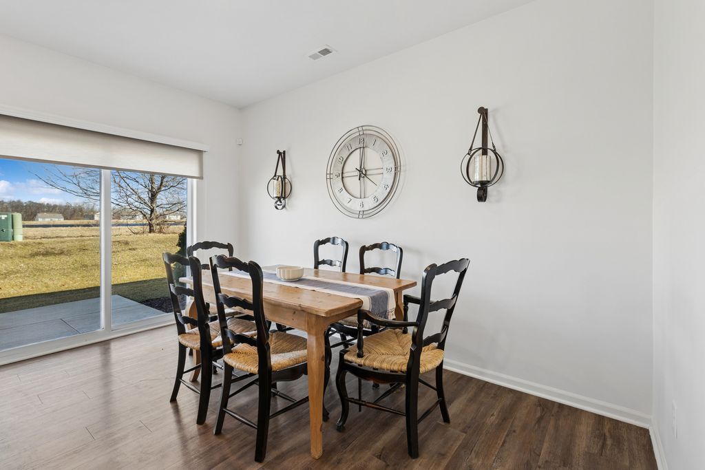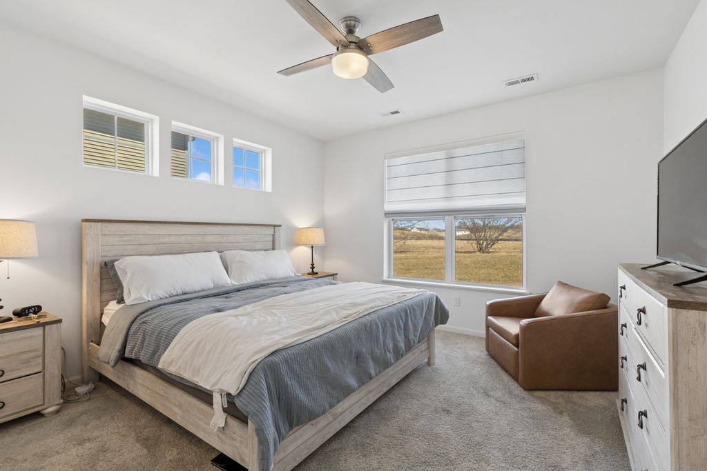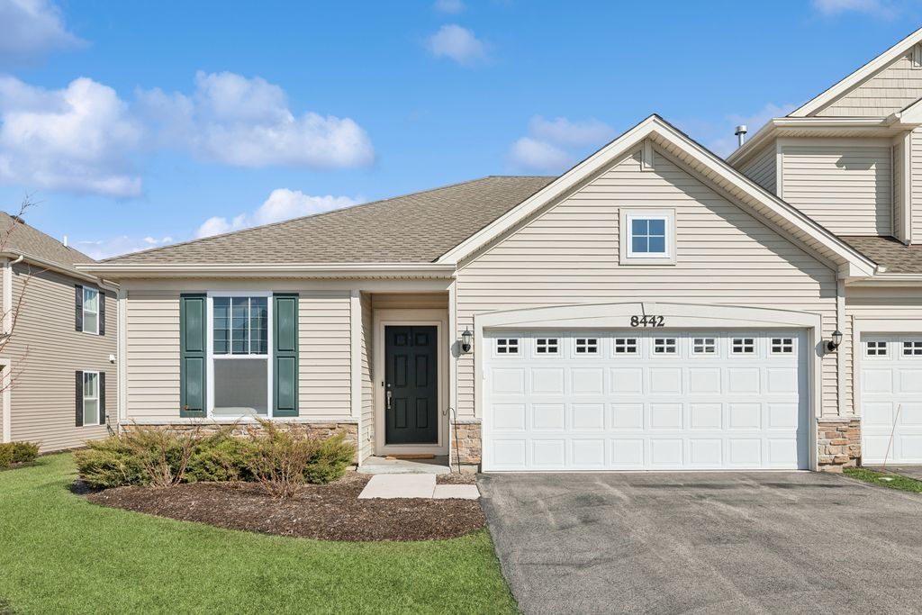 LOW MAINTENANCE LIVING WITH HIGH STYLE COMFORT AND LAKE RIGHTS! Experience stylish simplicity in this beautifully appointed 2 bedroom, 2 bathroom one story duplex located in the highly desirable Meadows of West Bay! Designed with both style and functionality in mind, this home offers a bright open concept floor plan perfect for modern living. The stunning kitchen is the heart of the home, featuring gleaming quartz countertops, stainless steel appliances, classic white cabinetry, a breakfast bar island and durable luxury vinyl plank flooring. The kitchen flows seamlessly into a spacious living area filled with abundant natural light, creating a warm and inviting atmosphere. The adjacent dining area leads to a private patio overlooking ample green space. The spacious primary suite offers a relaxing retreat with a large walk in closet and a private ensuite bath designed for comfort and convenience. The second full bathroom services guests and a light filled second bedroom. BRING YOUR KAYAK AND FISHING POLE and enjoy exclusive rights to Wonder Lake, an 816-acre private lake stretching 3.5 miles, complete with a gated boat launch, scenic Bird Island, and tranquil Lookout Point Park. Outdoor enthusiasts will also love the walking trails throughout the community, perfect for enjoying the natural beauty surrounding the neighborhood. LET YOUR HOA WORK FOR YOU! The low monthly fee covers lawn and exterior maintenance as well as snow removal and lake access! Conveniently located within a few miles from shopping, dining, and entertainment with easy access to highways, this home offers the perfect blend of peaceful community living and modern convenience. Isn't it time to make 8442 Redbud Court your next HOME SWEET HOME?! Like the furniture and decor? Most pieces are available for purchase!
