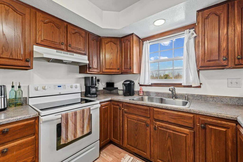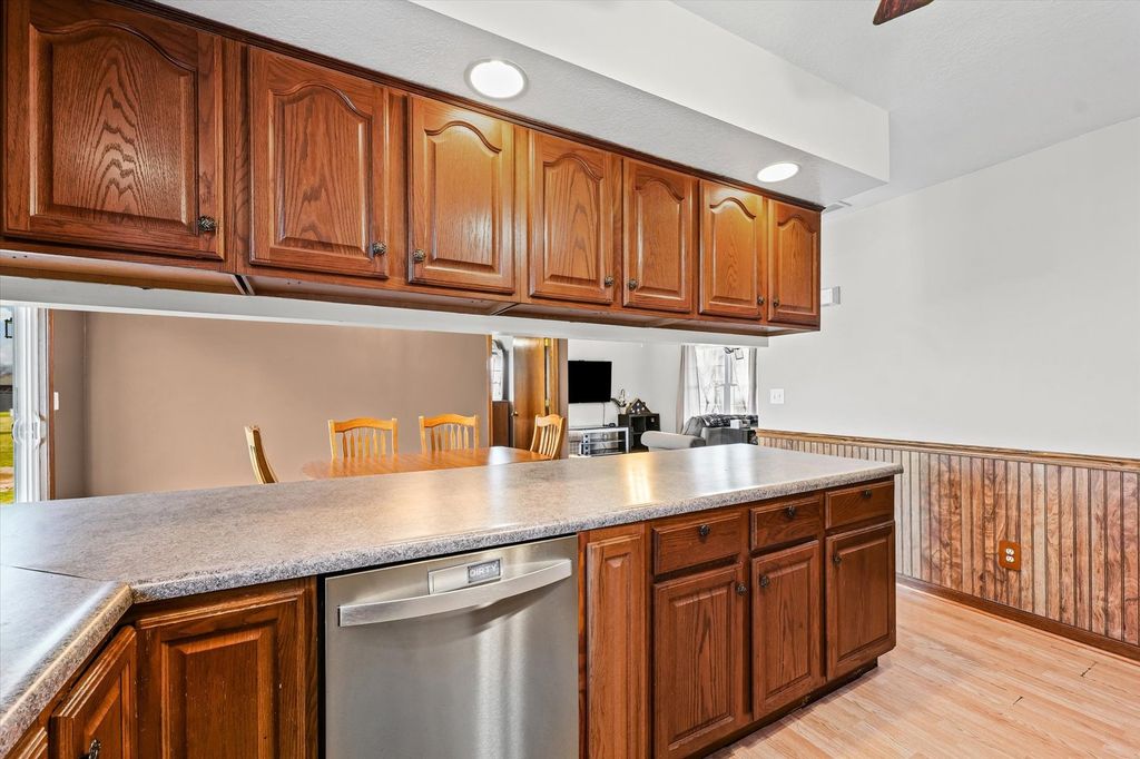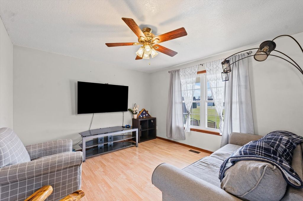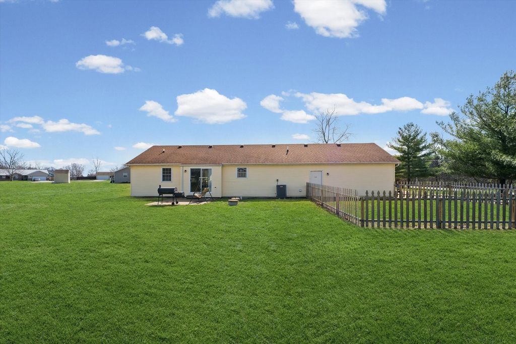 Welcome home to this inviting 3 bedroom, 2 bathroom ranch situated on a generous corner lot in a quiet small-town setting. This well maintained home offers comfortable single-level living with plenty of space both inside and out. Step inside to find a bright open living and dining room that flows seamlessly into the kitchen, creating an ideal layout for everyday living and entertaining. The home features three bedrooms, including a primary suite with a private en-suite bathroom. The hall bathroom has been recently updated, adding modern style and convenience for family and guests. Additional highlights include a laundry/mudroom that is the perfect drop zone for coats, shoes, and gear. Outside, enjoy peaceful mornings on the welcoming front porch or relax in the backyard on the back patio overlooking the large lot. The partially fenced yard offers space for pets, gardening, or outdoor gatherings. A standout feature is the attached 3-car garage, providing plenty of room for vehicles, hobbies, and extra storage. A long and spacious driveway provides plenty of parking. If you're looking for small-town charm, space to spread out, and the ease of ranch-style living, this home is a must-see!