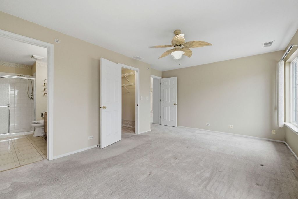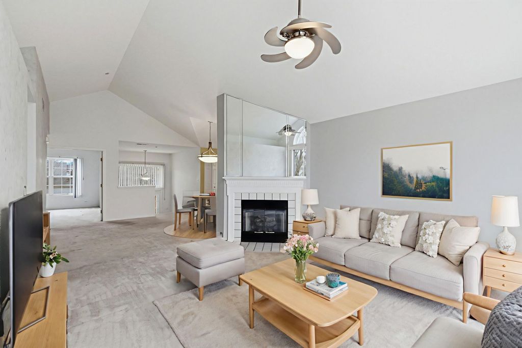 Welcome to this beautifully cared for 3 bedroom, 2 bath condo in the desirable Fairfax Commons community of Bartlett with beautiful pond view. From the moment you step inside, you're greeted by a spacious foyer and an open concept layout designed for both comfort and functionality. Soaring cathedral ceilings and abundant natural light create a bright, airy feel throughout the main living space. The kitchen opens effortlessly to the dining area and family room, making entertaining easy and everyday living seamless. It features all stainless steel appliances, including a new stove (2025), microwave (2025) and refrigerator (2023). Family room is anchored by a cozy gas fireplace and features large sliding glass doors with custom automatic window treatments, leading to an oversized balcony, the perfect spot to unwind. The primary suite offers a generous walk-in closet, double-sink vanity, and a separate shower for added privacy. A second bedroom with vaulted ceilings, and spacious third bedroom are close to the full guest bath with a soaking tub that provides comfortable accommodations for family or visitors. You'll also appreciate the separate laundry room with washer and dryer included, plus additional storage space. A rare 2 1/2 car garage adds even more convenience. The HOA takes care of exterior maintenance including the roof, painting, sprinklers, pond, landscaping, salting and snow removal, offering truly low-maintenance living. The HOA also allows rentals, providing flexibility for homeowners and added investment potential. Ideally located near shopping, parks, and the Metra, this home combines comfort and convenience in one incredible package.