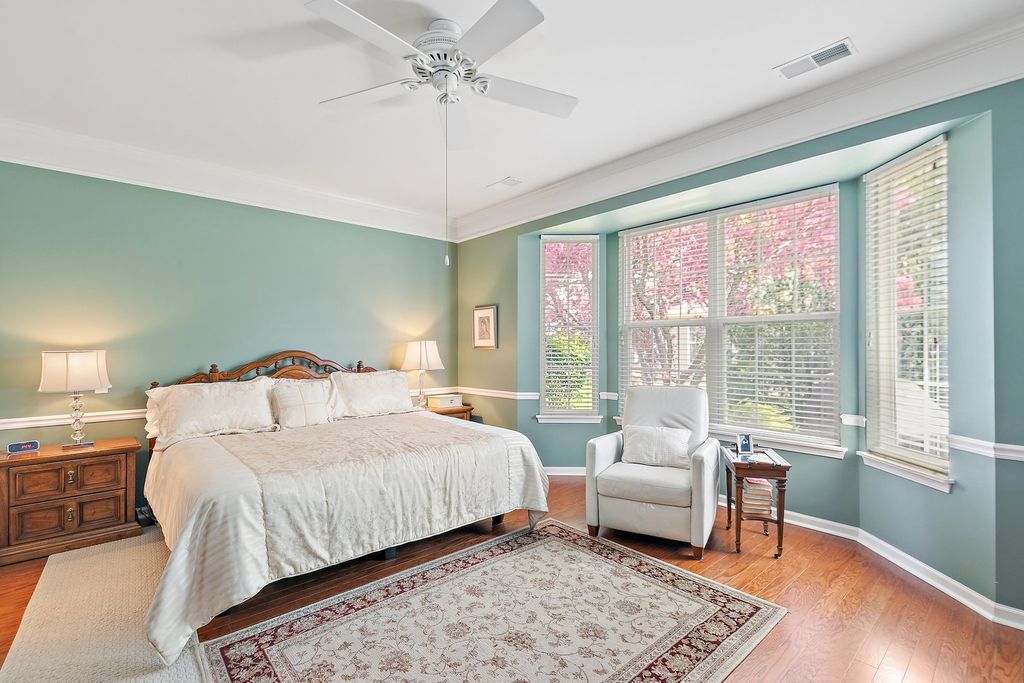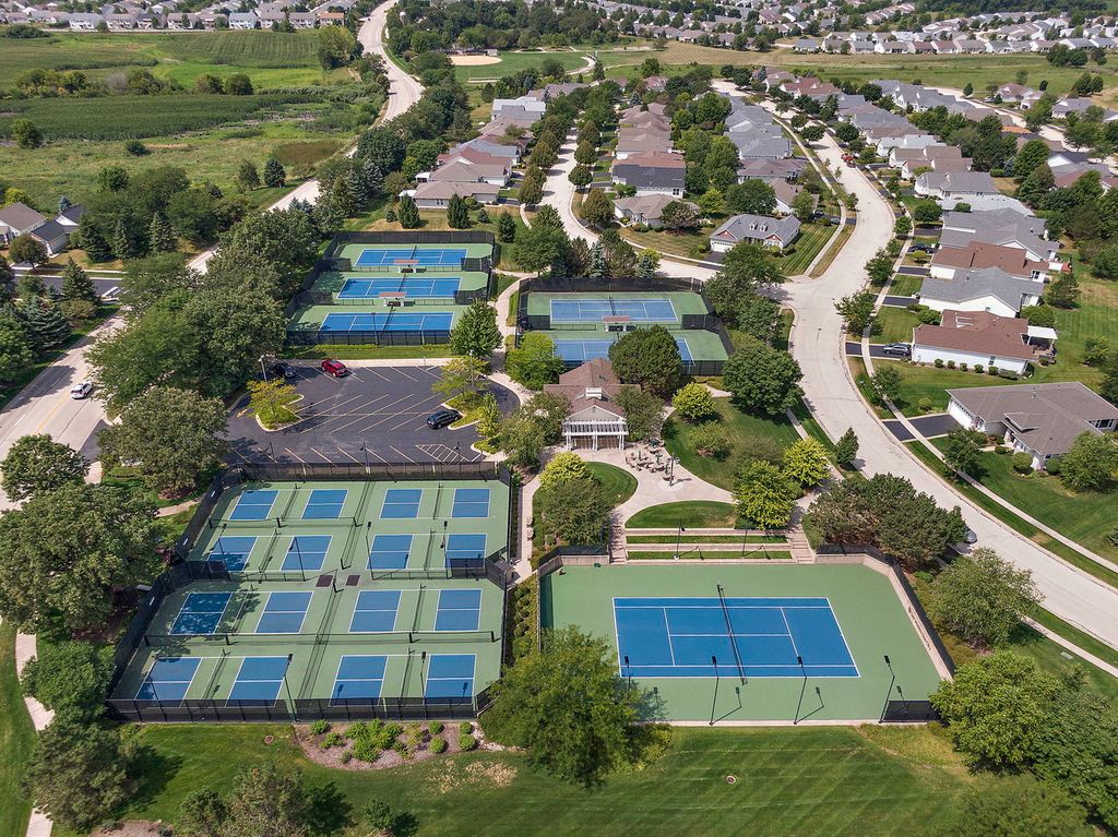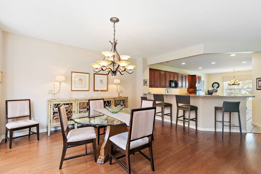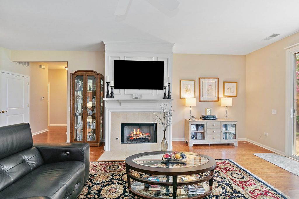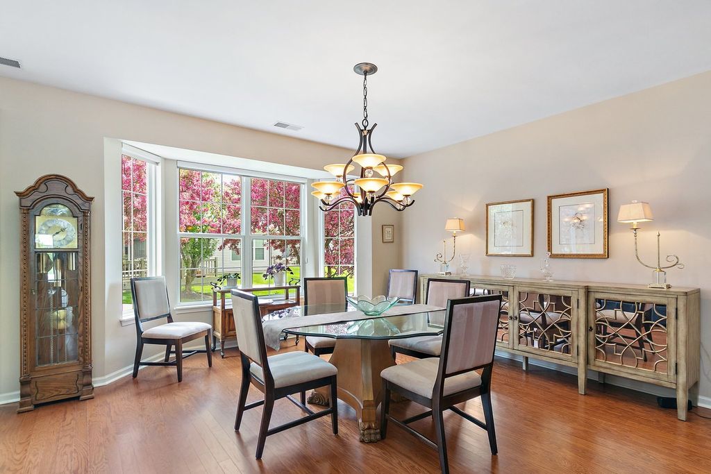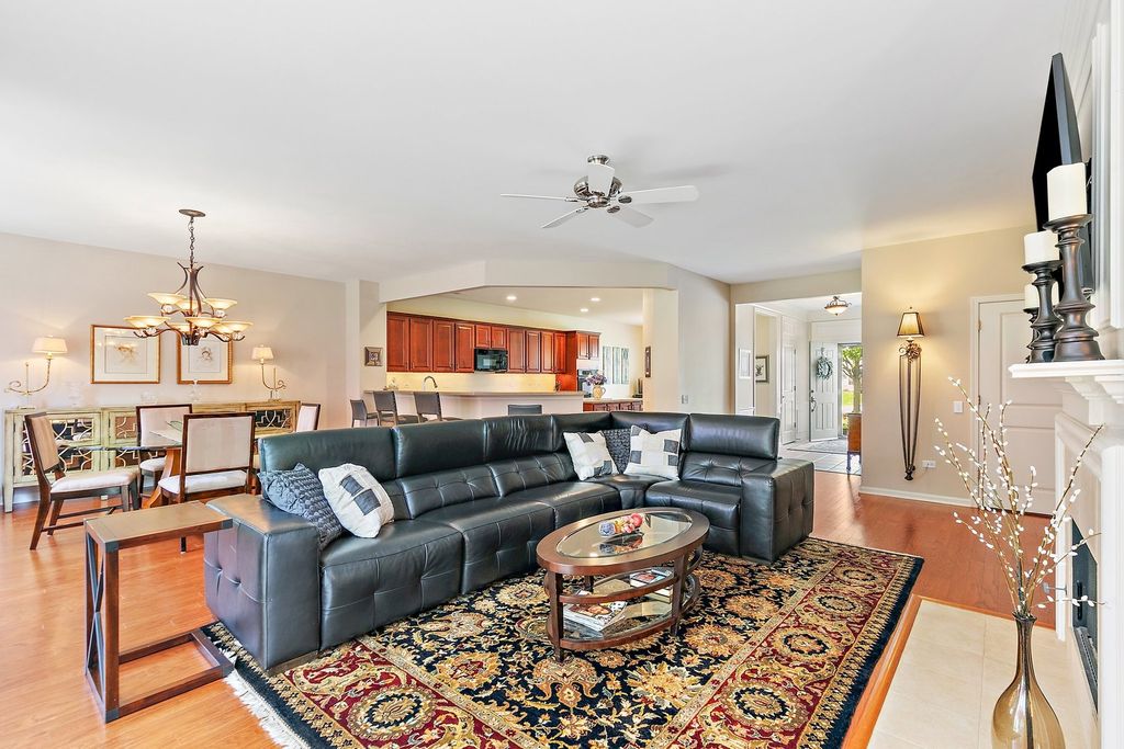 Grant Model in Del Webb on beautiful lot with two bedrooms plus a den and two full bathrooms. Walk into this open floor plan with tons of natural light. The living room has hardwood floors with a fireplace with a gas start and gas insert and sliding doors to the patio. The separate dining room is perfect for entertaining. The spacious kitchen offers a center island with storage, stainless steel appliances, pantry closet, breakfast bar seating, eating area, and desk. The den has additional living space with hardwood floors and grass cloth wallpaper. The primary suite boasts hardwood floors, walk in closet and primary bathroom with whirlpool tub, double sink and separate shower. There is a second bedroom with large walk-in closet. The laundry room has front loader washer and dryer (2024), utility sink and storage. The backyard is a stunning retreat with a brick paver patio and beautiful landscaping and sprinkler system. Two car attached extended garage. The roof is approximately 7 years old.