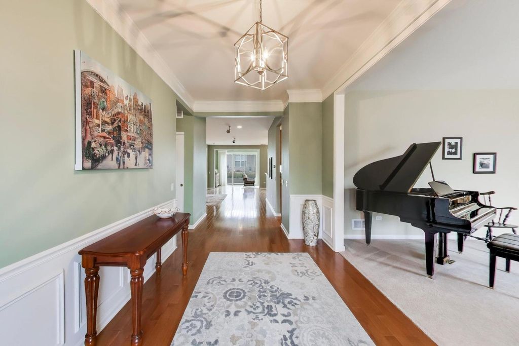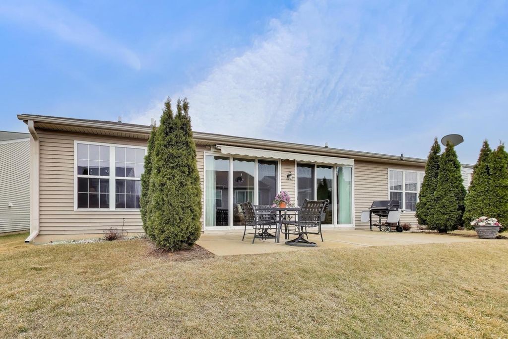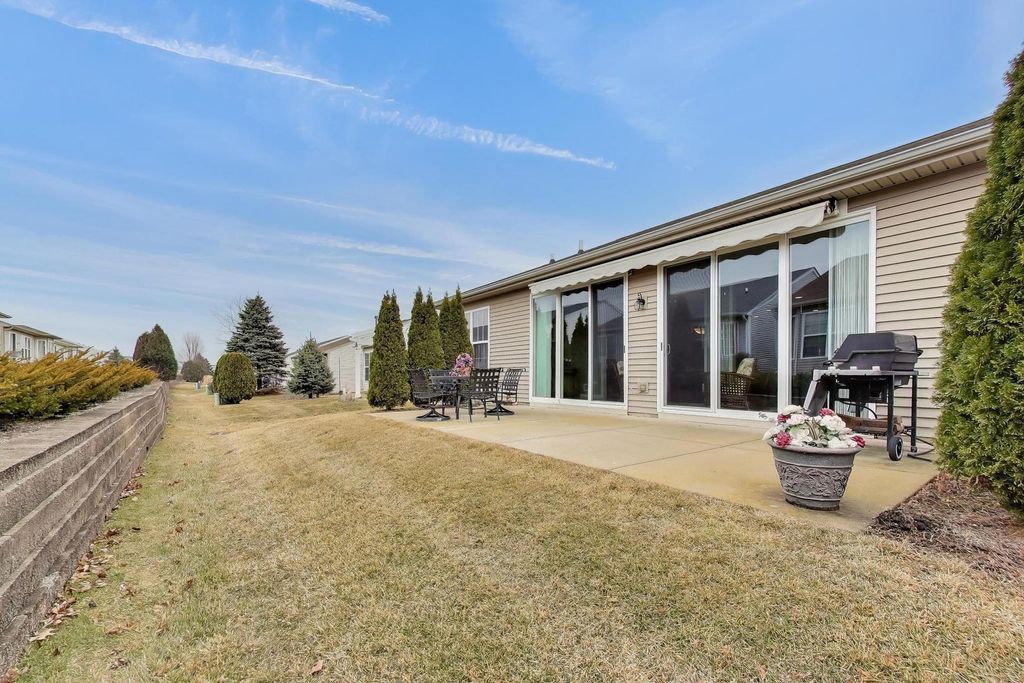 Rare opportunity to own a beautiful Buckingham model in the highly sought-after 55+ community of Sun City Del Webb in Huntley! Boasting 2,758 sq ft, this spacious home features 3 bedrooms and 3 full bathrooms and impressive curb appeal with brick and vinyl siding and an architectural shingled roof. Step through the elegant front door, with leaded glass window and sidelights into an impressive foyer featuring crown molding, wainscoting, gleaming hardwood floors, and a coat closet. The large kitchen offers an abundance of oak cabinetry with pull-outs, Silestone countertops, planning desk, under-cabinet lighting, breakfast bar, and center island. Stainless steel appliances include Maytag refrigerator, GE Profile double oven, KitchenAid cooktop and dishwasher, and Samsung microwave. This home offers a separate dining room and a spacious living room with fireplace. The family room features hardwood flooring, recessed lighting, and an open-concept design flowing into a sunroom-style sitting area. Spectacular natural light fills the sitting area with wall-to-wall sliding glass doors leading to a large concrete patio complete with a retractable awning and gas line hookup for a grill, perfect for outdoor entertaining. The primary suite is generously sized with crown molding and a large walk-in closet. The luxury ensuite bathroom features a ceramic tile step-in shower, soaking tub, double vanity, and oak cabinetry. The luxury primary bath includes ceramic tile step-in shower, soaking tub, double vanity, and oak cabinetry. Additional highlights include 2-panel hardwood doors, ceiling fans, recessed lighting, beautiful paint palette, high-quality easy-clean windows, wood slat blinds, custom valances and curtains, and a large 2-car garage with epoxy floor. The laundry room features cabinetry, stainless steel sink, and LG washer and dryer. Residents enjoy resort-style living with exceptional amenities including three pools, pickleball, tennis, bocce, softball field, woodshop, two fitness centers, walking trails, fitness classes, on-site dining, nature park with catch-and-release fishing pond, and an 18-hole golf course. Meticulously maintained and move-in ready.
