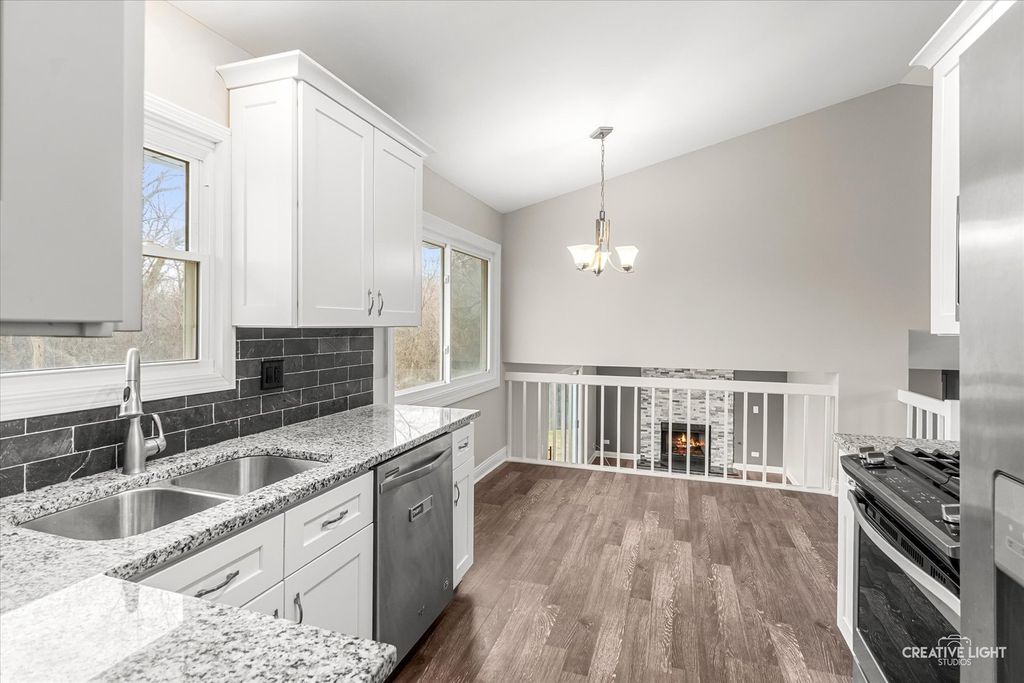 GORGEOUS, UPDATED, FRESHLY PAINTED 4BD, 2.5BA SPLIT LEVEL HOME READY TO MOVE IN!! This fantastic property features plenty of living space with 3 levels, modern kitchen, finished walkout basement, and almost 1/2 acre land! The beautiful kitchen showcases a slate backsplash, ss appliances, and eat-in table area. Fully updated bathrooms including stunning basketweave tile in the primary bath and waterfall marble tile walk in shower. There is an eye-catching floor to ceiling stone fireplace in the family room, a huge laundry room with laundry tub, and 2 walkout slider doors to patios! Hard wired security system just requires a monitor. New garbage disposal, 2025 Hot Water Heater, and 2022 Furnace and A/C. Minutes from I-90, schools, and everything along Rt. 59!