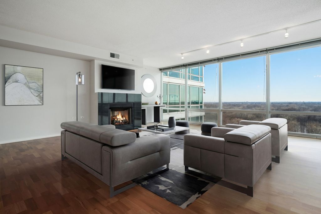 Nestled high among the treetops of Harms Woods, this rarely available west-facing corner residence offers 3 bedrooms and 2 bathrooms in the coveted Maple Tower at Optima Old Orchard Woods. Sprawling 8ft floor-to-ceiling windows frame sweeping, unobstructed forest views, filling the home with natural light and a sense of calm. The expansive open concept living and dining areas flow effortlessly onto a private 12' x 5' balcony, ideal for entertaining, grilling, or simply enjoying sunset views. The chef-inspired kitchen is beautifully appointed with 42" cabinetry, granite countertops with full-slab backsplash, an oversized 9ft long peninsula with breakfast bar, and premium stainless-steel appliances. The primary suite is a serene retreat, featuring two organized closets and a spa-inspired en-suite bath. Both bathrooms are luxuriously finished with oversized vanities, furniture-grade cabinetry, honed granite counters, Kohler under-mount sinks, frameless glass walk-in shower, a deep soaking jetted tub, and porcelain tile surround and flooring. The second bedroom offers a walk-in closet and neutral carpeting. The generously sized third bedroom offers a spacious closet and can also be used as a home office. Additional features and updates: Hardwood flooring, freshly painted throughout, new lighting fixtures, newer appliances, in-unit laundry and storage. Price includes: 2 indoor, heated parking spaces. Residents enjoy an exceptional array of amenities, including a year-round glass-enclosed indoor pool, hot tubs, state-of-the-art fitness center, tennis court, picnic and BBQ areas, indoor guest parking, EV charging stations, a newly constructed receiving room, valet dry-cleaning services, and a fully renovated, expansive party room. Unbeatable A+ location! Steps from Old Orchard Mall, Lifetime Fitness, restaurants, and the North Shore Medical Building, with convenient access to schools, public transportation, and major expressways.