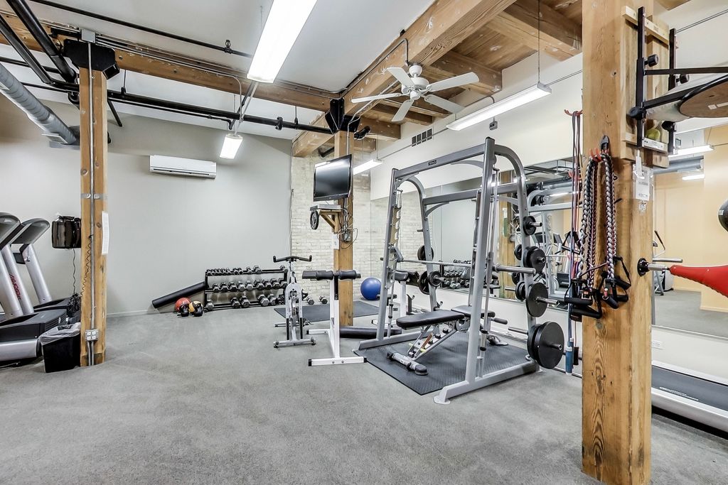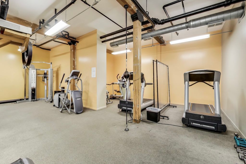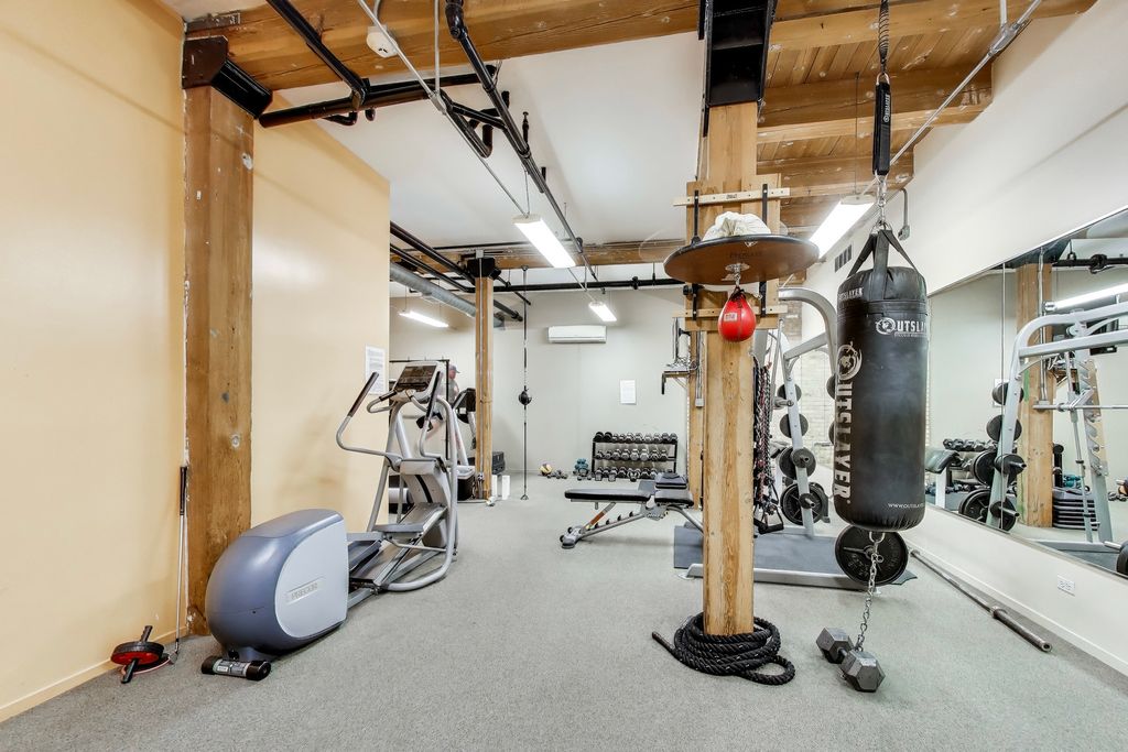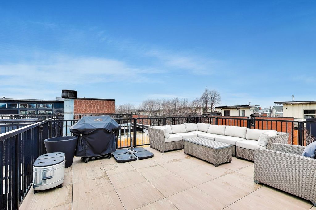 Rarely available true penthouse loft in the highly sought-after Willow Square in the heart of Bucktown. This top-floor corner residence offers over 1,200 square feet of authentic loft living with soaring ceilings, exposed brick and timber beams, and incredible natural light from oversized windows. The spacious layout features a large primary bedroom plus a generous den ideal for a dedicated home office. The open-concept living and dining area flows into an expansive kitchen with abundant cabinetry and counter space, perfect for entertaining. Side-by-side in-unit washer/dryer, walk-in closet, heated bathroom floors, and thoughtful updates throughout. A striking internal wrought-iron spiral staircase leads to your private roof deck (new in 2023) with unobstructed skyline views - a true extension of the living space and ideal for summer entertaining. Additional highlights include elevator access, fitness center, bike storage, large private walk-in storage unit, gated parking included, and guest parking available. Quiet, well-maintained building just steps from the 606 Trail, surrounded by some of Bucktown's best restaurants and shops. Five-minute walk to the Blue Line and quick access to I-90/94. A rare opportunity to own a true loft penthouse with private rooftop space in one of Chicago's most walkable neighborhoods.