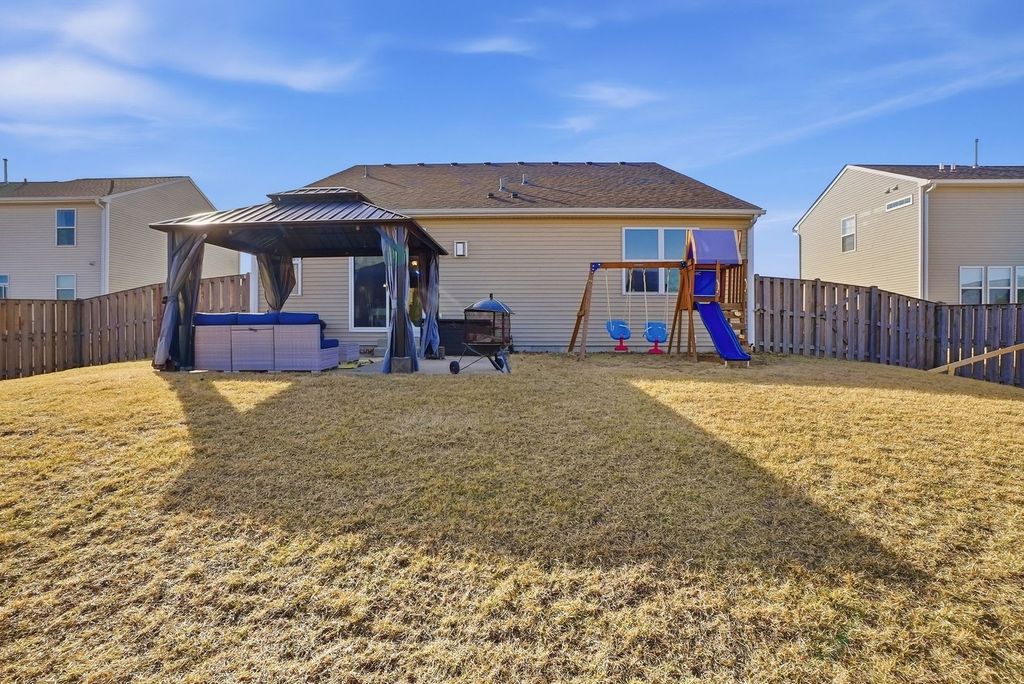 A home with built-in fun and opportunity to grow, situated in a clubhouse community with an unbeatable location backing the school, and near restaurants, downtown Yorkville, and the well-loved Raging Waves Waterpark! A spacious spot for everyone, this home features a versatile floor plan with three bedrooms plus an office! Updated with beautiful wood flooring running the main areas of the home, you'll also find the volume ceilings connecting the kitchen and family room add to its appeal. The kitchen with plenty of cabinetry, counterspace, and a pantry connects to the family room, complete with a fireplace by the breakfast/dining area. Primary bedroom with tall tray ceiling, attached private bath, and walk-in closet! Two additional well sized bedrooms are near the secondary full bathroom. An extra-wide and open staircase takes you to the basement where your ideas and finishing touches will create another level of living! Your new home is located just steps away from the community park, clubhouse/fitness center, and community pool. Convenience is key, and you can rest assured, a perfect on-time record having the Bristol Bay Elementary School located just beyond your fully fenced-in yard. Minutes from Raging Waves Water Park, downtown Yorkville, the Fox River area, Bicentennial Riverfront Walk, Marge Cline Whitewater Course, restaurants, shopping and more!! FUN is just outside your front door!!