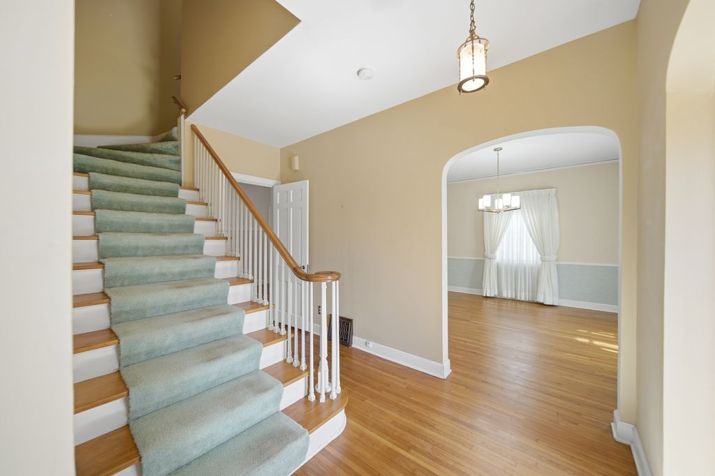 Classic 2 story home with river views, foyer features a beautiful staircase, large living room with wood burning fireplace, formal dining room, kitchen has quartz countertops with nice cabinets and appliances, den on main floor could be a 4th bedroom. Natural hardwood floors in most rooms and under carpet. Floored walk up attic- could be finished. 3 season porch off the back, blacktop driveway and 2 car garage.