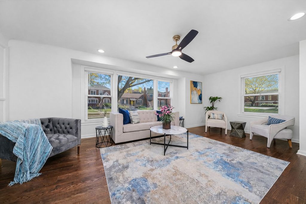 Solid brick & stone traditional home reimagined with a fresh contemporary style! Step into a light filled, open concept floor plan, highlighted with crisp white trim work, custom millwork and new warm hardwood floors throughout. The first floor combines a large LR separated by a centrally located staircase with a DR that flows seamlessly into the impressive kitchen and outdoor deck. The striking kitchen has white custom cabinets with gold fixtures, contrasted with a dramatic dark island with comfortable seating for 4, and topped with sleek marble countertops. New stainless steel appliances, a walk-in pantry closet and a convenient 1/2 bath, all make for effortless everyday living and entertaining. Up the staircase to three oversized bedrooms and 2 full bathrooms. The primary bedroom is a relaxing retreat with a sophisticated en suite that includes a double vanity, deep soaking tub and separate shower. There is also a spacious walk-in closet with organized shelving. The fully finished basement expands your living space with an inviting family room, a 4th bedroom or office and 3rd full bath. There is also access to the backyard and a separate area for the W&D. There is a lovely backyard with a large grassy area and a new 2-car garage. This move-in ready home is the perfect blend of style, comfort and convenience. Fabulous Edgebrook location, within walking distance to the Billy Caldwell golf course, Metra, Edgebrook School, shops, restaurants and scenic trails. Schedule your appointment today, this updated home truly checks every box!