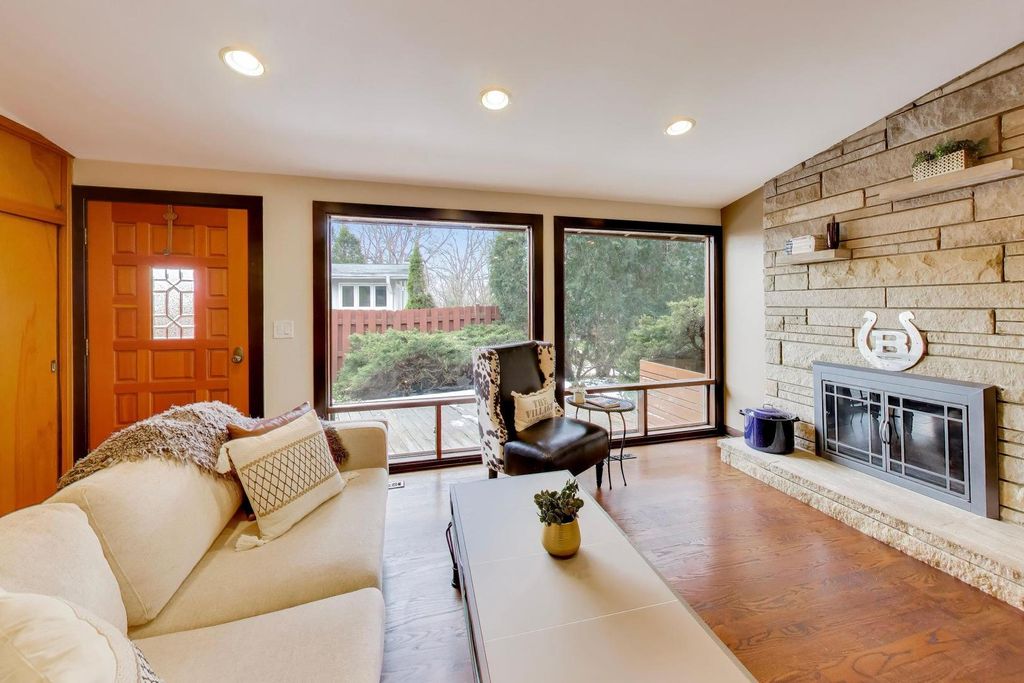Walk to downtown Barrington from this stunning and architecturally unique ranch with soaring volume ceilings, hardwood floors throughout, and a rare three and a half-car heated garage. Nestled just moments from downtown Barrington, this truly one-of-a-kind ranch blends architectural character with everyday comfort. Inspired by the timeless design principles of Frank Lloyd Wright, the home features dramatic volume ceilings and striking architectural details in every room, creating an open and light-filled living experience that feels both sophisticated and inviting. At the heart of the home is an expansive gathering space that includes the kitchen, living room with a fireplace, dining space for a large table, and bar blend seamlessly together creating a warm and inviting space designed for both everyday living and memorable gatherings. Large windows and doors open to an expansive deck and overlook the backyard, extending the living space outdoors. In addition, there is a recently expanded cozy family room that offers additional living space and a huge storage closet. Beautiful hardwood floors run throughout the home, solid wood oak doors complemented by rich wood shiplap accents that add warmth and texture to the inspired designed spaces. The layout offers four bedrooms and two full baths, with each room showcasing its own distinctive ceiling lines and design elements that make this home unlike anything else on the market. A beautifully landscaped backyard with mature trees creates a private serene setting, while the expansive wraparound deck invites outdoor dining, relaxing and entertaining. For storage, the oversized 3.5-car garage has floor to ceiling racking and overhead space for more storage, and built in sheds for lawn equipment. There is an abundance of exceptional storage and flexibility rarely found in homes like this. This home is set on a quiet, low-traffic street in a peaceful neighborhood where residents enjoy nearby parks, schools, outdoor recreation and activities. Attends Hough Street Elementary School, Barrington Middle School Prairie Campus and Barrington High School. 2022 New HVAC & Roof, 2020 Gutters, 2017 Hot Water Heater