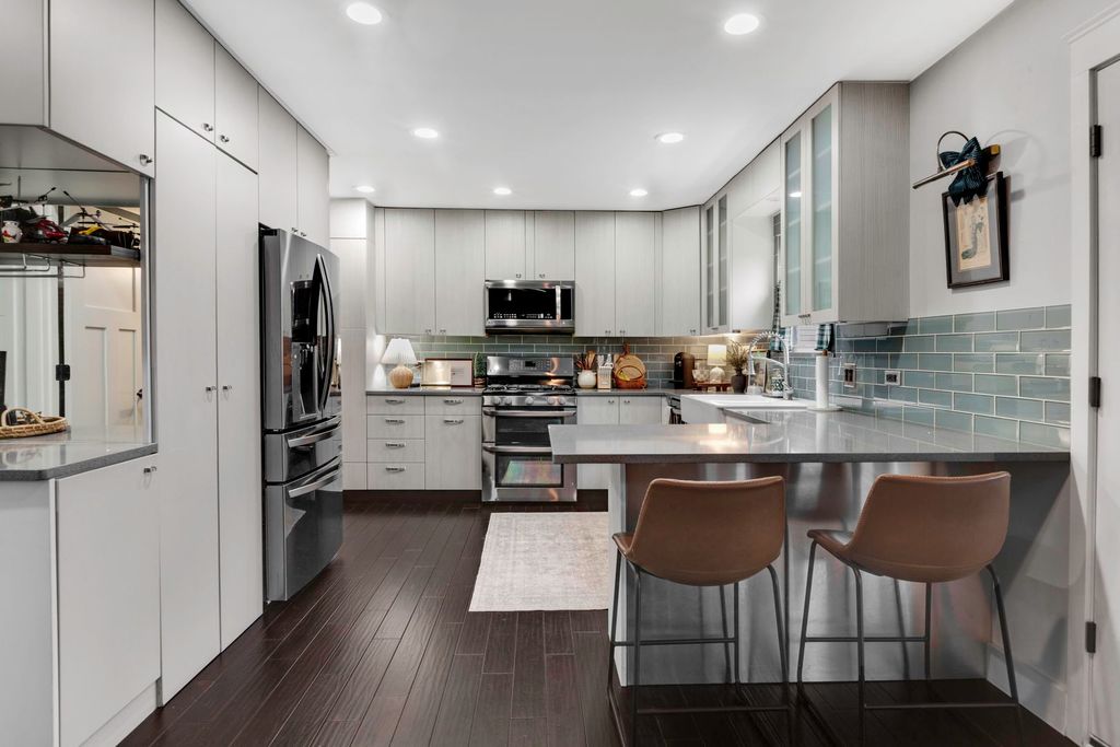 Stunningly renovated home in the sought-after Heatherwood subdivision, offering a Lake Villa address with access to highly rated schools in Grayslake, Illinois and lower property taxes. From the moment you arrive, the home stands out with exceptional curb appeal featuring cement Hardie board and vinyl siding, a brick paver driveway, and beautifully designed Unilock hardscaping with brick and stone retaining walls. Step inside to find wide plank solid hardwood floors, elegant 6-inch baseboards, and contemporary solid wood doors with Buster + Punch hardware throughout the main level, staircase, and upper hallway. The custom kitchen is truly the heart of the home, showcasing award-winning Crystal cabinetry with soft-close features, quartz countertops, tiled backsplash, under-cabinet lighting, apron-front sink, and LG black stainless steel appliances. A stylish built-in mini bar with wine storage and concealed stacked washer and dryer add both convenience and thoughtful design. The spacious family room features vaulted ceilings, skylight, oversized modern fan, and a cozy wood-burning fireplace, while Pella French doors lead to a large enclosed porch perfect for relaxing or entertaining. The backyard is designed for enjoyment with a 7-person Sundance Kingston hot tub under a pergola, a wide fenced yard, and direct access to community volleyball and playground areas. Upstairs offers three generously sized bedrooms including a vaulted primary suite with walk-in closet. The beautifully updated full bathroom delivers a spa-like feel with a floating vanity, freestanding soaking tub, and an impressive walk-in shower. Additional highlights include recent updates within the past five years, a new air conditioner, water heater (2021), roof (2014), and abundant attic storage above the garage with pull-down ladder. No HOA.