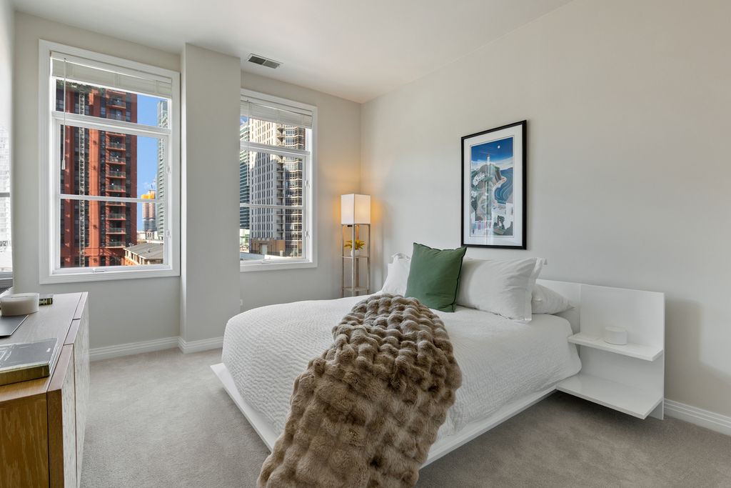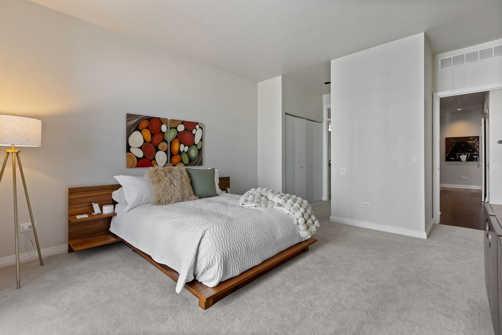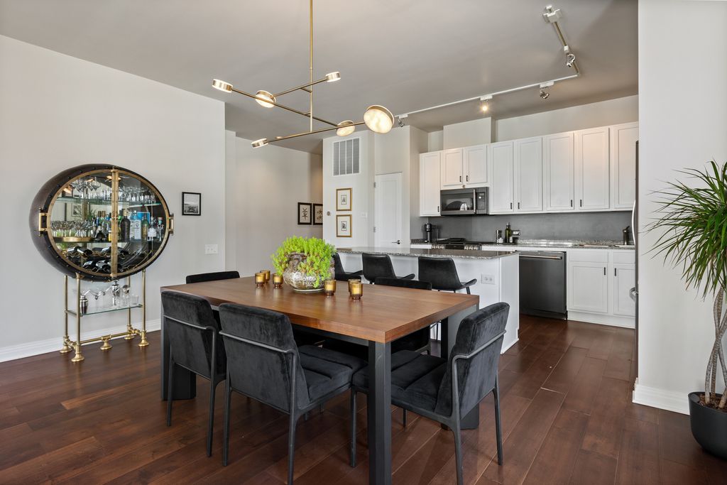 Spacious 2 bedroom 2 bath corner unit in the West Loop with heated garage parking included! This upgraded condo is flooded with natural light and has upgraded hardwood flooring, recently updated appliances, new washer/dryer, designer chandelier, custom doors, and your own private balcony. Desirable open floor plan with numerous windows, spacious split bedrooms, two full bathrooms and extra storage spaces with custom shelving throughout the unit. Large chef's kitchen with pantry and large island. The primary suite features two large closets and a spa-like luxury soaking tub, separate shower, and double marble vanity. This boutique elevator building has an attached garage and an extra storage locker. Incredible location near Fulton Market, Randolph and Madison with easy access to the West Loop's finest restaurants and shopping as well as multiple grocery stores and transportation options (CTA and Metra). Option to have furniture included in the sale! Attached garage parking and storage cage included in the price.