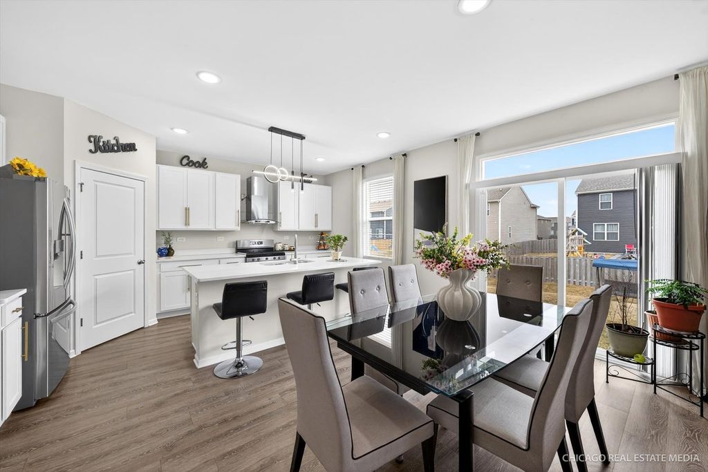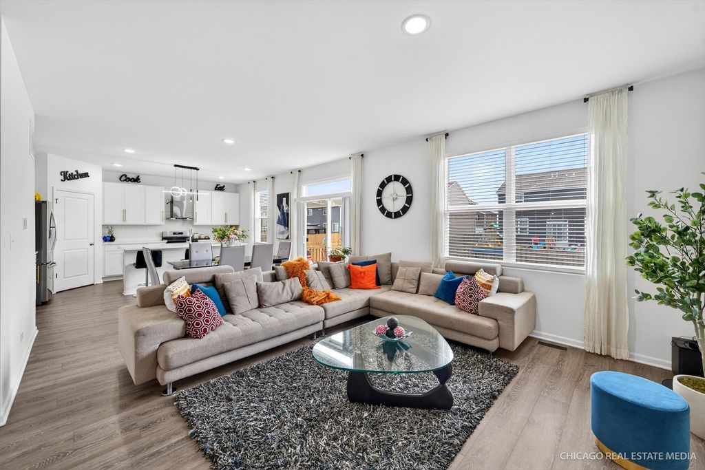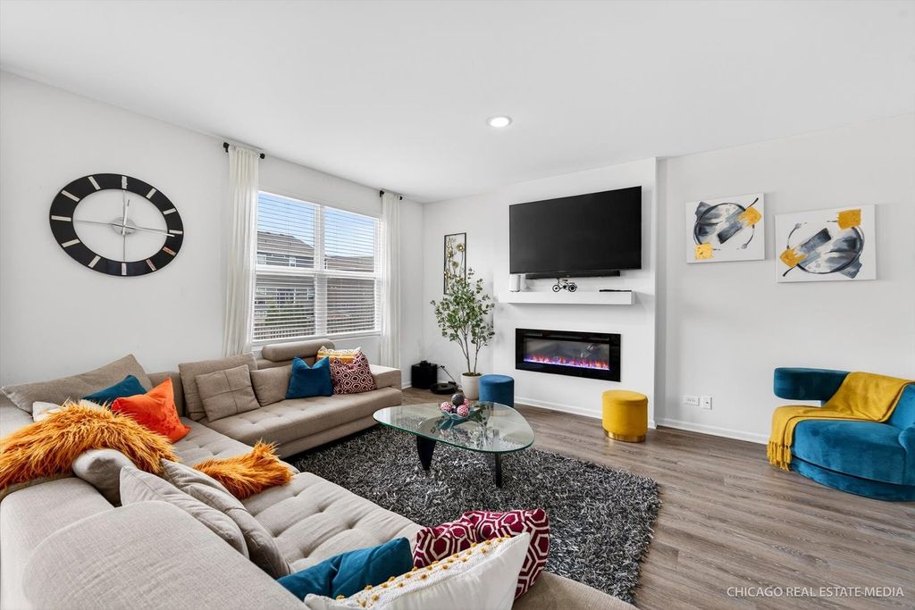 Welcome to this gorgeous 4-bedroom, 2.5-bathroom 'Holcombe' model in the sought-after Parkside at Cambridge Lakes. This home features 9' ceilings and luxury vinyl plank flooring throughout the entire residence. The main level offers a bright, open-concept layout connecting the living area to a family room anchored by an electric fireplace. The gourmet kitchen is a chef's dream, boasting 42" shaker cabinets, quartz countertops, stainless steel appliances, and a sleek stainless-steel hood. A large walk-in pantry provides ample storage, while the adjacent dining area opens to a spacious, fully fenced backyard-an outdoor oasis featuring a storage shed and plenty of space for a lush garden or vegetable planting. The second floor serves as a true retreat, boasting a grand primary suite with a dual-vanity bath and an oversized walk-in closet. Three secondary bedrooms offer plenty of space, while the dedicated laundry room with tankless water heater adds a practical, modern touch. The insulated full basement provides a blank canvas for your finishing touches. The two-car garage features a dedicated 240V Level 2 EV-ready outlet-perfect for rapid charging; simply plug in your personal charging cable and go! (Note: Tesla Wall Connector hardware is not included). Experience the premier lifestyle at Parkside at Cambridge Lakes, where residents enjoy a clubhouse, fitness center, gym, indoor soccer and volleyball courts, lounge plus outdoor recreation like swimming pools, baseball & soccer fields, parks, ponds, and scenic trails. This home offers easy access to major highways, shopping, dining, and the famous Goebbert's Pumpkin Farm! Schedule your showing today-this one won't last!
